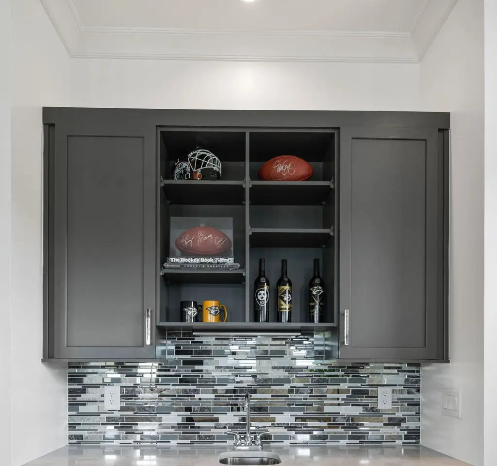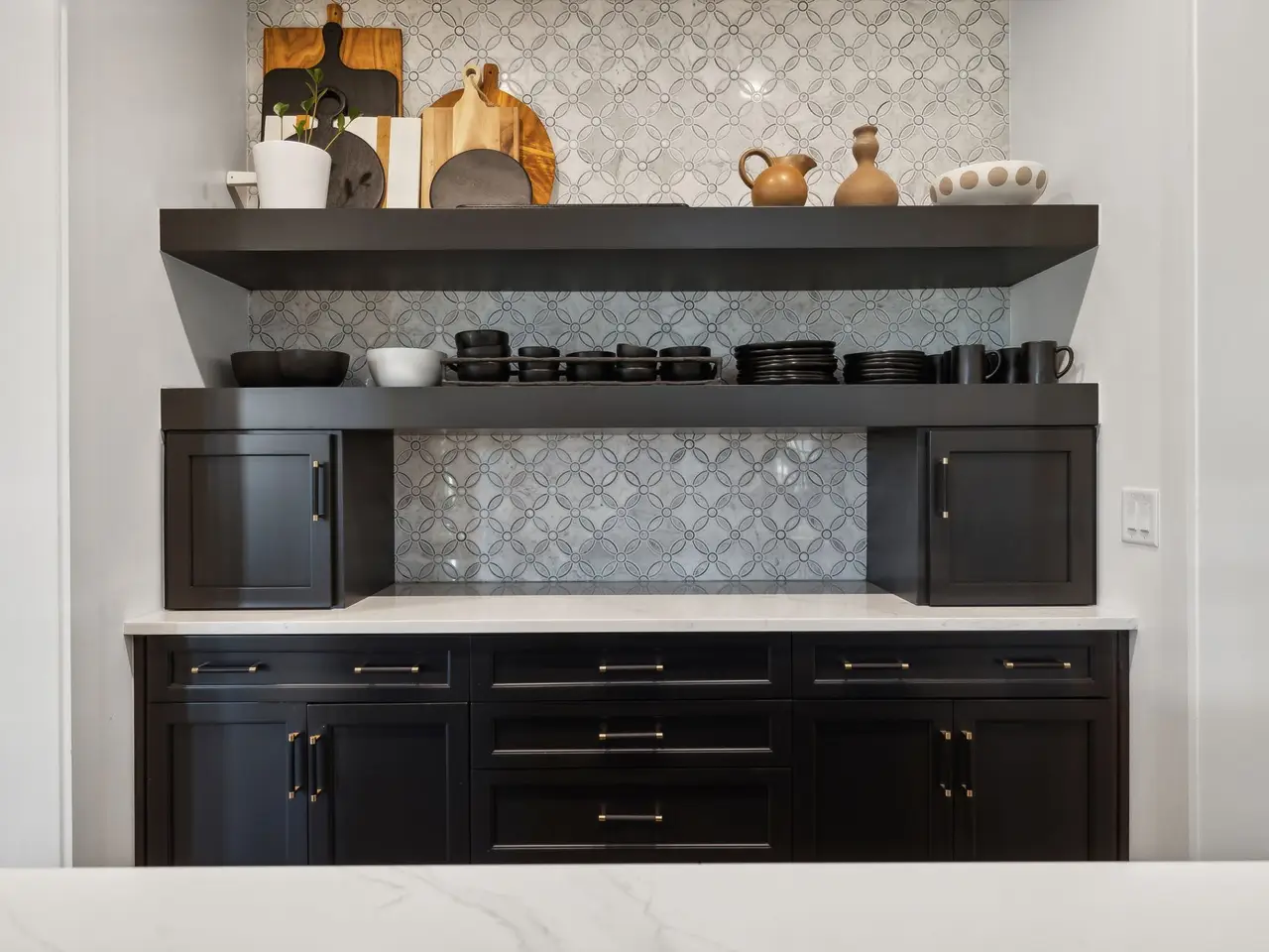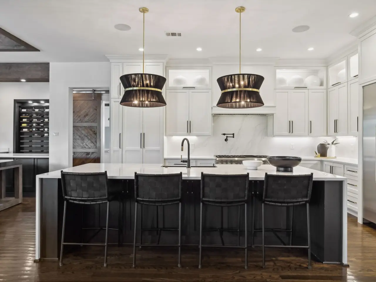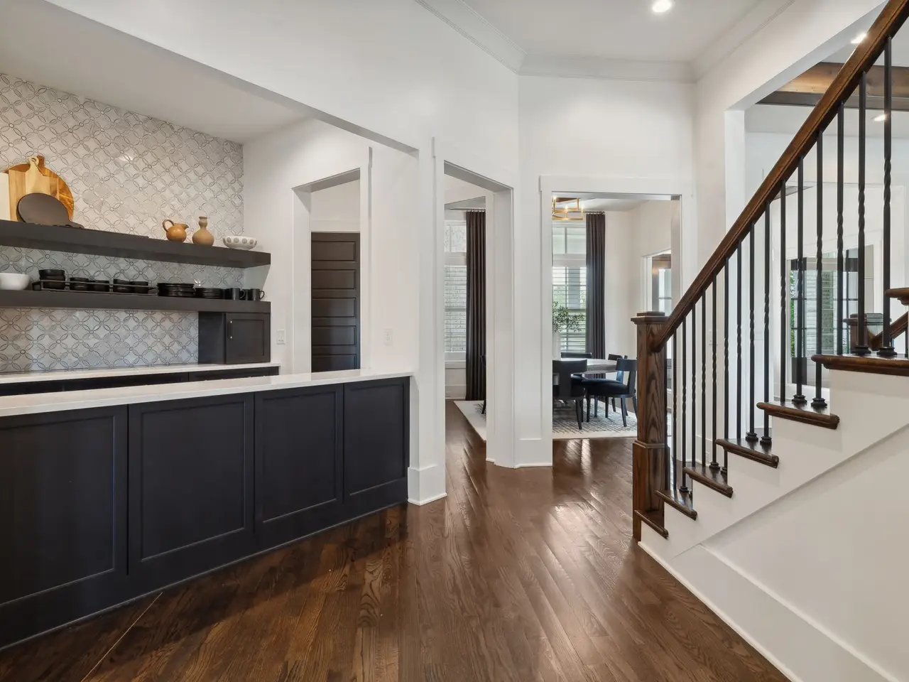Step inside to an open-concept living room with floor-to-ceiling tile fireplace, gas logs, and expansive golf course views. The gourmet chef's kitchen is a centerpiece, boasting a quartz waterfall island, stainless steel appliances, ceiling-height custom cabinetry, pot filler, under-cabinet lighting, and hidden walk-in pantry. A second living area with wood-accented tray ceiling flows into a designer wet bar with wine display and dual beverage coolers--ideal for entertaining.
