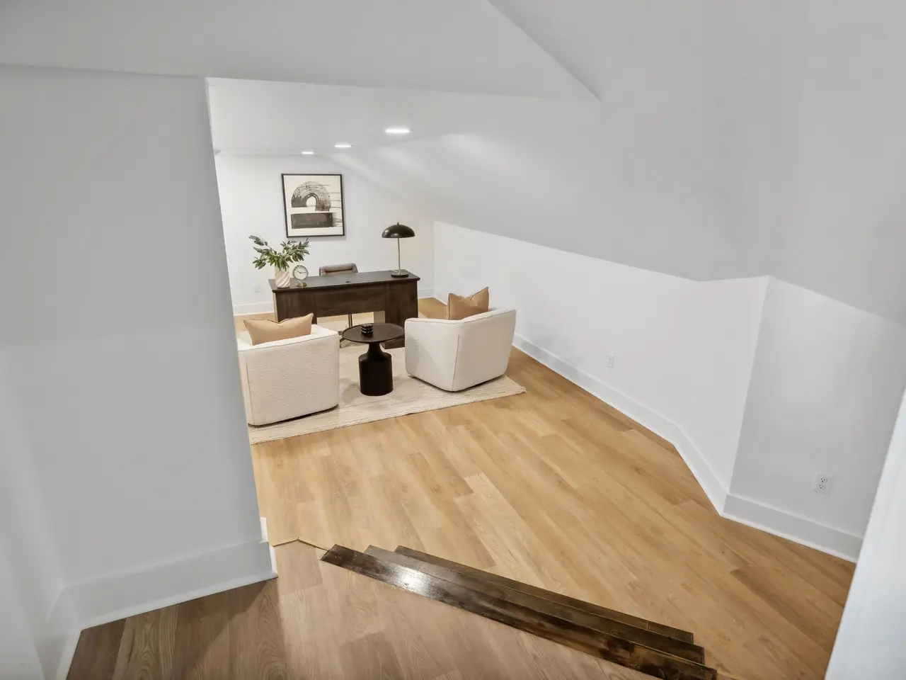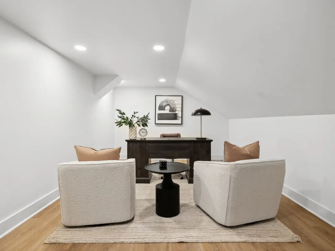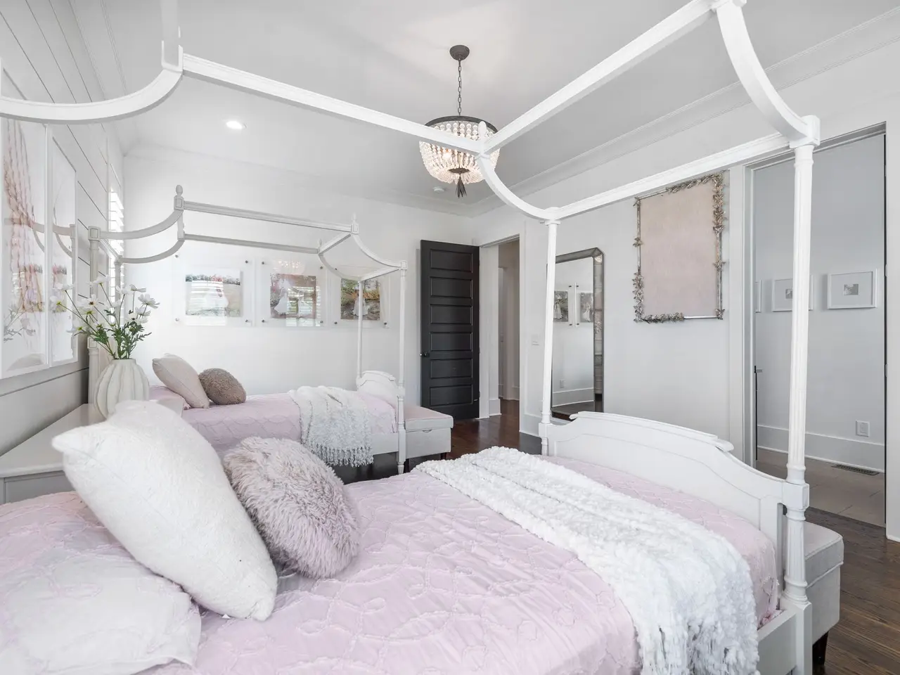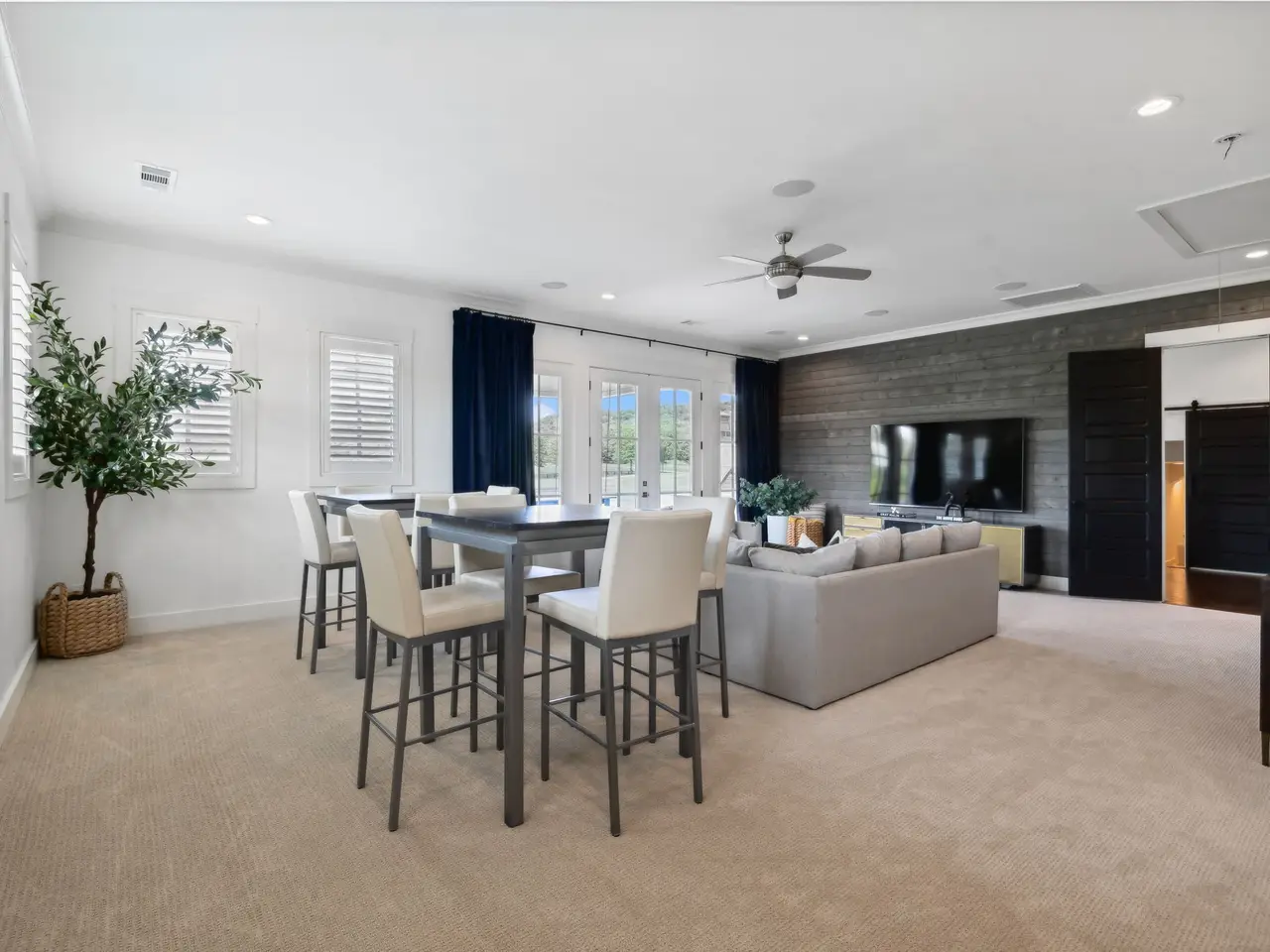 Upstairs offers a fourth bedroom with full bath, flex office space, and large rec room with wet bar opening to a private balcony with hanging daybed and golf course views.