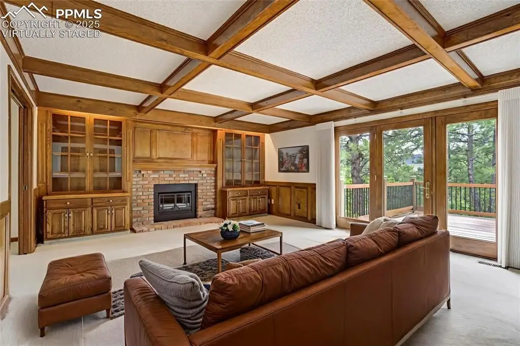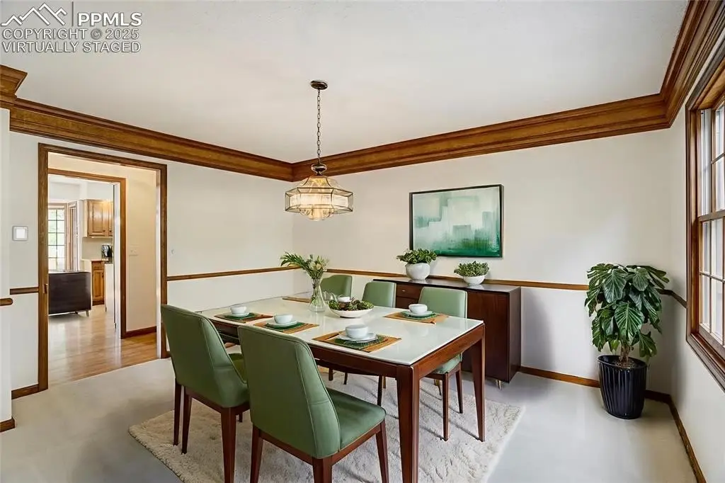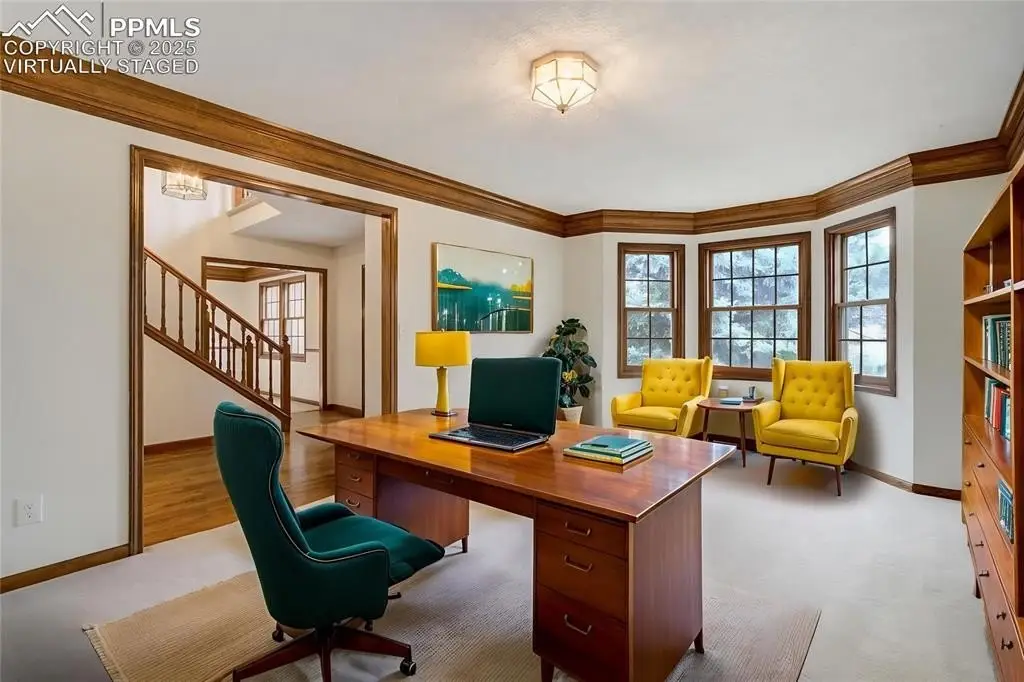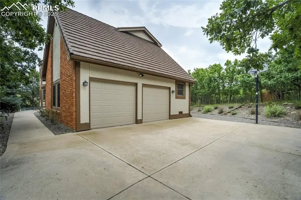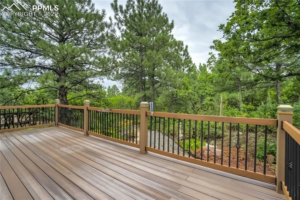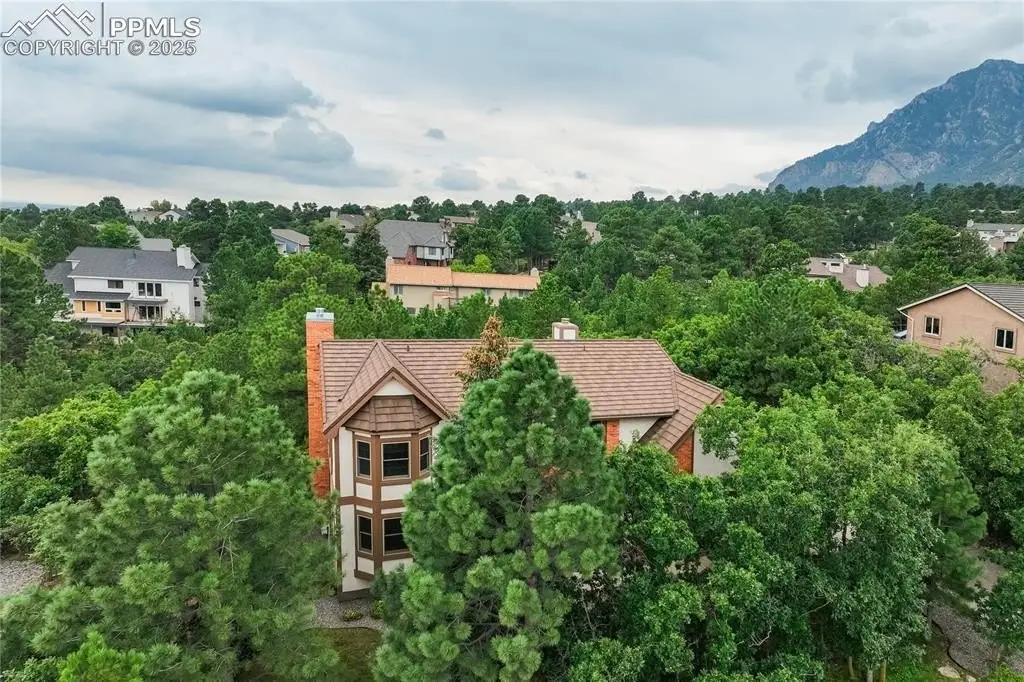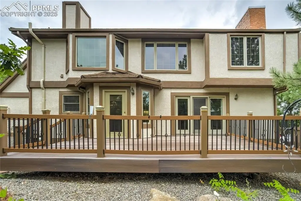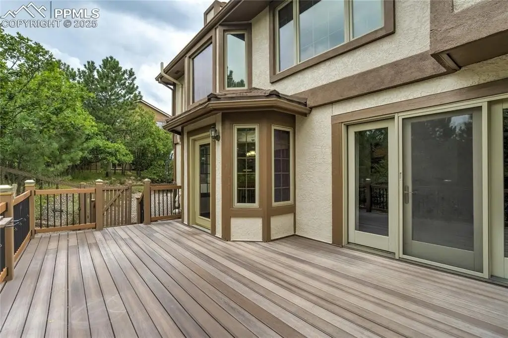 Set in the Broadmoor Bluffs neighborhood near D-12 schools, this home combines mountain & city views w/ a private, nearly half-acre lot close to parks, trails, shopping & military bases. A covered entry opens to solid oak hardwd flrs & a formal living rm framed by a bay window, crown molding, & views of the landscape. From here, the layout flows into the great rm where craftsmanship stands out, beamed ceiling, wainscoting paneling, built-ins, FP, & a wall of windows w/ walk-out access. An integrated bar w/ sink, granite counters & storage enhances the space while keeping everything tucked neatly away. The adj gourmet kitchen offers an eating nook surrounded by windows & deck access, plus hardwd flr, center island, granite countertops, updated lighting, tile backsplash, SS appliances incl range-top & wall oven, pantry, & built-in work area. A formal dining room connects easily, designed w/ crown molding & chair rail. Completing the main lvl is a half bath & a laundry room w/ sink, cabinets & window. Upstairs, the primary suite features a tray ceiling, sitting area w/ wd-burning FP, & large windows. The adj 5-pc bath has vaulted ceilings, soaking tub, glass shower & tile flooring, plus a massive walk-in closet w/ custom shelving & bonus room. Three additional bedrooms share the upper level each spacious w/ large closets & new carpet throughout. One bedroom captures mountain views, while all share easy access to a hall bath w/ tiled surround. The finished bsmnt expands the living space w/ a rec room anchored by a FP at one end & open space at the other, plus a bedroom & bath nearby. storage room w/ built-in shelving. Outdoors, a composite deck w/ wrought-iron railing overlooks the xeriscaped backyard, complete w/ fenced garden space & privacy from mature trees. The lot feels secluded while still connected to every convenience. Add highlights incl central A/C, HE furnace, metal tile roof, brick & stucco ext, oversized 2-car garage w/ 220V, & quality finishes throughout.