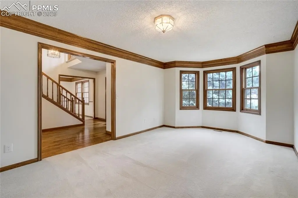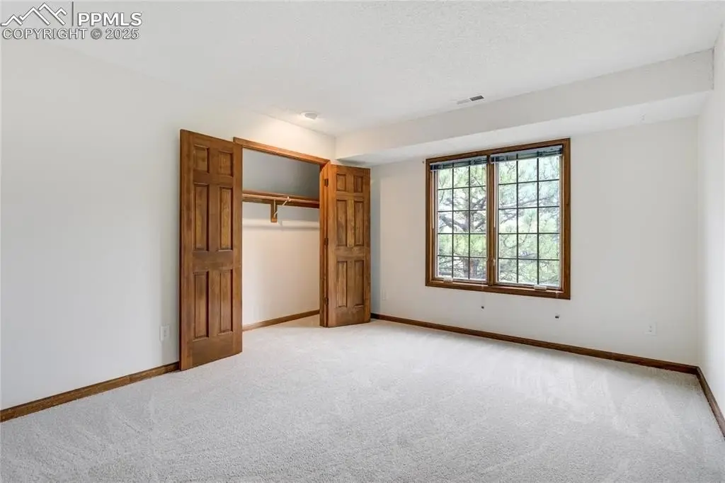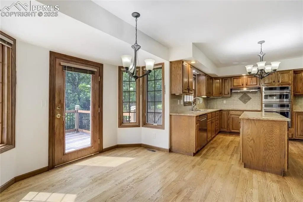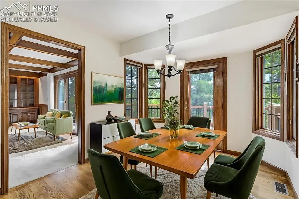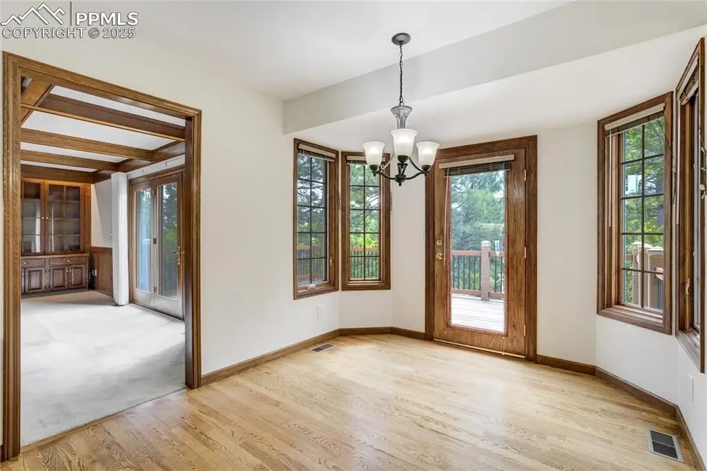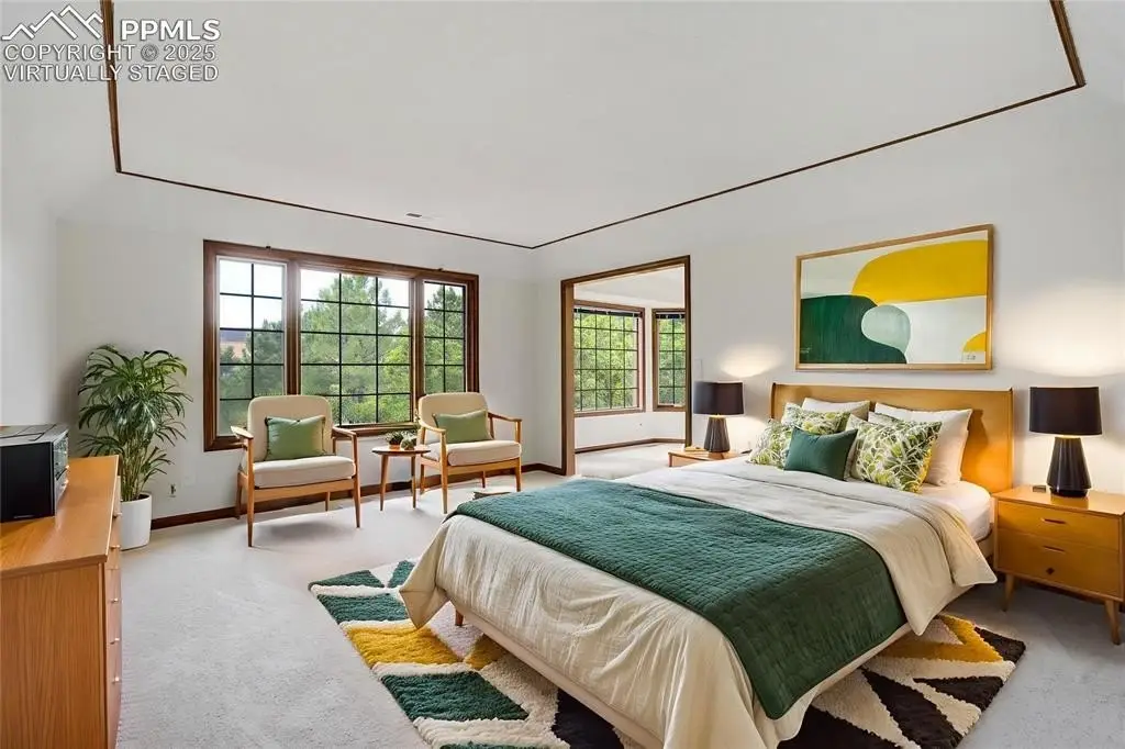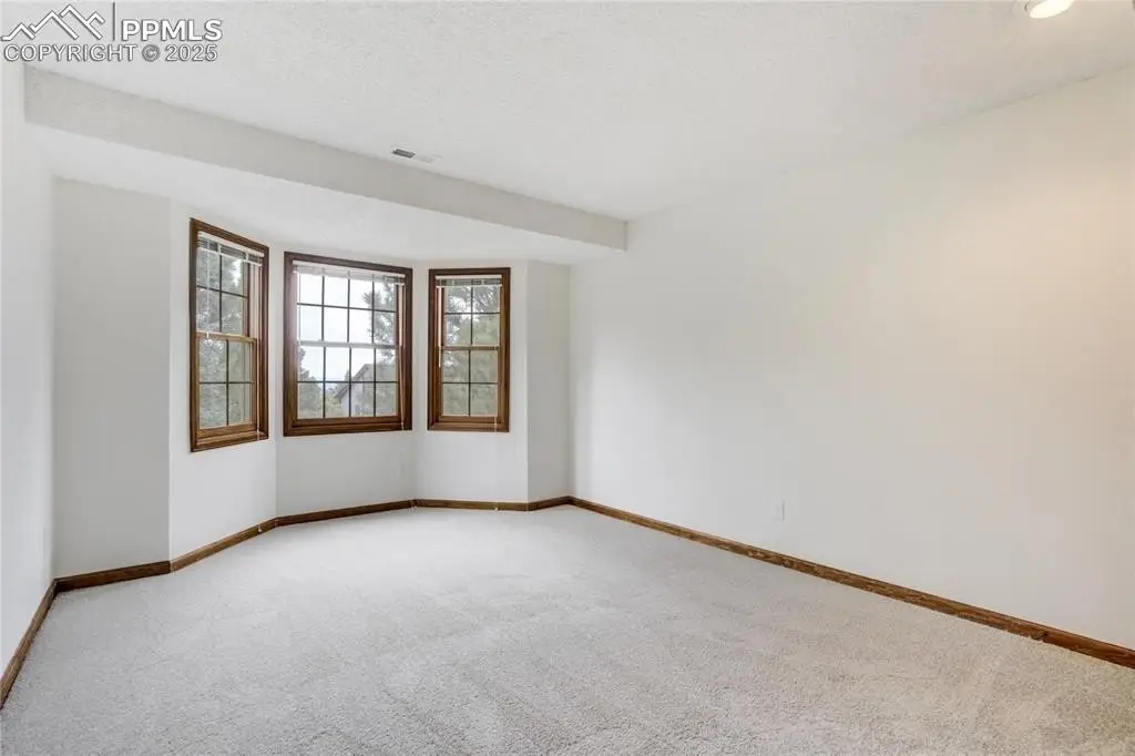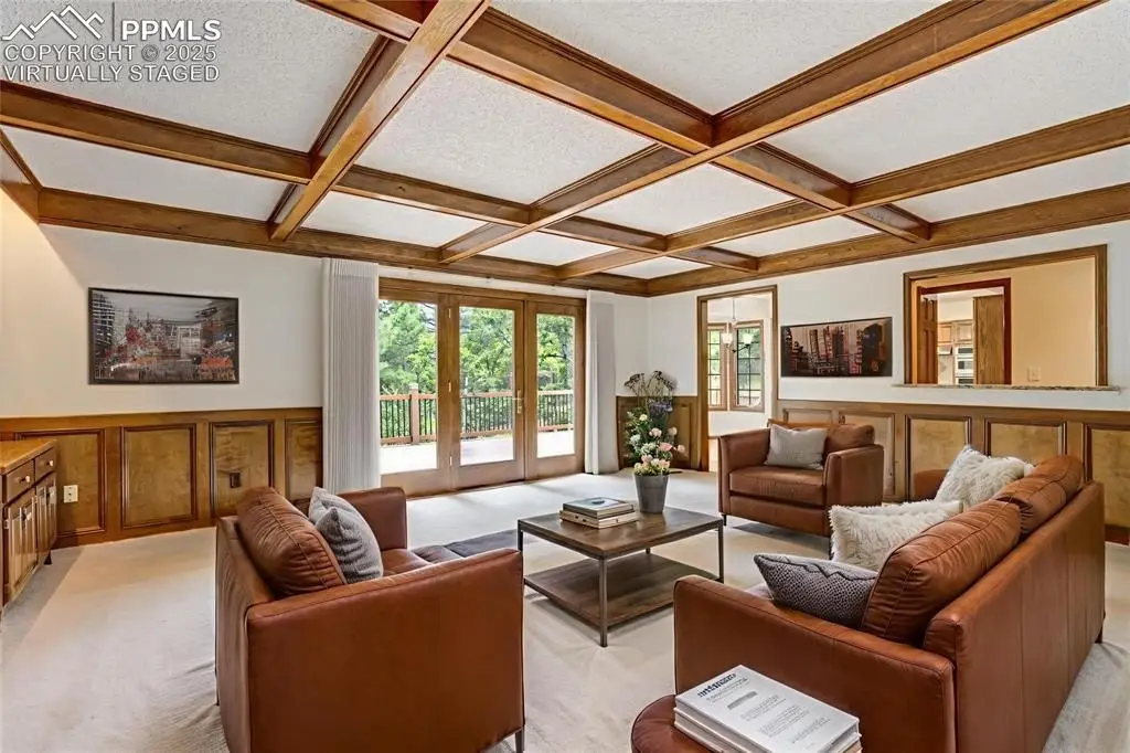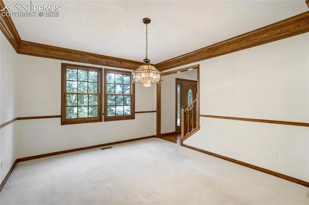Set in the Broadmoor Bluffs neighborhood near D-12 schools, this home combines mountain & city views w/ a private, nearly half-acre lot close to parks, trails, shopping & military bases. A covered entry opens to solid oak hardwd flrs & a formal living rm framed by a bay window, crown molding, & views of the landscape. From here, the layout flows into the great rm where craftsmanship stands out, beamed ceiling, wainscoting paneling, built-ins, FP, & a wall of windows w/ walk-out access. An integrated bar w/ sink, granite counters & storage enhances the space while keeping everything tucked neatly away. The adj gourmet kitchen offers an eating nook surrounded by windows & deck access, plus hardwd flr, center island, granite countertops, updated lighting, tile backsplash, SS appliances incl range-top & wall oven, pantry, & built-in work area. A formal dining room connects easily, designed w/ crown molding & chair rail. Completing the main lvl is a half bath & a laundry room w/ sink, cabinets & window. Upstairs, the primary suite features a tray ceiling, sitting area w/ wd-burning FP, & large windows. The adj 5-pc bath has vaulted ceilings, soaking tub, glass shower & tile flooring, plus a massive walk-in closet w/ custom shelving & bonus room. Three additional bedrooms share the upper level each spacious w/ large closets & new carpet throughout. One bedroom captures mountain views, while all share easy access to a hall bath w/ tiled surround. The finished bsmnt expands the living space w/ a rec room anchored by a FP at one end & open space at the other, plus a bedroom & bath nearby. storage room w/ built-in shelving. Outdoors, a composite deck w/ wrought-iron railing overlooks the xeriscaped backyard, complete w/ fenced garden space & privacy from mature trees. The lot feels secluded while still connected to every convenience. Add highlights incl central A/C, HE furnace, metal tile roof, brick & stucco ext, oversized 2-car garage w/ 220V, & quality finishes throughout.
