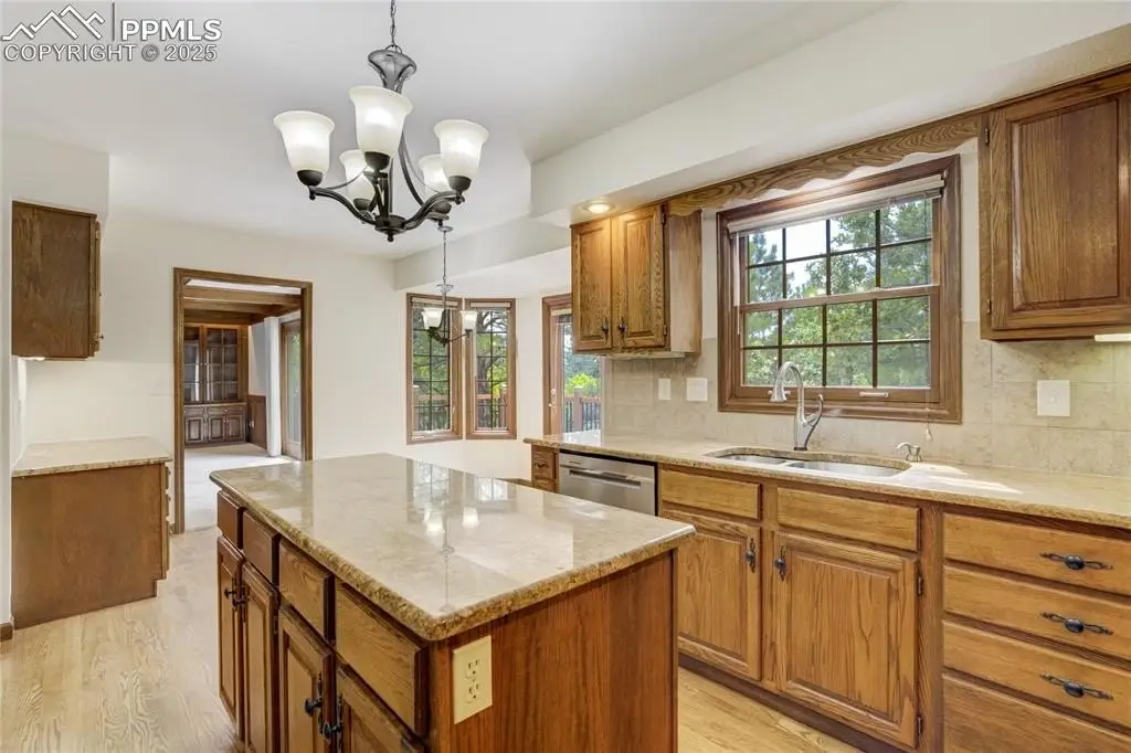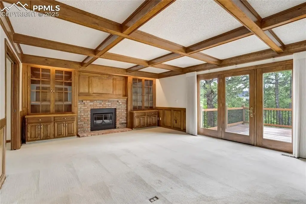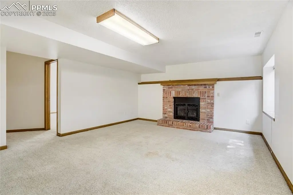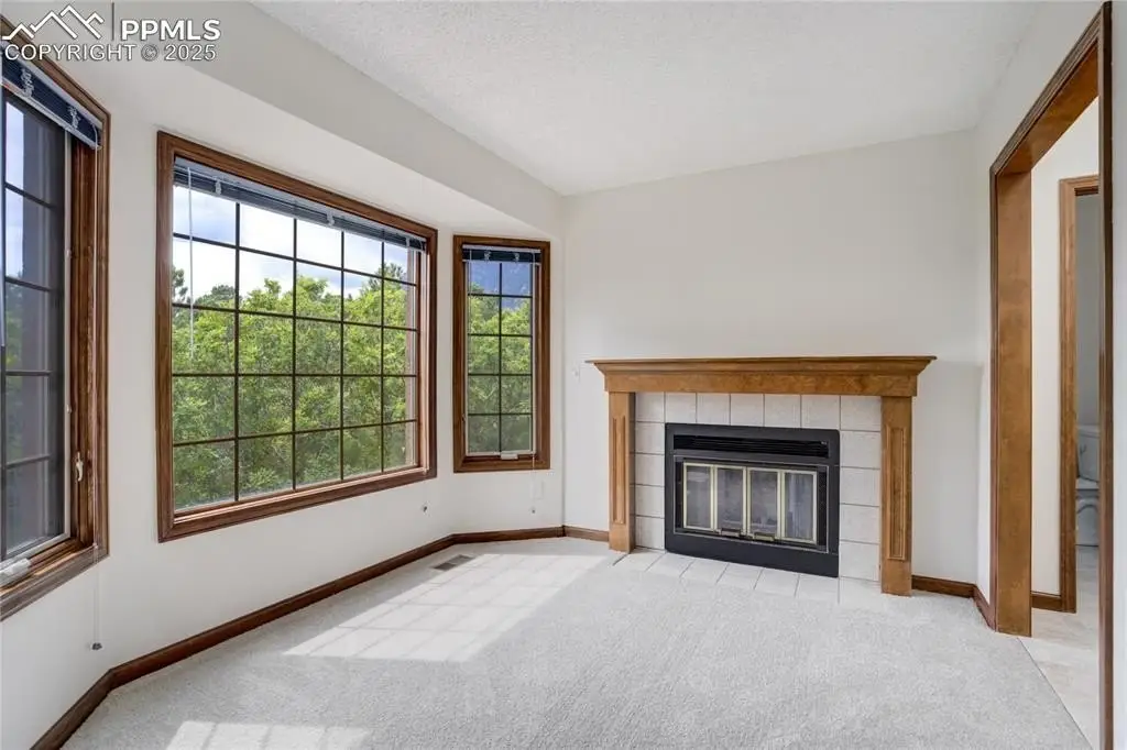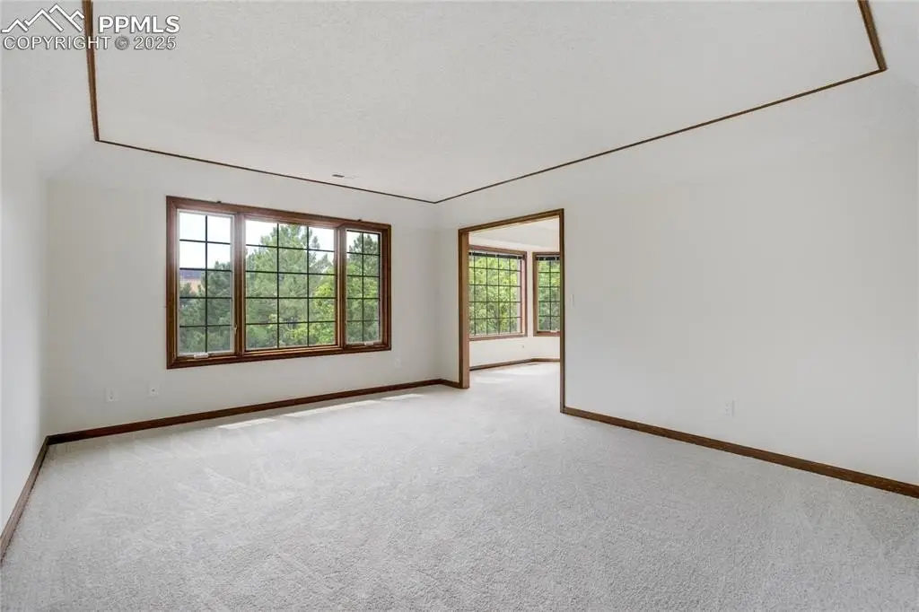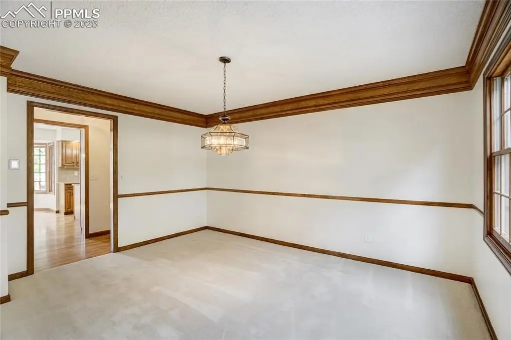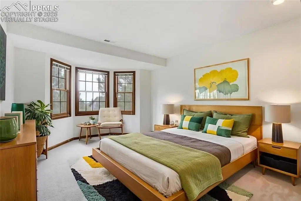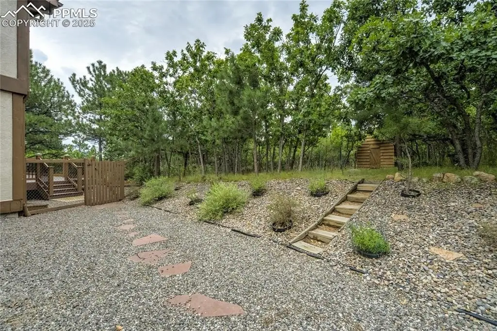 Set in the Broadmoor Bluffs neighborhood near D-12 schools, this home combines mountain & city views w/ a private, nearly half-acre lot close to parks, trails, shopping & military bases. A covered entry opens to solid oak hardwd flrs & a formal living rm framed by a bay window, crown molding, & views of the landscape. From here, the layout flows into the great rm where craftsmanship stands out, beamed ceiling, wainscoting paneling, built-ins, FP, & a wall of windows w/ walk-out access. An integrated bar w/ sink, granite counters & storage enhances the space while keeping everything tucked neatly away. The adj gourmet kitchen offers an eating nook surrounded by windows & deck access, plus hardwd flr, center island, granite countertops, updated lighting, tile backsplash, SS appliances incl range-top & wall oven, pantry, & built-in work area. A formal dining room connects easily, designed w/ crown molding & chair rail. Completing the main lvl is a half bath & a laundry room w/ sink, cabinets & window. Upstairs, the primary suite features a tray ceiling, sitting area w/ wd-burning FP, & large windows. The adj 5-pc bath has vaulted ceilings, soaking tub, glass shower & tile flooring, plus a massive walk-in closet w/ custom shelving & bonus room. Three additional bedrooms share the upper level each spacious w/ large closets & new carpet throughout. One bedroom captures mountain views, while all share easy access to a hall bath w/ tiled surround. The finished bsmnt expands the living space w/ a rec room anchored by a FP at one end & open space at the other, plus a bedroom & bath nearby. storage room w/ built-in shelving. Outdoors, a composite deck w/ wrought-iron railing overlooks the xeriscaped backyard, complete w/ fenced garden space & privacy from mature trees. The lot feels secluded while still connected to every convenience. Add highlights incl central A/C, HE furnace, metal tile roof, brick & stucco ext, oversized 2-car garage w/ 220V, & quality finishes throughout.