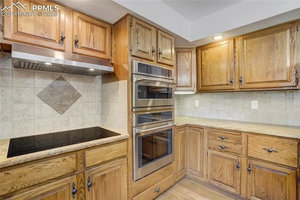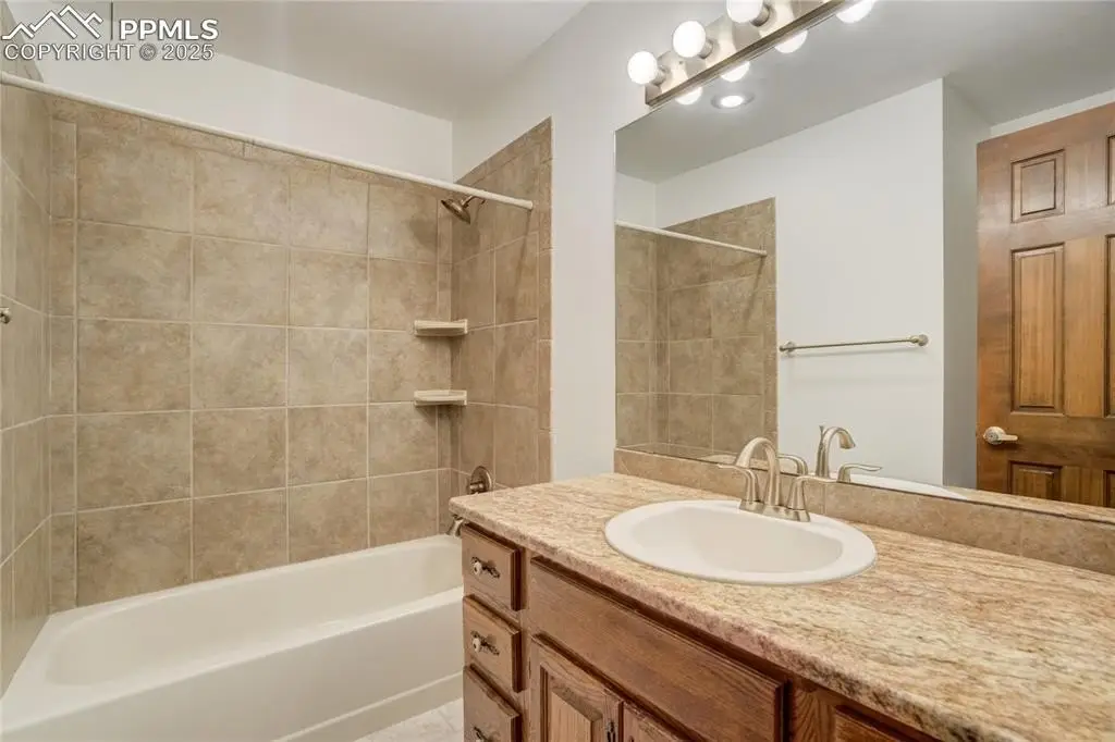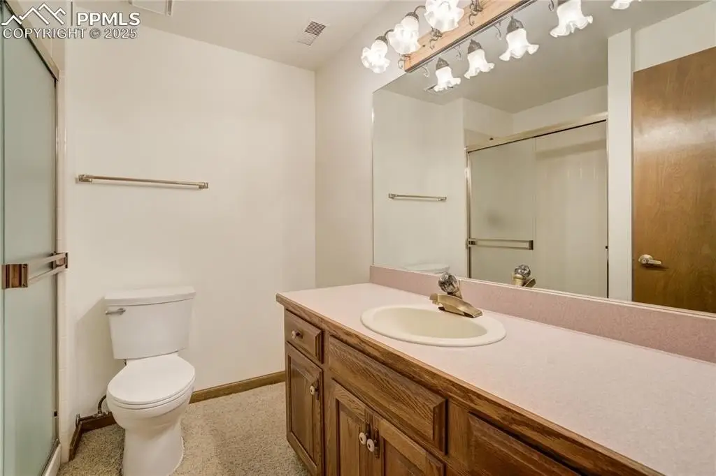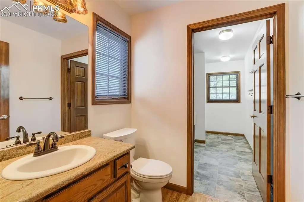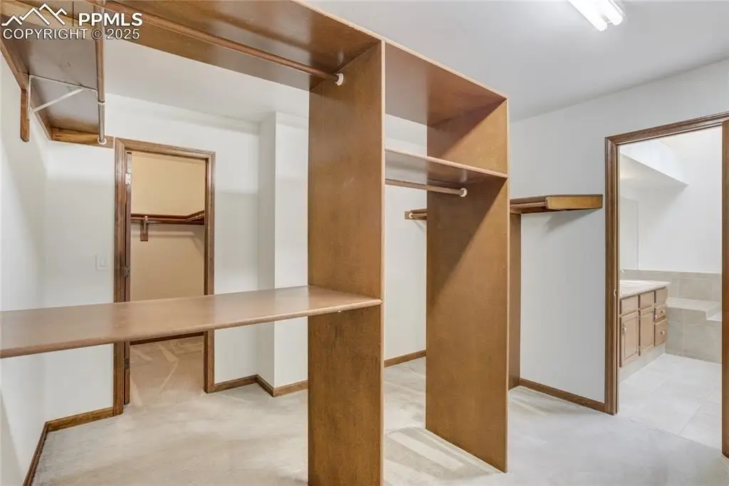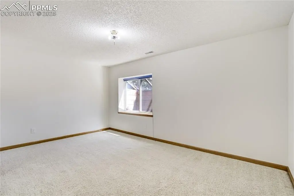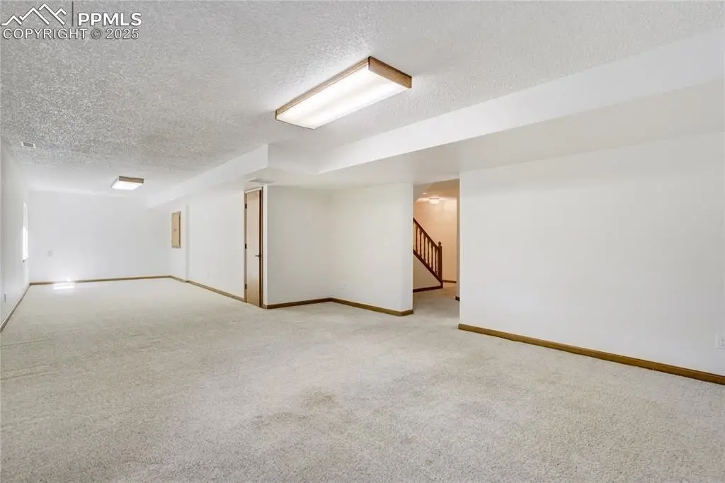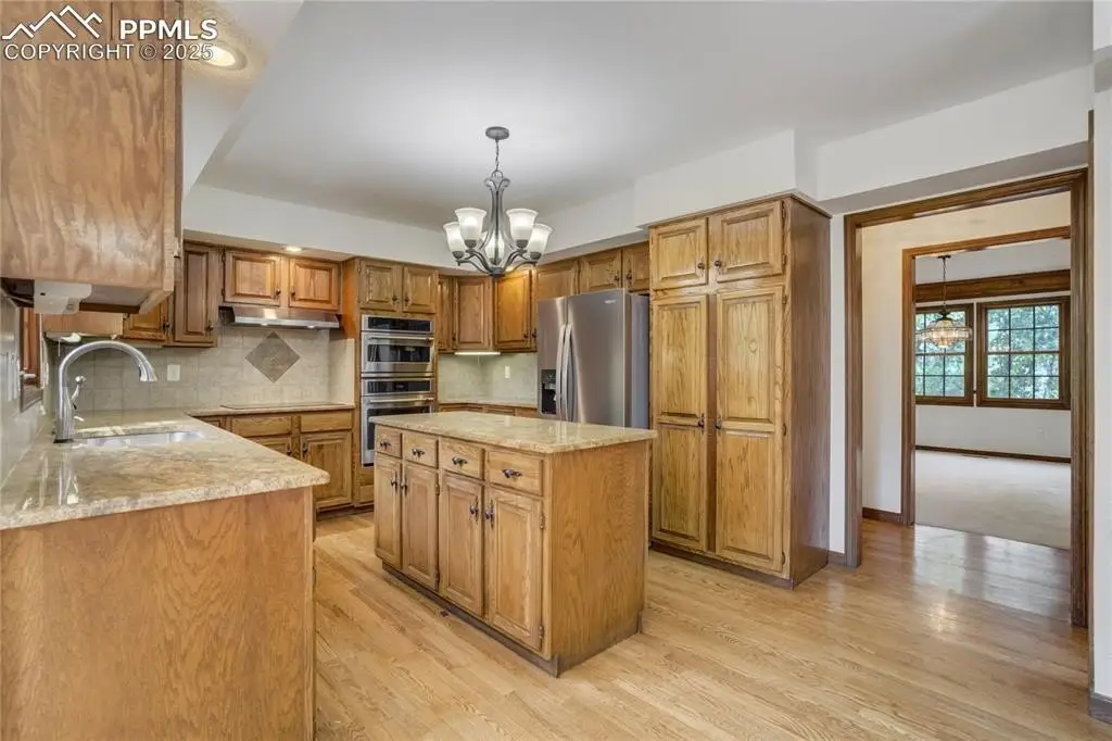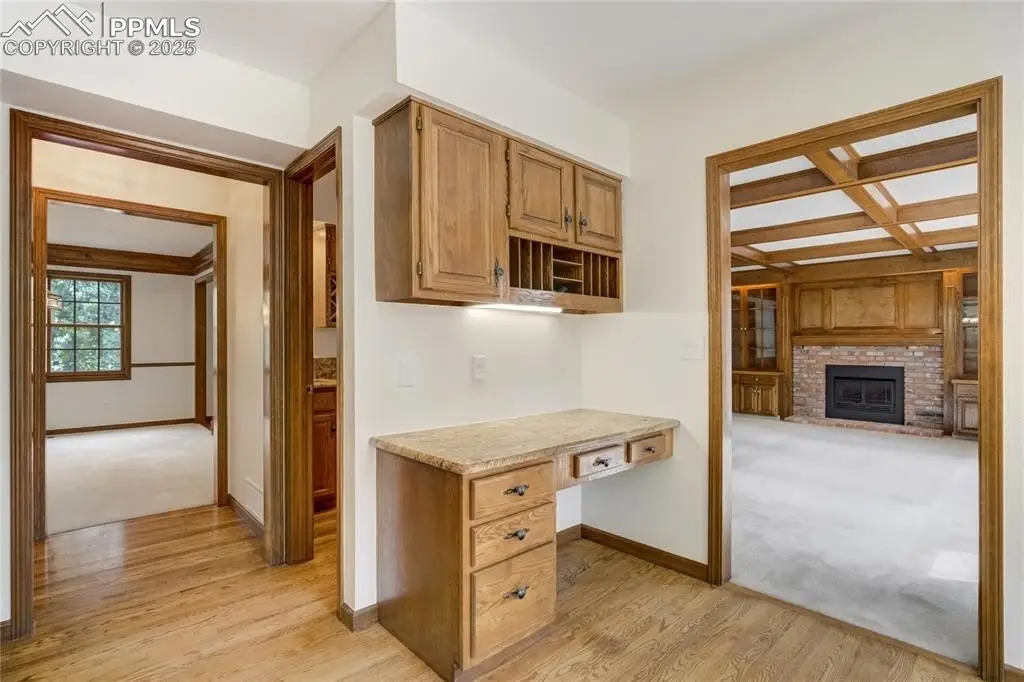 Set in the Broadmoor Bluffs neighborhood near D-12 schools, this home combines mountain & city views w/ a private, nearly half-acre lot close to parks, trails, shopping & military bases. A covered entry opens to solid oak hardwd flrs & a formal living rm framed by a bay window, crown molding, & views of the landscape. From here, the layout flows into the great rm where craftsmanship stands out, beamed ceiling, wainscoting paneling, built-ins, FP, & a wall of windows w/ walk-out access. An integrated bar w/ sink, granite counters & storage enhances the space while keeping everything tucked neatly away. The adj gourmet kitchen offers an eating nook surrounded by windows & deck access, plus hardwd flr, center island, granite countertops, updated lighting, tile backsplash, SS appliances incl range-top & wall oven, pantry, & built-in work area. A formal dining room connects easily, designed w/ crown molding & chair rail. Completing the main lvl is a half bath & a laundry room w/ sink, cabinets & window. Upstairs, the primary suite features a tray ceiling, sitting area w/ wd-burning FP, & large windows. The adj 5-pc bath has vaulted ceilings, soaking tub, glass shower & tile flooring, plus a massive walk-in closet w/ custom shelving & bonus room. Three additional bedrooms share the upper level each spacious w/ large closets & new carpet throughout. One bedroom captures mountain views, while all share easy access to a hall bath w/ tiled surround. The finished bsmnt expands the living space w/ a rec room anchored by a FP at one end & open space at the other, plus a bedroom & bath nearby. storage room w/ built-in shelving. Outdoors, a composite deck w/ wrought-iron railing overlooks the xeriscaped backyard, complete w/ fenced garden space & privacy from mature trees. The lot feels secluded while still connected to every convenience. Add highlights incl central A/C, HE furnace, metal tile roof, brick & stucco ext, oversized 2-car garage w/ 220V, & quality finishes throughout.