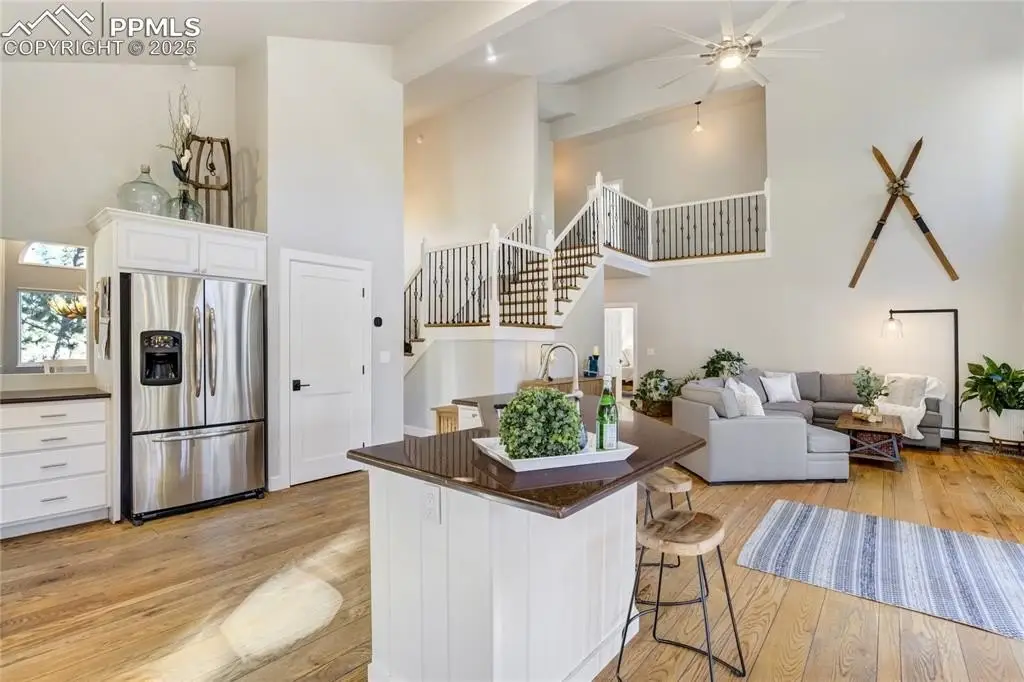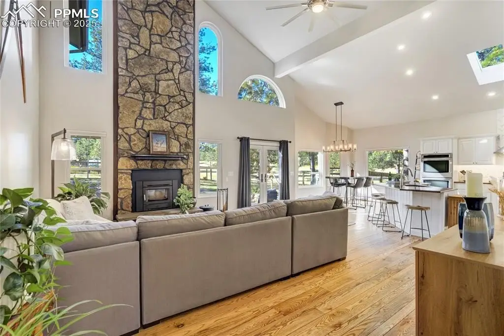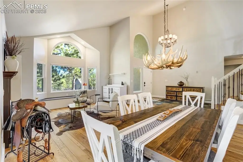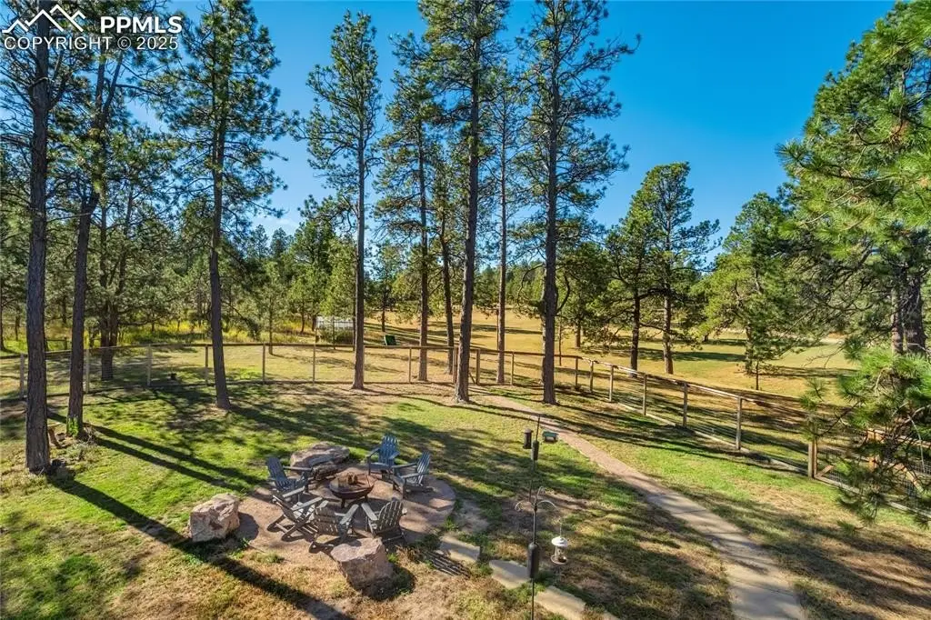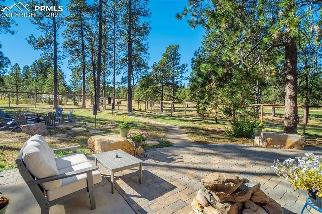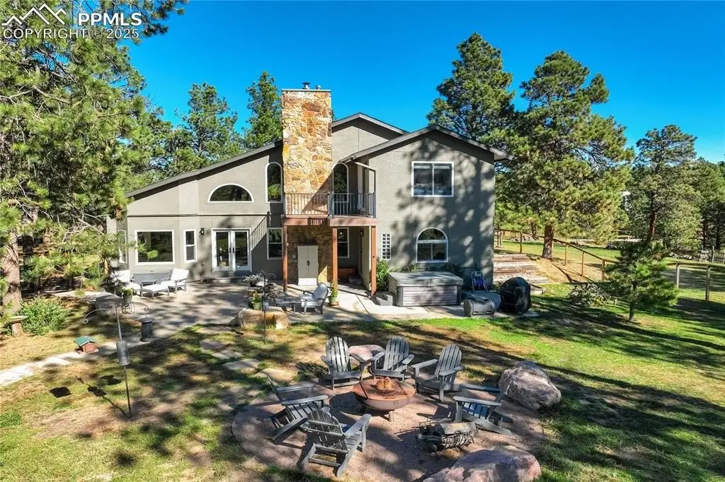 Elevated Living | Serenity Among the Pines—Where timeless design, natural beauty, and peaceful living converge. Nestled on a private, 5-acre treed corner lot zoned for horses, this beautifully crafted home offers the perfect blend of elegance, warmth + functionality. Thoughtfully updated, it balances classic architecture with modern comforts + an effortless connection to its serene natural setting. The main lvl welcomes you w/hardwood floors, soaring vaulted ceilings + abundant light that enhances the open flow. The formal living room features a bay-window seat overlooking the wooded landscape + a cozy gas fireplace, while the adjacent dining room is ideal for festive gatherings. The great room impresses w/a dramatic floor-to-ceiling stone wood-burning fireplace + opens to the gourmet kitchen—showcasing white cabinetry, Silestone countertops, a large island w/seating, walk-in pantry + stainless-steel appliances including double ovens, a 5-burner gas cooktop + exterior-vented hood. The expansive main-level owner’s suite is a peaceful retreat offering 2 walk-in closets w/custom built-ins + a luxurious 5-piece ensuite complete w/heated tile floors, dual granite vanities, soaking tub + walk-in shower—plus private walk-out access to the patio + hot tub. Upstairs, a Jr Suite w/a private composite deck & ensuite bath provides flexibility, along with 3 additional bedrooms + an updated full bath. The finished walk-out basement offers ample storage + is pre-plumbed for a future pellet/wood stove + wet bar. Add Highlights: New Class IV roof (2023), Boiler (2025), Carpet + Interior Paint (2025) + updated lighting. Outdoor living shines w/greenhouse, loafing shed, chicken coops + 6 car garage. With no HOA + minimal covenants, enjoy the freedom of country living just minutes from the Pineries Open Space—where trails for hiking, biking, and horseback riding await. Award-winning D20 schools and an easy commute to both Colorado Springs + Denver complete this one-of-a-kind retreat.