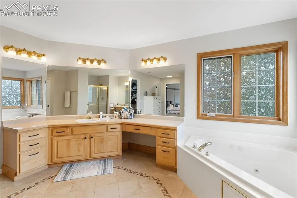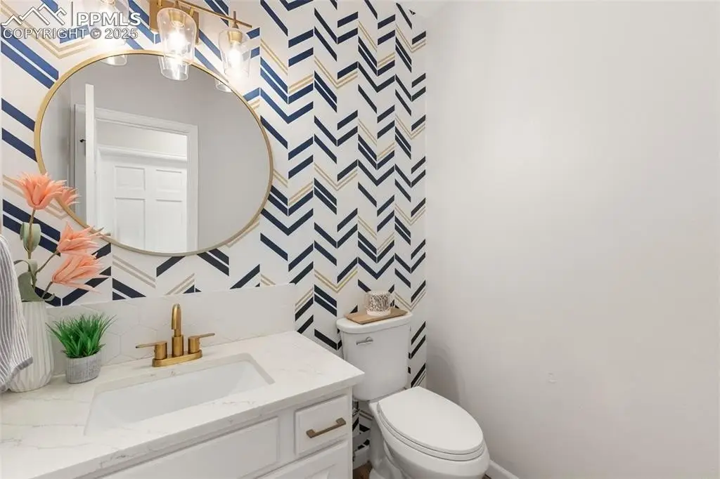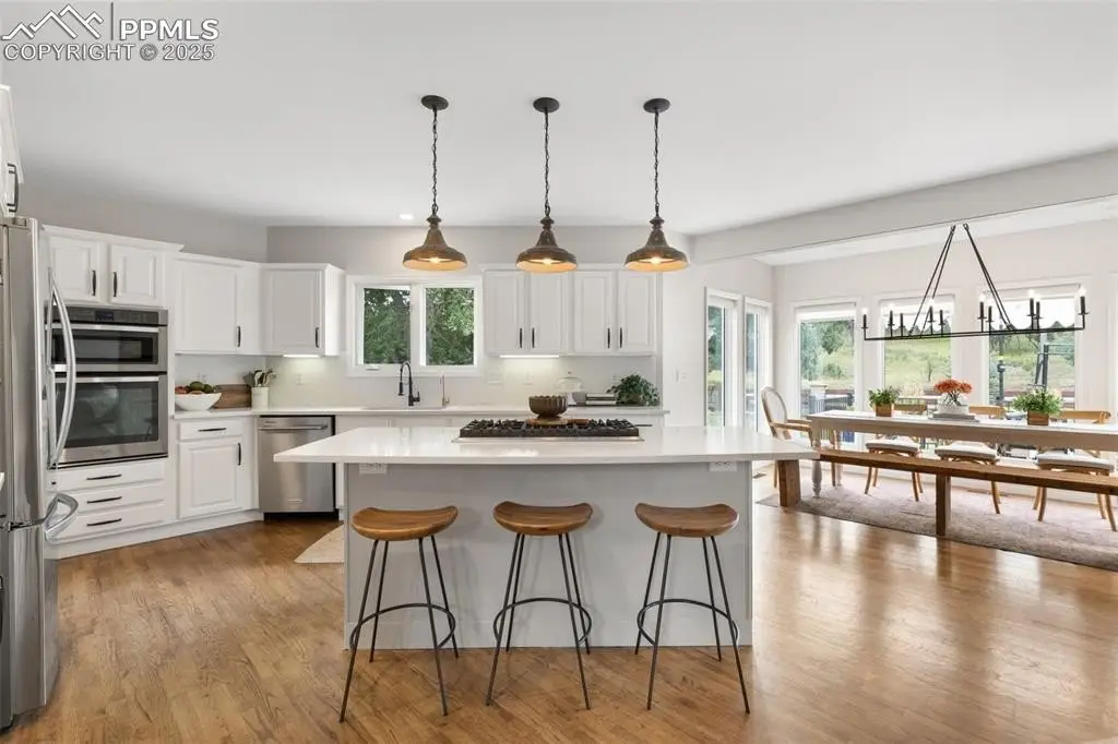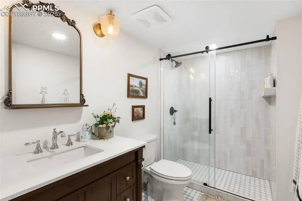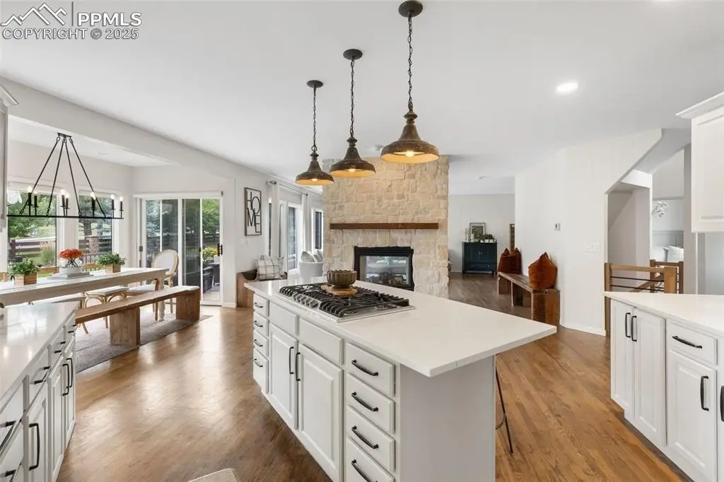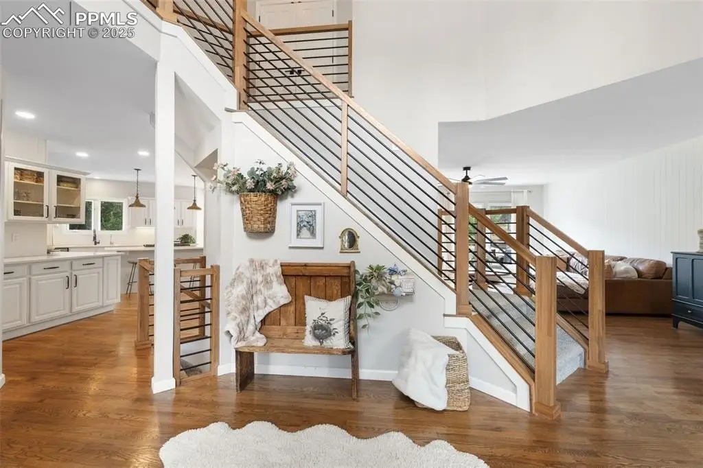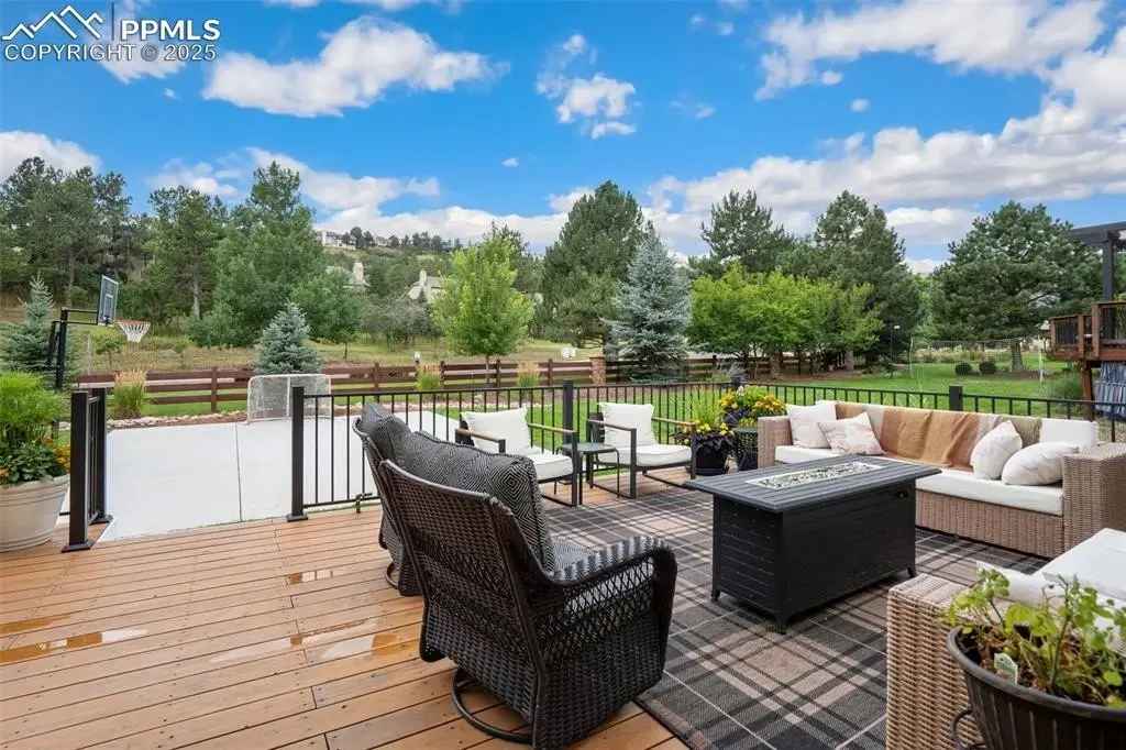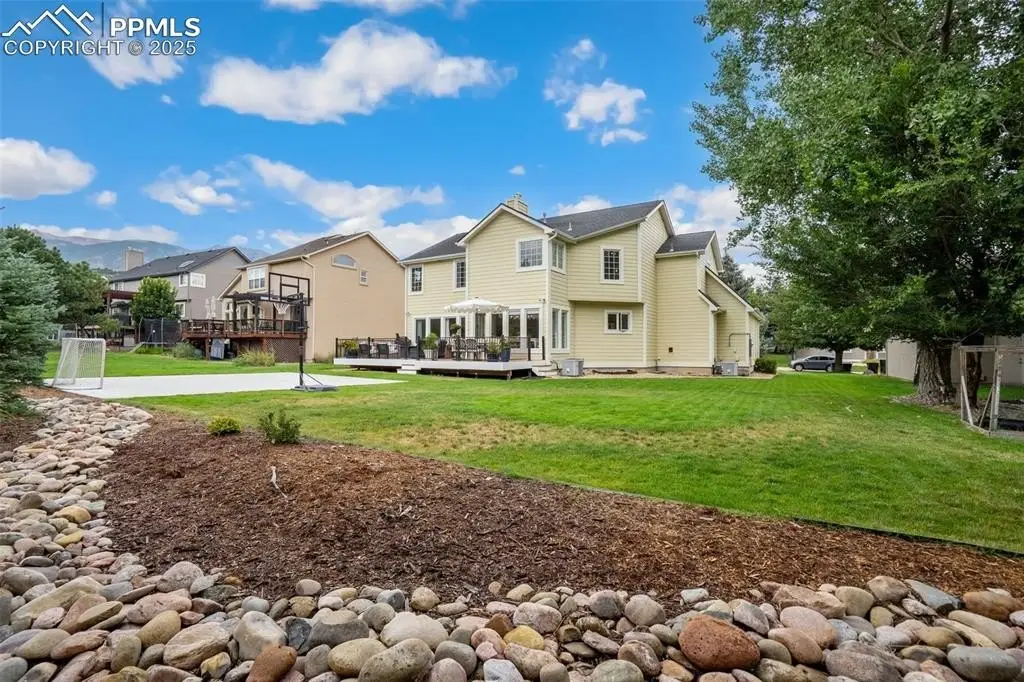 Stunning home in Rockledge at Peregrine boasting timeless style and designer finishes throughout. From the moment you enter, hardwood floors and an open floor plan set the stage for this inviting residence. The great room impresses with a dual sided stone fireplace and a wall of windows overlooking the backyard. A butler’s pantry leads to the renovated kitchen featuring quartz counters, a sprawling center island, gas cooktop, stainless appliances, and abundant cabinetry. The adjoining bayed dining nook is perfect for family meals. The floor plan offers flexible spaces to fit your lifestyle – formal dining room, office and living room. A half bathroom and remodeled laundry room complete the main level. Upstairs, the spacious primary suite offers a private sitting area, 5-piece bath, and walk-in closet. The upper level boasts three additional bedrooms—one with its own en-suite bathroom, and two connected by a Jack-and-Jill bathroom. The newly finished basement provides even more living space with a large family room, two bedrooms, and a full bathroom. Step outside to an expansive deck overlooking the park-like backyard with a sport court—perfect for entertaining, play, and relaxation. Walk to award winning Woodmen Roberts Elementary, neighborhood park or access acres of hiking trails in Blodgett Open Space. Situated in the foothills of Peregrine, you will enjoy mountain views, mature trees, and wildlife yet you are minutes from I-25 with easy access to downtown Co Springs, USAFA, shopping and dining. This home offers extensive hardwood flooring, new carpet, updated lighting, beautiful indoor and outdoor living spaces, invisible fence for dogs and much more. There is nothing left to do but move in and enjoy the amazing amenities of this home.