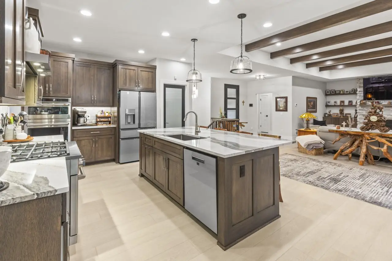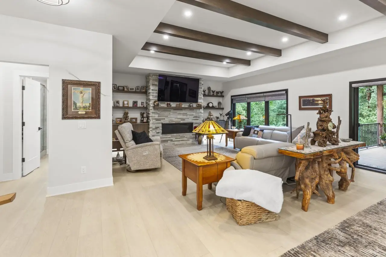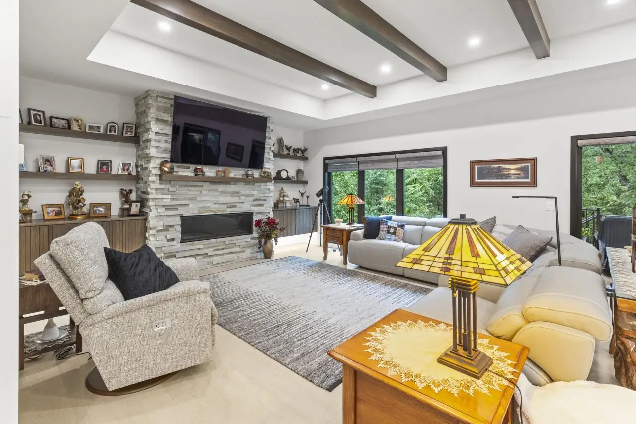 Step into a home where every detail has been carefully considered and no finish overlooked. This custom built 4-bedroom, 3.5-bath blends thoughtful design with everyday comfort. The exterior sets the tone with clean lines, stone accents, and 3 car garage. Inside the open concept showcases ceiling beams, a stone fireplace, and windows framing the wooded backdrop. The kitchen and living areas combine high-end finishes with function, ideal for living and entertaining. The primary suite is a retreat with a spa inspired bath, dual vanities, soaking tub, and walk-in closet. Downstairs a family room with wet bar is perfect for gatherings, and outside a hot tub awaits for the ultimate in relaxation. Every element has been thoughtfully crafted, creating a home that is both elegant and inviting.