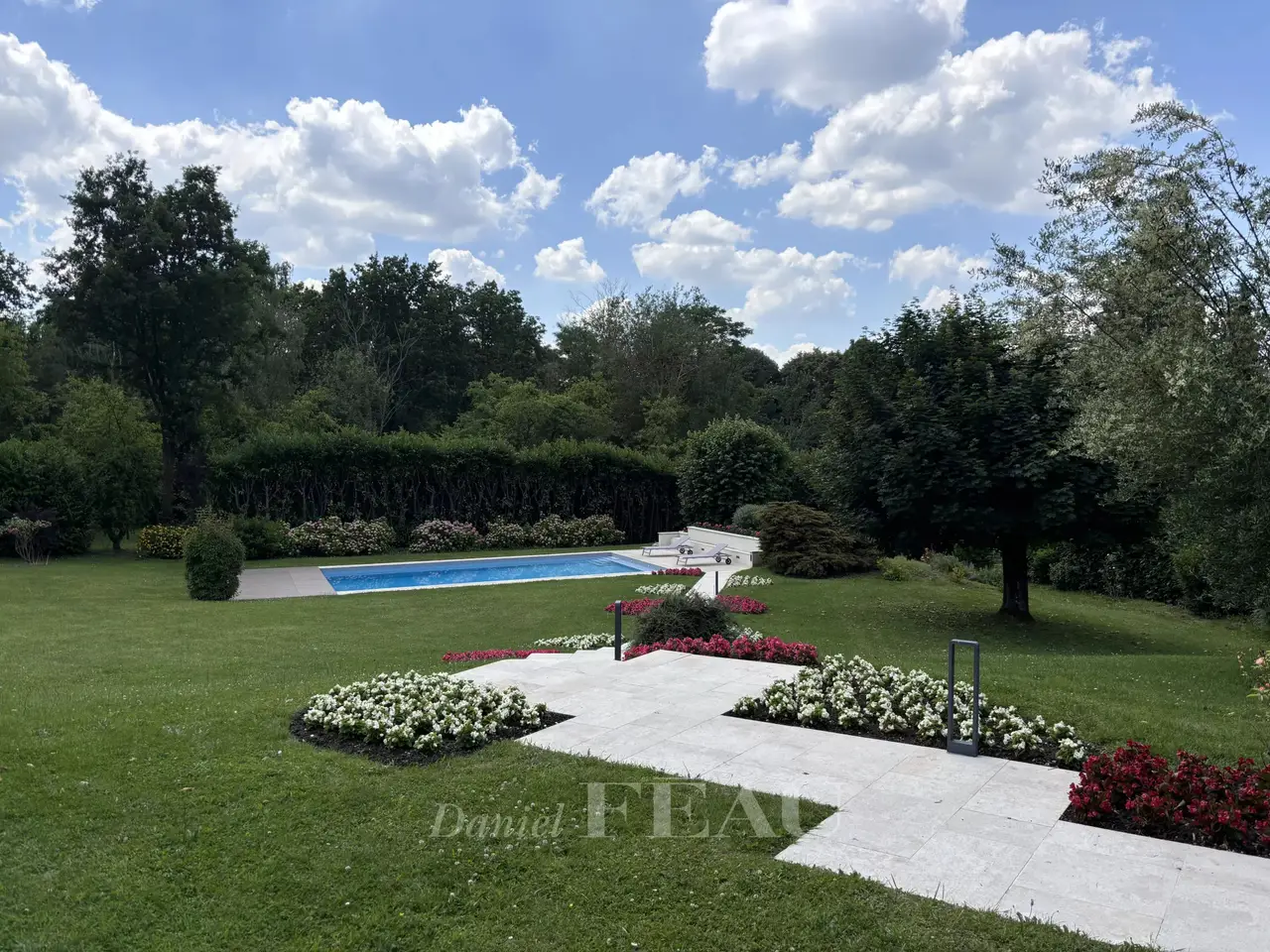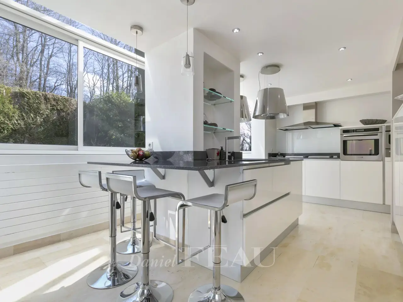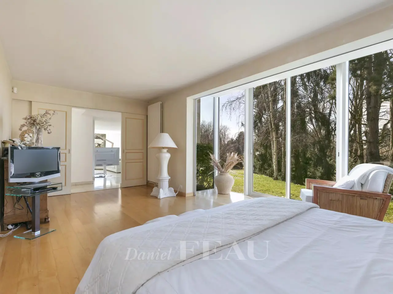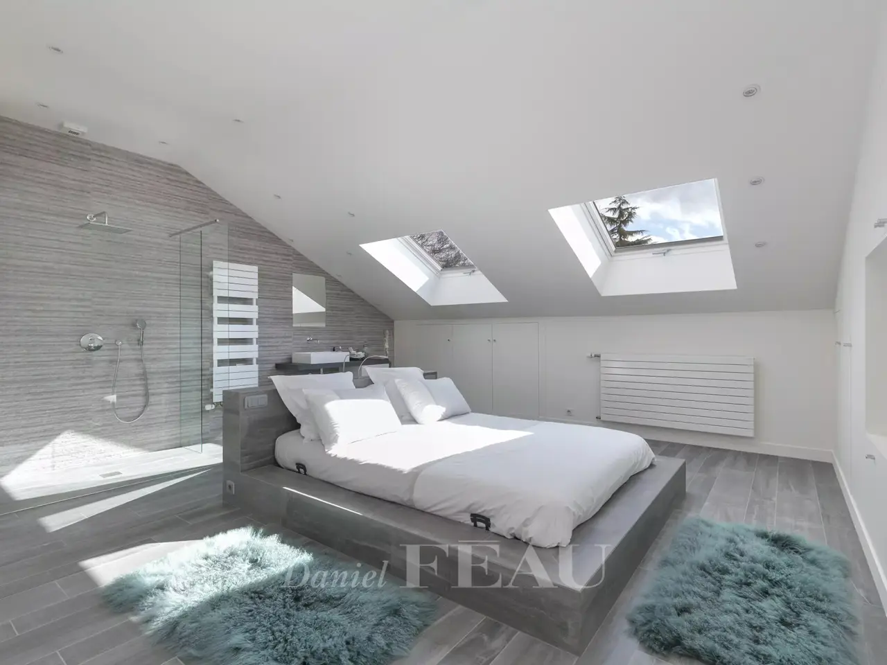 This property offering 411 sqm of floor space and about 260 sqm of living space in excellent condition is set in 6000 sqm of grounds in a peaceful leafy environment. Very bright and tastefully renovated throughout by the current owners, it includes a 75 sqm triple living/reception room featuring an 8-metre high cathedral ceiling and a wood burner, a dining room opening onto a terrace and the garden, a luxurious fitted and recently equipped kitchen with dining facilities, a utility room, and a near 46 sqm master suite with a fully west-facing bedroom featuring a fireplace, a bath/shower room/wc and a dressing room. A bright mezzanine study leads to two spacious bedrooms (one with a shower room), a smaller third bedroom or possible dressing room, and a shower room. On a basement comprising a 100 sqm 4-car garage, a boiler room and two large storage rooms. The floodlit leafy grounds are potentially partially constructible, and feature a swimming pool , a vegetable garden and two outdoor parking spaces. In a convenient location near the shops, the schools and the transport networks (Paris 25 min via the A14, and 25 min by train). Bus lanes access excellent schools including Blanche de Castille, Saint-Jean-Hulst and Saint-Germain-en-Laye International School.
