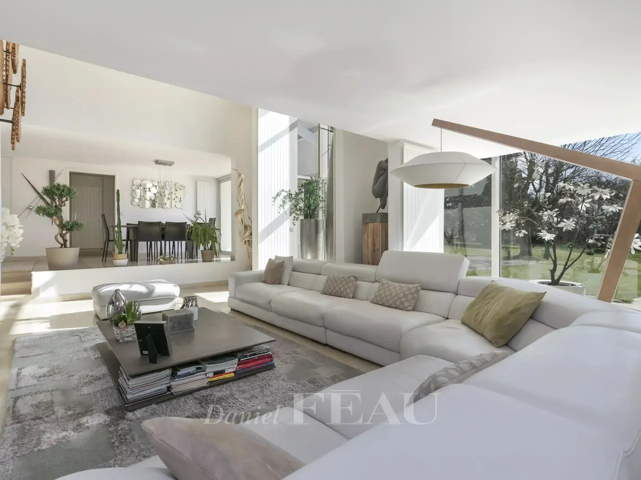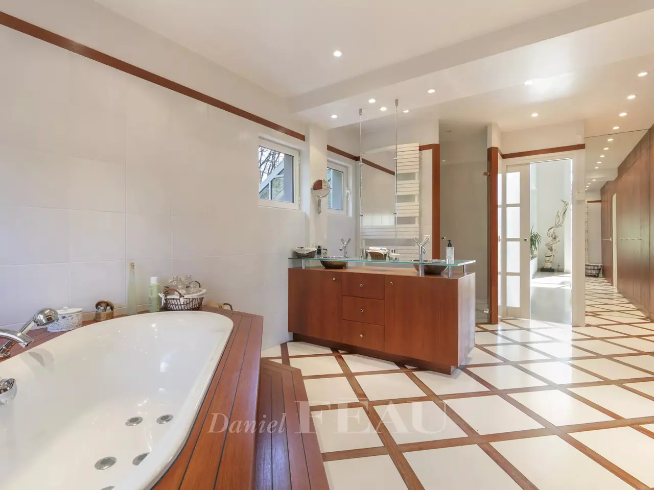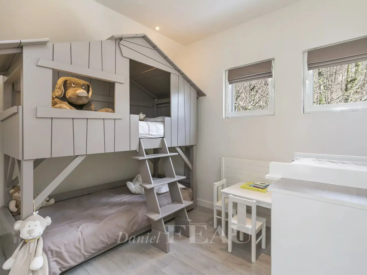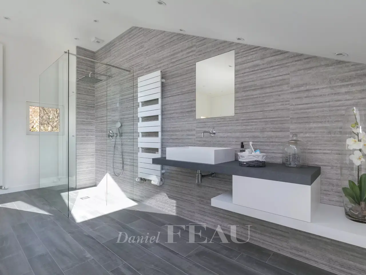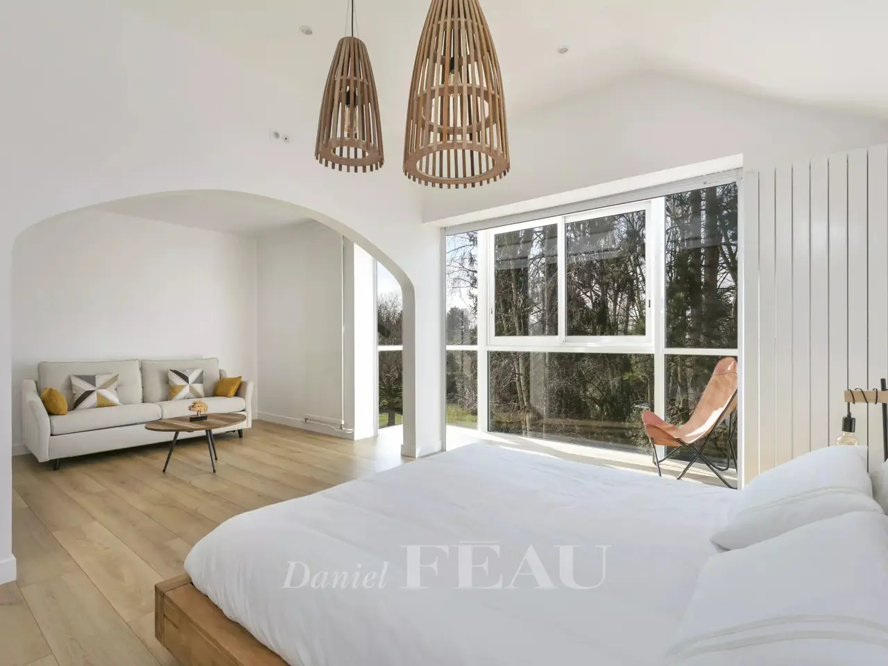 This property offering 411 sqm of floor space and about 260 sqm of living space in excellent condition is set in 6000 sqm of grounds in a peaceful leafy environment. Very bright and tastefully renovated throughout by the current owners, it includes a 75 sqm triple living/reception room featuring an 8-metre high cathedral ceiling and a wood burner, a dining room opening onto a terrace and the garden, a luxurious fitted and recently equipped kitchen with dining facilities, a utility room, and a near 46 sqm master suite with a fully west-facing bedroom featuring a fireplace, a bath/shower room/wc and a dressing room. A bright mezzanine study leads to two spacious bedrooms (one with a shower room), a smaller third bedroom or possible dressing room, and a shower room. On a basement comprising a 100 sqm 4-car garage, a boiler room and two large storage rooms. The floodlit leafy grounds are potentially partially constructible, and feature a swimming pool , a vegetable garden and two outdoor parking spaces. In a convenient location near the shops, the schools and the transport networks (Paris 25 min via the A14, and 25 min by train). Bus lanes access excellent schools including Blanche de Castille, Saint-Jean-Hulst and Saint-Germain-en-Laye International School.