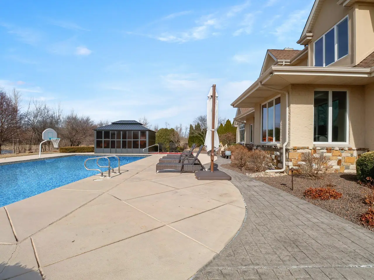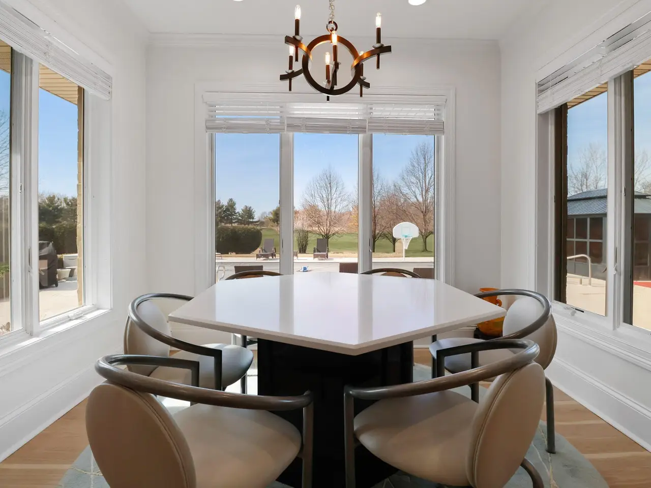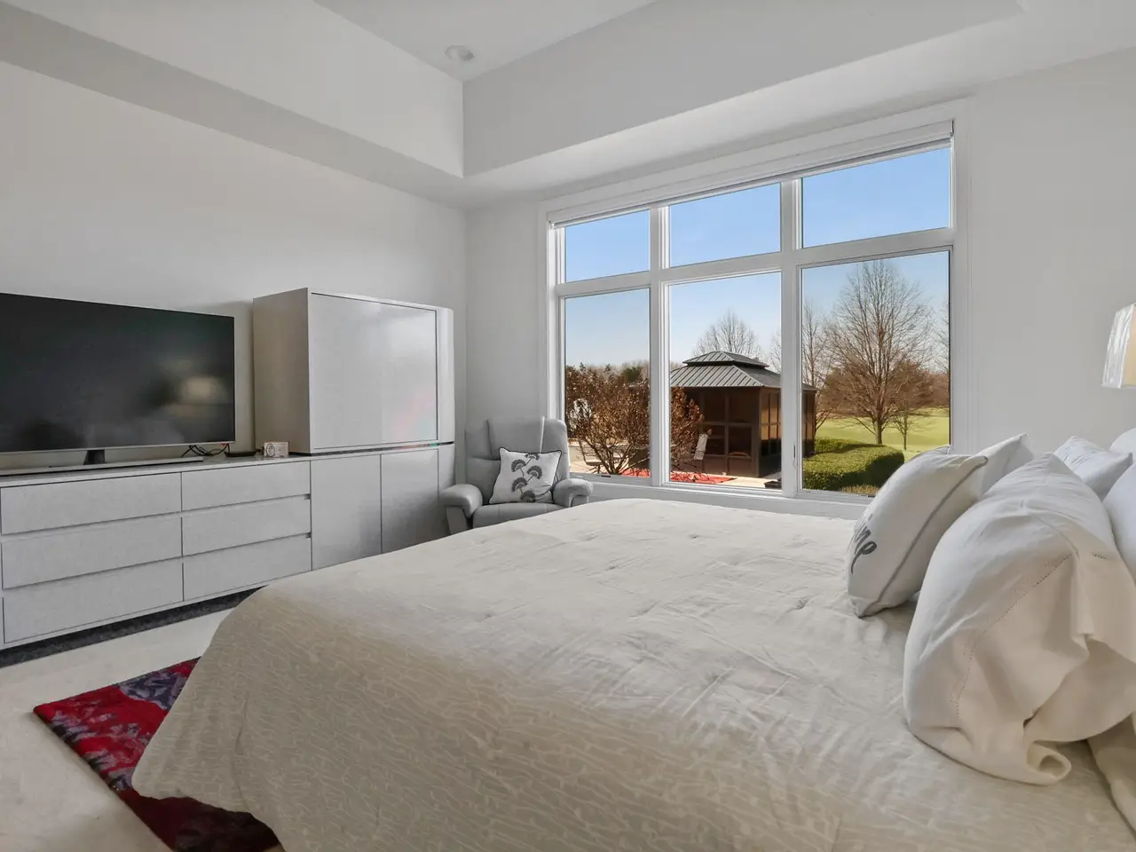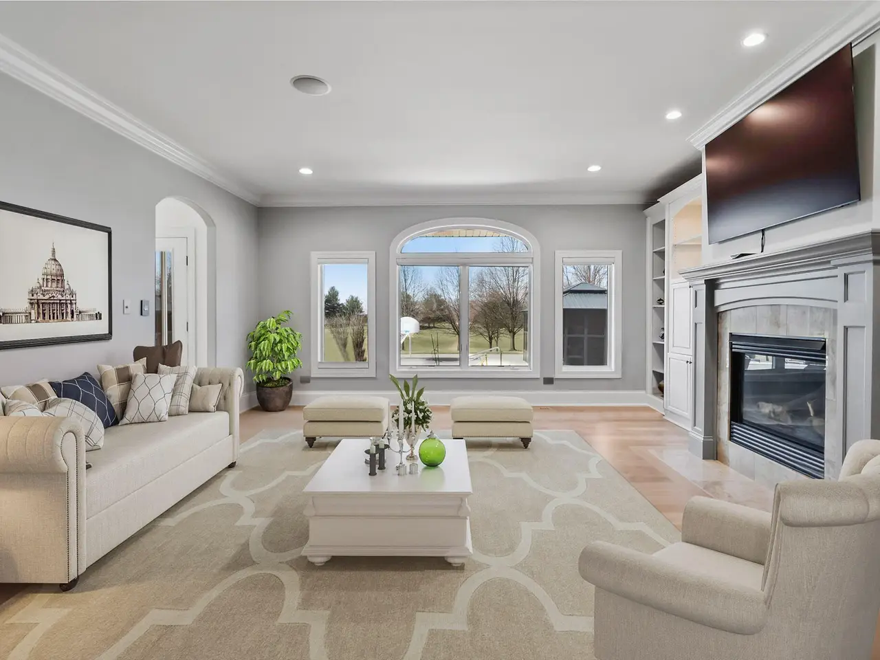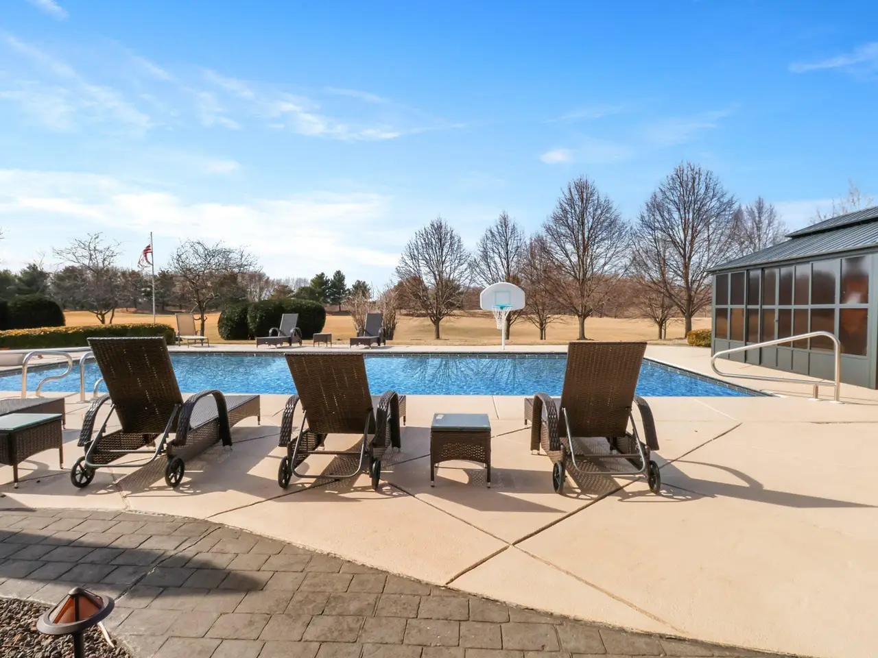 Welcome to a home where modern luxury, timeless design, and everyday comfort come together seamlessly. Nestled on a picturesque .70-acre golf course lot, this completely remodeled estate offers an unparalleled living experience that blends elegance with convenience. From the moment you step through the grand foyer, you are surrounded by refined finishes, thoughtful details, and sweeping views that make every space feel extraordinary. The main level sets the tone for both sophistication and practicality. Rich hardwood floors flow throughout, leading you into a dramatic great room anchored by a cozy fireplace and oversized windows framing the lush golf course beyond. The master suite on the main level provides the ultimate retreat with spa-like finishes, designed to evoke peace and relaxation at the end of the day. A second bedroom on the main level offers flexibility and comfort, complete with an ADA-accessible three-quarter bathroom, making it ideal for extended family or guests. An elegant formal dining room is perfectly suited for gatherings, while a private office with custom built-ins creates a polished space for productivity without sacrificing style. The heart of this home is the gourmet kitchen, designed for both function and entertaining. Featuring newer appliances, abundant cabinetry, and a separate wet bar area tailored for hosting. Upstairs, every bedroom offers its own private bath, ensuring that comfort and privacy are never compromised. A dedicated guest en-suite provides the perfect haven for visitors, while the upper-level laundry room adds convenience to daily routines. The finished basement extends the home's living space with all-new luxury vinyl plank flooring, a full kitchen and bar, 3/4 stunning bath and an expansive entertaining area. Outdoor living is elevated to resort standards with a sparkling in-ground pool, a generous patio, & uninterrupted views of the manicured fairways.