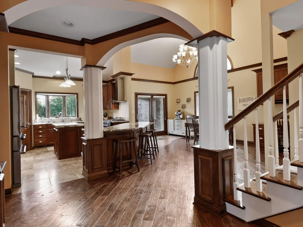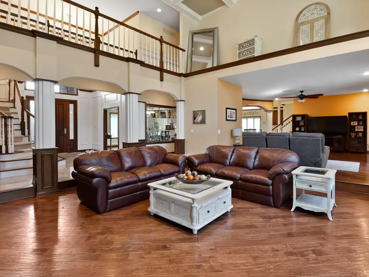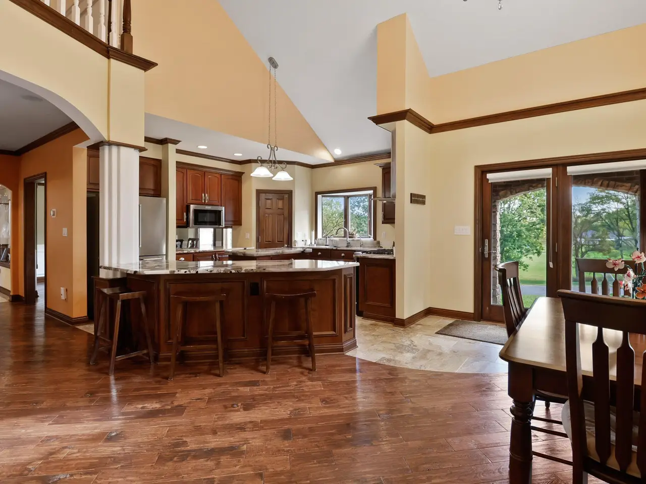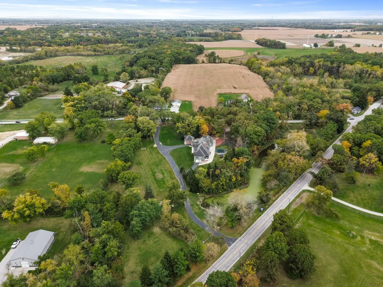 Discover unmatched privacy and elegance with this stunning 7- ACRE estate with PRIVATE POND nestled in the heart of Crown Point. This one-of-a-kind property offers a rare blend of high-end finishes, thoughtful design, and expansive space -- perfect for entertaining or enjoying peaceful country living just minutes from town conveniences. Step inside to find solid hickory floors with cork underlayment, providing superior sound and temperature control throughout. The gourmet kitchen and bathrooms feature exquisite Patagonia marble, creating a striking and luxurious aesthetic. Three all-stone fireplaces add warmth and character to the living spaces. Enjoy year-round comfort with zoned heating and cooling, and the convenience of a walk-in attic for ample storage. The home includes two 80-gallon hot water heaters to easily accommodate large households or guests. On the main level you will find the primary suite that includes a walk-in closet and attached office with fireplace. Step into a luxurious spa like bathroom and admire the custom walk-in shower and soaker tub. Make your way up to the upper level where you will be greeted with an elegant catwalk that leads to more spacious rooms plus a second laundry room! The bonus room is perfect for extra space to relax or entertain! The extravagance doesn't end on the inside with a stocked pond and natural creek to enjoy. You will find two private entrances and a massive driveway that fits up to 35 vehicles -- ideal for gatherings and events. YOU DO NOT WANT TO MISS OUT ON THIS ONCE IN A LIFETIME PROPERTY!