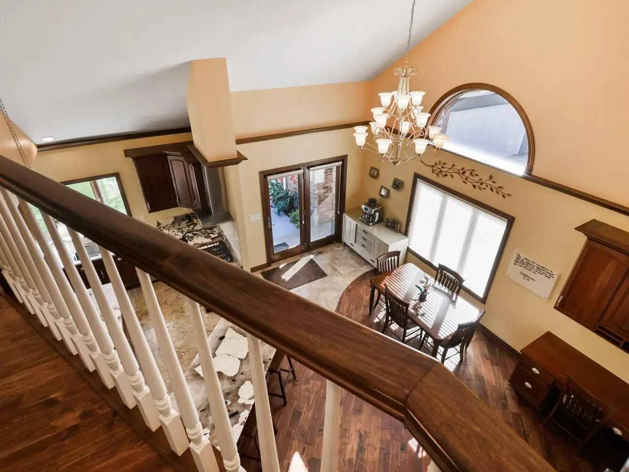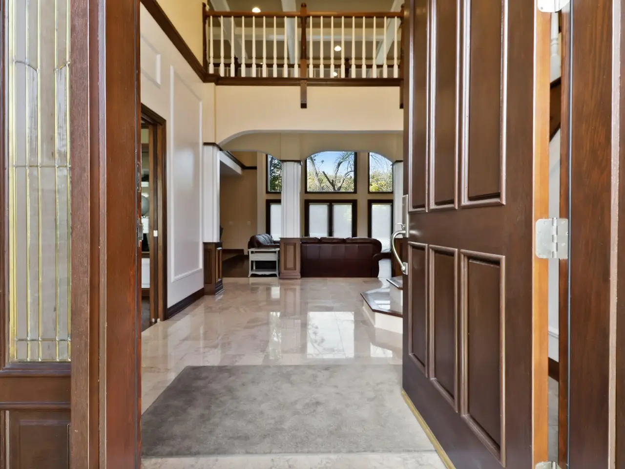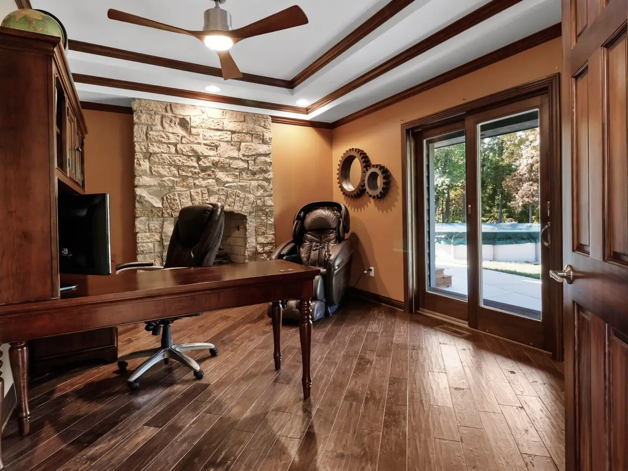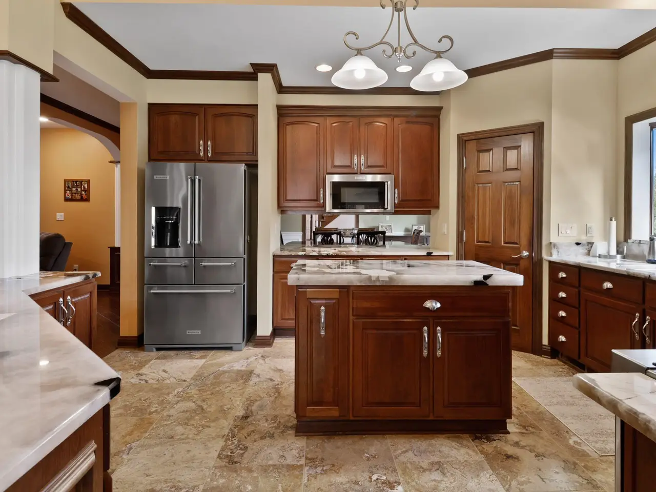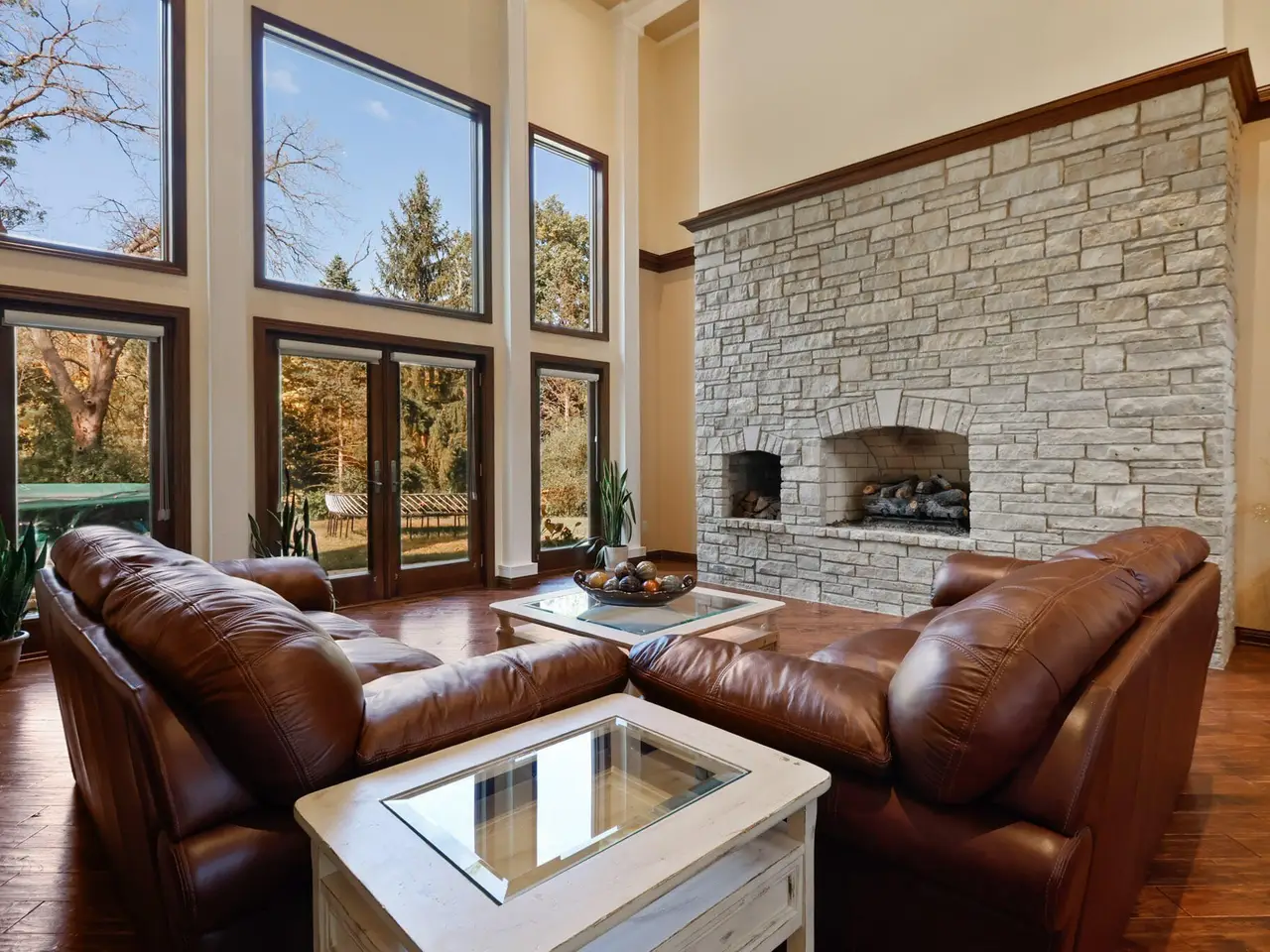 Discover unmatched privacy and elegance with this stunning 7- ACRE estate with PRIVATE POND nestled in the heart of Crown Point. This one-of-a-kind property offers a rare blend of high-end finishes, thoughtful design, and expansive space -- perfect for entertaining or enjoying peaceful country living just minutes from town conveniences. Step inside to find solid hickory floors with cork underlayment, providing superior sound and temperature control throughout. The gourmet kitchen and bathrooms feature exquisite Patagonia marble, creating a striking and luxurious aesthetic. Three all-stone fireplaces add warmth and character to the living spaces. Enjoy year-round comfort with zoned heating and cooling, and the convenience of a walk-in attic for ample storage. The home includes two 80-gallon hot water heaters to easily accommodate large households or guests. On the main level you will find the primary suite that includes a walk-in closet and attached office with fireplace. Step into a luxurious spa like bathroom and admire the custom walk-in shower and soaker tub. Make your way up to the upper level where you will be greeted with an elegant catwalk that leads to more spacious rooms plus a second laundry room! The bonus room is perfect for extra space to relax or entertain! The extravagance doesn't end on the inside with a stocked pond and natural creek to enjoy. You will find two private entrances and a massive driveway that fits up to 35 vehicles -- ideal for gatherings and events. YOU DO NOT WANT TO MISS OUT ON THIS ONCE IN A LIFETIME PROPERTY!