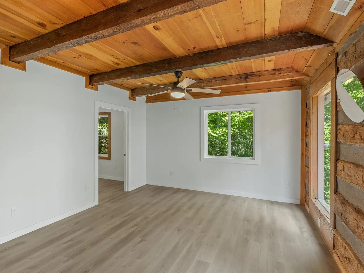 A secluded lakefront retreat nestled on the tranquil shores of Lake Glenville, this reclaimed Chestnut log cabin offers breathtaking views, unmatched serenity, and uncommon privacy. The park-like parcel has both cartpath and step access to the private dock and beach. The spacious living room is anchored by a large wood-burning stone fireplace, creating a warm and inviting atmosphere. The newly updated eat-in kitchen has custom-quality cabinetry and abundant quartz counters, ideal for cooking and entertaining. The primary bedroom is a true sanctuary, with its own private balcony overlooking the lake, a sitting room, ample closet space, and vaulted cathedral ceilings. Downstairs, you'll find a large den with fireplace, and a garage that could be transformed into more living space. The wraparound partially covered deck and a stone fire pit area are perfect for lakeside evenings/dining. Whether a residence or vacation property, this home provides the ultimate lakefront experience.