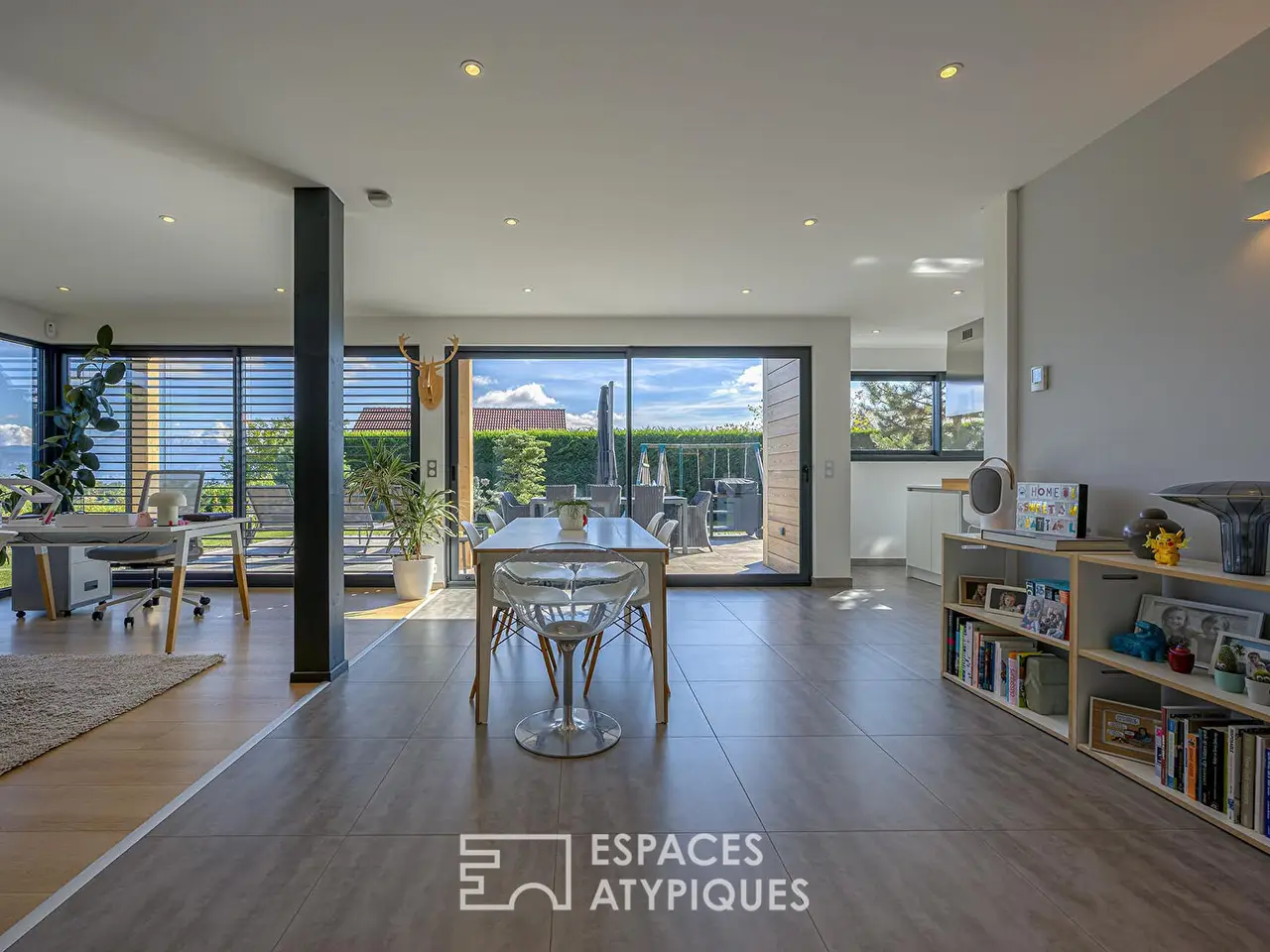 Nestled on the heights of Cuvat, this contemporary house of over 160 sqm Carrez law combines modern comfort, architectural elegance, and an exceptional panorama with an exceptional view.Built on a wooded plot of approximately 800 sqm and fully fenced, this property seduces with its architecture combining traditional construction and a wooden frame.Every detail has been designed to offer a unique living environment.From the entrance, the tone is set: generous volumes, integrated storage, and omnipresent light.The ground floor is organized around a vast living room enhanced by large bay windows extending the space outside with an unobstructed view present on all sides.The living room, the dining room, and the open kitchen, fully fitted and equipped, harmonize seamlessly.A separate laundry room completes this level, designed to combine aesthetics and practicality on a daily basis.Upstairs, a large hallway leads to the sleeping area, which consists of four bright bedrooms, one of which has a separate dressing room.Two elegant bathrooms, both equipped with walk-in showers, complete this level designed to comfortably accommodate an entire family.An additional room offers the possibility of creating an office or a games room, depending on the desires and projects of each individual.Outside, a large terrace offers a natural extension and constitutes a privileged space to enjoy convivial moments facing a magnificent unobstructed view.A wooded garden, a true cocoon of greenery, stands out as a haven of tranquility throughout the seasons.Several parking spaces as well as a garage complete the assets of this property.A successful combination of aesthetics, functionality and openness to nature, this contemporary house represents a rare opportunity in an area sought after for its calm, its quality of life and its exceptional panoramas.Energy class: C / Climate class: AEstimated annual energy expenditure: between EUR2,080 and EUR2,860 (reference year 2021, 2022, 2023)Information on the risks to which this property is exposed is available on the Georisques website: www.georisques.gouv.fr.REF. 2045EAAdditional information* 5 rooms* 4 bedrooms* 2 shower rooms* Floor : 2* Outdoor space : 840 SQM* Parking : 3 parking spaces* Property tax : 1 280 €Energy Performance CertificatePrimary energy consumptionc : 164 kWh/m2.yearHigh performance housing*A*B*164kWh/m2.yearC*D*E*F*GExtremely poor housing performanceEstimated average annual energy costs for standard use, indexed to specific years 2021, 2022, 2023 : between 2080 € and 2860 € Subscription IncludedAgency feesThe fees include VAT and are payable by the vendorMediatorMediation Franchise-Consommateurswww.mediation-franchise.com29 Boulevard de Courcelles 75008 ParisInformation on the risks to which this property is exposed is available on the Geohazards website : www.georisques.gouv.fr