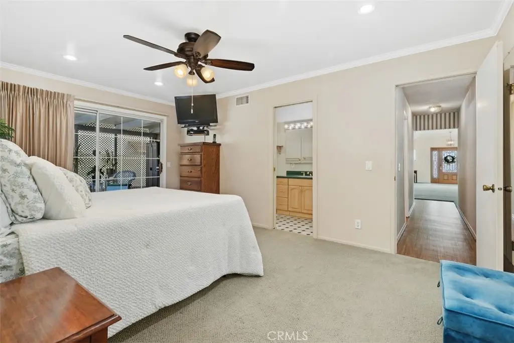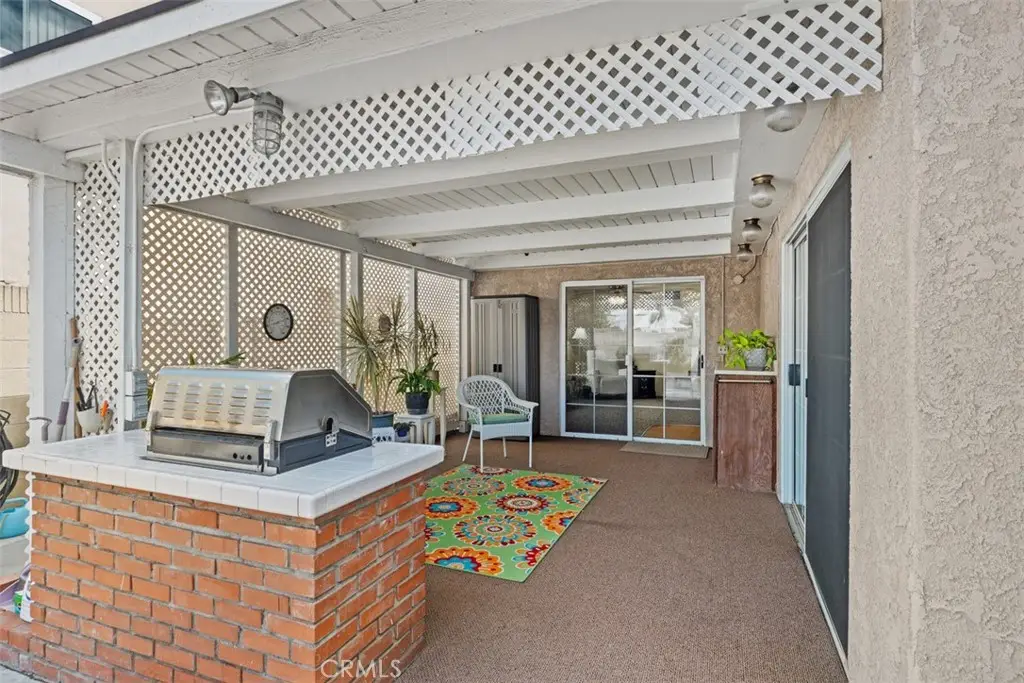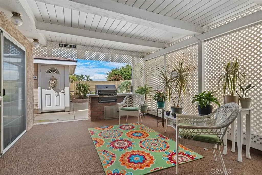 Beautifully maintained home with approx. 1,765 sq. ft. living space, backing to the Navy Golf Course. Step inside to a spacious living room with can lighting, coffered ceiling, fireplace, custom cabinetry, and a built-in bar. The remodeled kitchen features stone countertops, a custom island, and large windows overlooking the yard, flowing into the family area for easy entertaining. The expanded master suite includes a large walk-in closet, updated bathroom, and patio door to the private yard. Additional highlights include dual-pane windows, copper repipe, forced air heating, central air conditioning, ceiling fans, and soft water system. The finished two-car garage includes custom cabinetry, attic storage, and a laundry area with sink. Outdoor living features a covered patio, artificial turf, low-maintenance landscaping, and spa with custom gazebo. Conveniently located near the 405, 605, and 22 freeways, with nearby shopping (including Costco, Trader Joe's), parks, and award-winning schools: Patton Elementary, Bell Intermediate, and Pacifica High School.