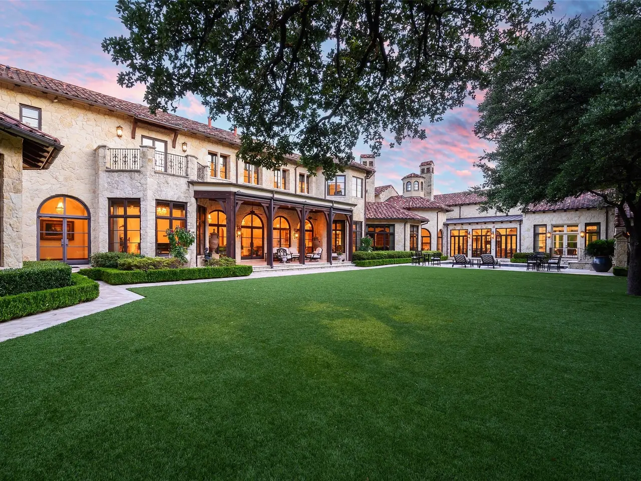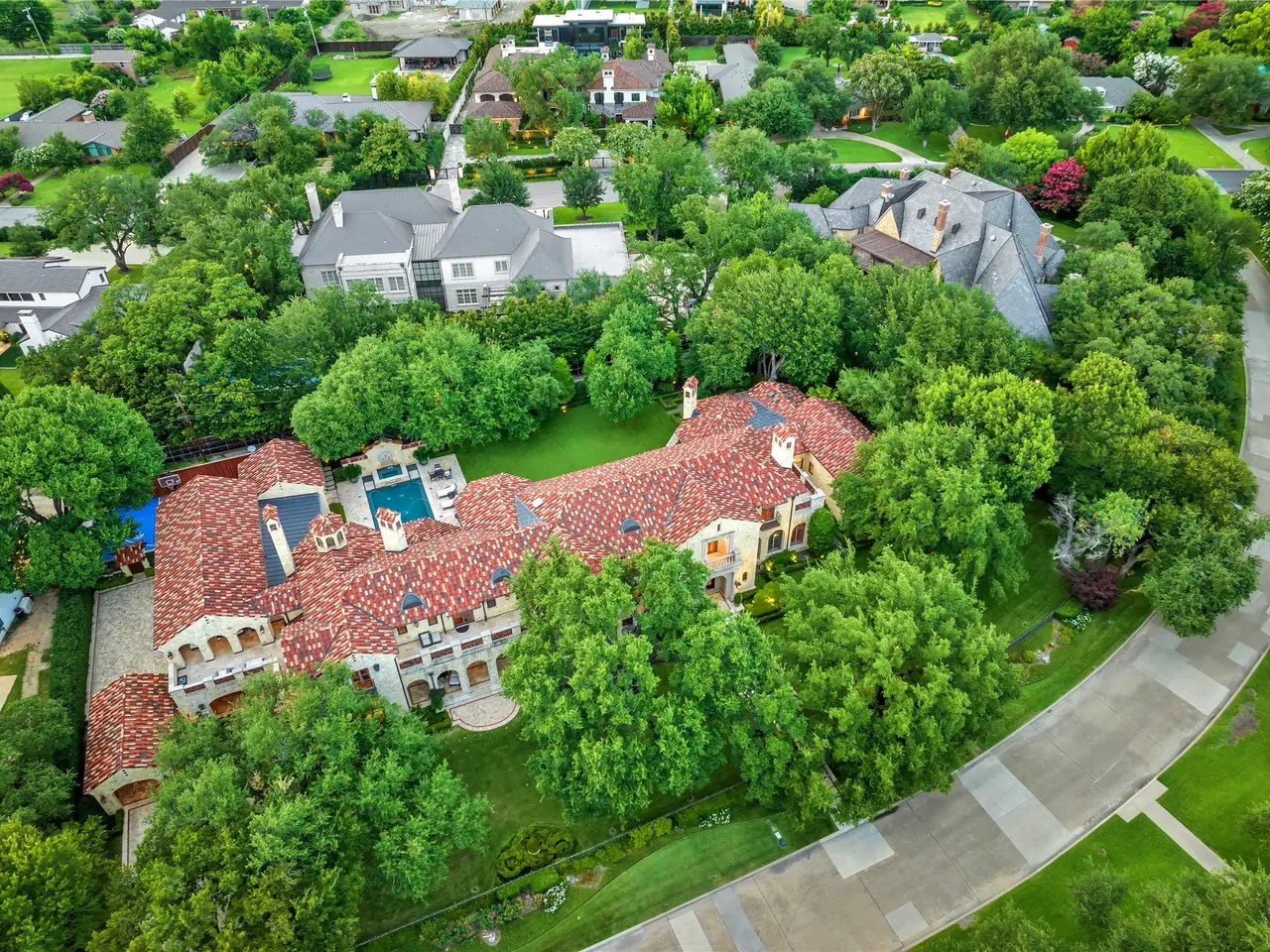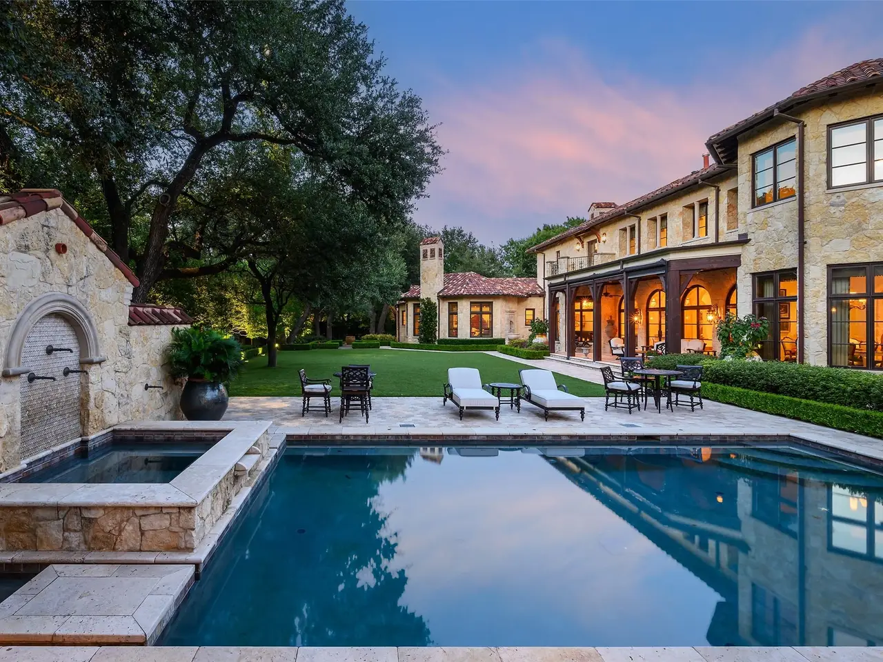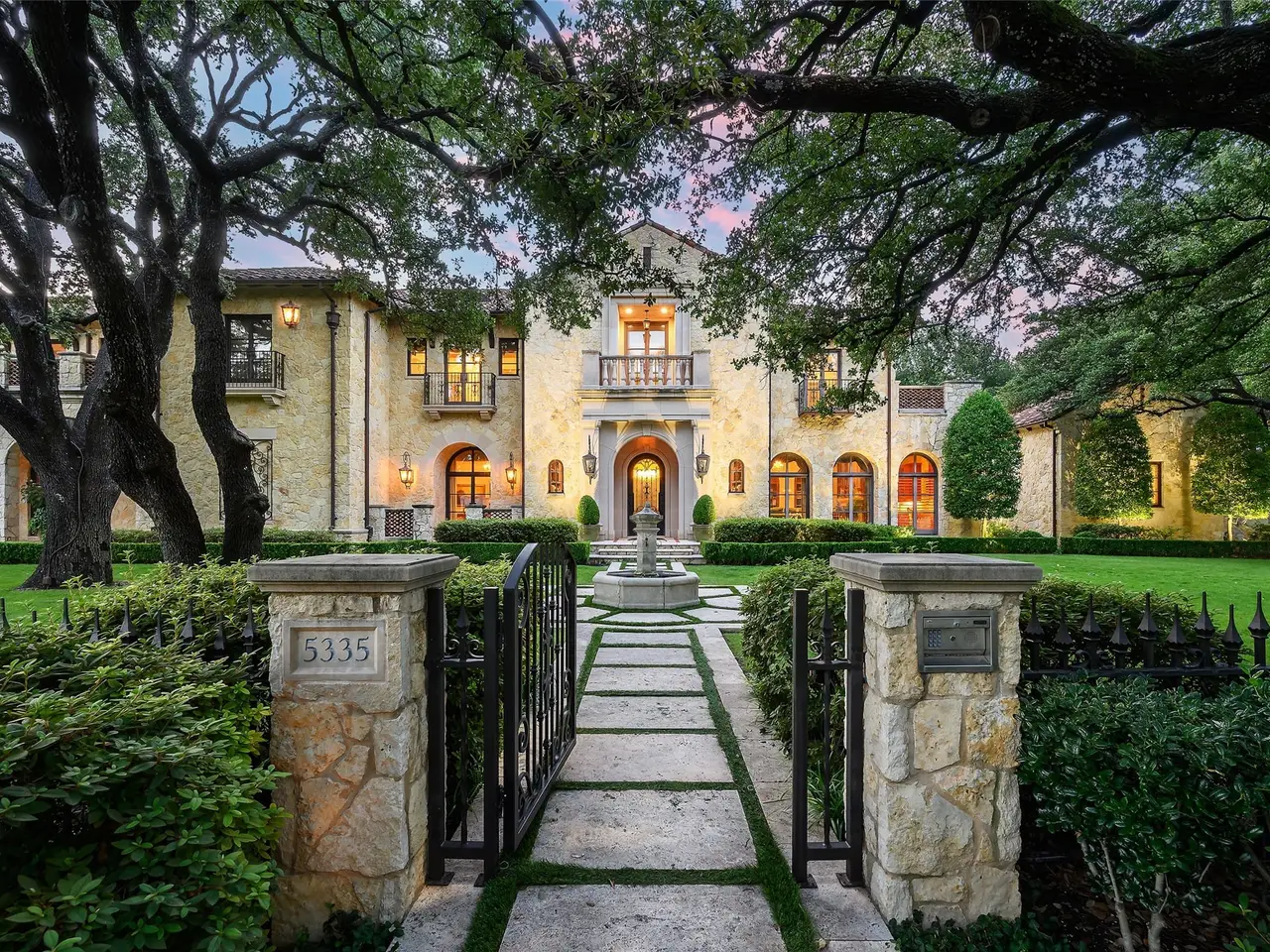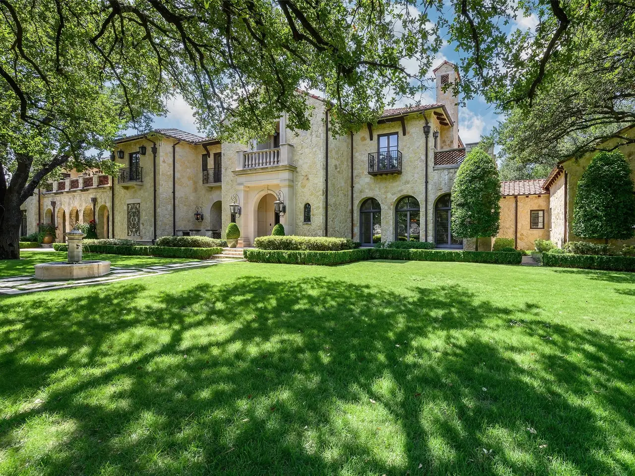 Inspired by the grand villas of the Tuscan countryside, this commanding, completely gated estate at 5335 Meaders Lane rests on a lot and a half. Its expansive presence stretching nearly a block along one of Preston Hollows most admired neighborhoods in Mayflower Estates. Designed by noted architect Elby Martin and built by Bob Thompson, one of Dallas’ most respected high-end builders, this residence captures the soul of a Tuscan mansion with modern livability. From the Italian-barrel tile roof to stately stone exteriors, every detail feels authentic. Lush grounds unfold over 1.1 acres, enhanced by moonlit mature trees, two courtyards, including a private meditation garden, and four hand-crafted fountains. Multiple verandas, terraces, and six balconies - all with beautiful sweeping views - create effortless indoor-outdoor living. A resort-style pool with cascading spouts, a just-completed sport court, and a fully appointed cabana with kitchen, fireplace, and dome ceiling set the stage for year-round entertaining. The property also offers a 1,159 square foot attached guest or au pair house with its own private exterior staircase and convenient parking pads. Inside, artistry and craftsmanship abound: a 24-foot ceiling entry with custom Solara iron stair, a 70-ft groin-vaulted gallery with hand-painted Italian frescoes, wine cellar and tasting room, billiard and game rooms, and a media room with motorized recliners. Clerestory windows frame sweeping estate views, underscoring the home’s connection to its surroundings. With geothermal HVAC, a recently installed whole-house generator, and thoughtful design, this is an extraordinary Tuscan-inspired retreat - expansive in scale, commanding in presence, and unrivaled in its Dallas setting.