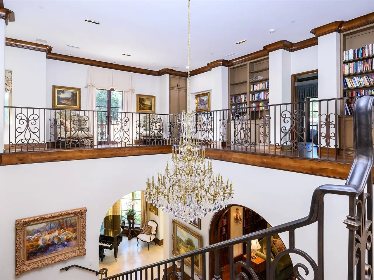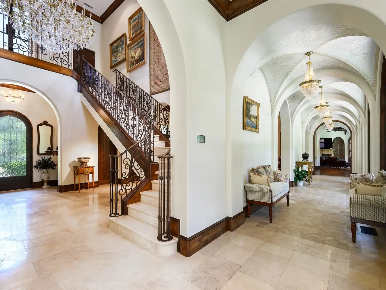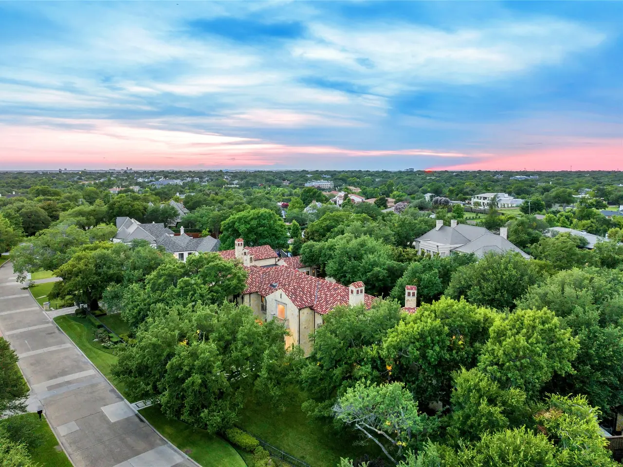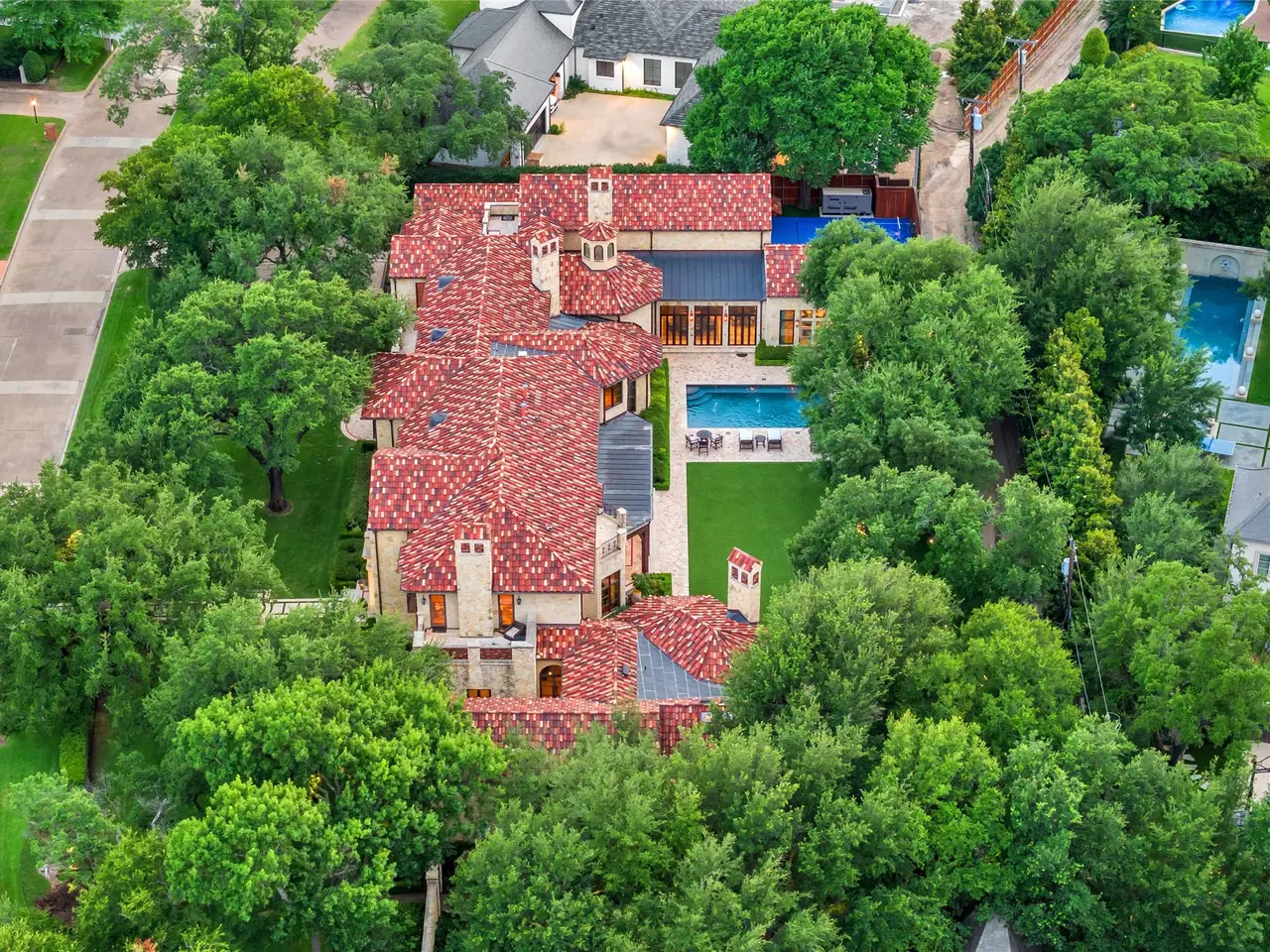 Inspired by the grand villas of the Tuscan countryside, this commanding, completely gated estate at 5335 Meaders Lane rests on a lot and a half. Its expansive presence stretching nearly a block along one of Preston Hollows most admired neighborhoods in Mayflower Estates. Designed by noted architect Elby Martin and built by Bob Thompson, one of Dallas’ most respected high-end builders, this residence captures the soul of a Tuscan mansion with modern livability. From the Italian-barrel tile roof to stately stone exteriors, every detail feels authentic. Lush grounds unfold over 1.1 acres, enhanced by moonlit mature trees, two courtyards, including a private meditation garden, and four hand-crafted fountains. Multiple verandas, terraces, and six balconies - all with beautiful sweeping views - create effortless indoor-outdoor living. A resort-style pool with cascading spouts, a just-completed sport court, and a fully appointed cabana with kitchen, fireplace, and dome ceiling set the stage for year-round entertaining. The property also offers a 1,159 square foot attached guest or au pair house with its own private exterior staircase and convenient parking pads. Inside, artistry and craftsmanship abound: a 24-foot ceiling entry with custom Solara iron stair, a 70-ft groin-vaulted gallery with hand-painted Italian frescoes, wine cellar and tasting room, billiard and game rooms, and a media room with motorized recliners. Clerestory windows frame sweeping estate views, underscoring the home’s connection to its surroundings. With geothermal HVAC, a recently installed whole-house generator, and thoughtful design, this is an extraordinary Tuscan-inspired retreat - expansive in scale, commanding in presence, and unrivaled in its Dallas setting.