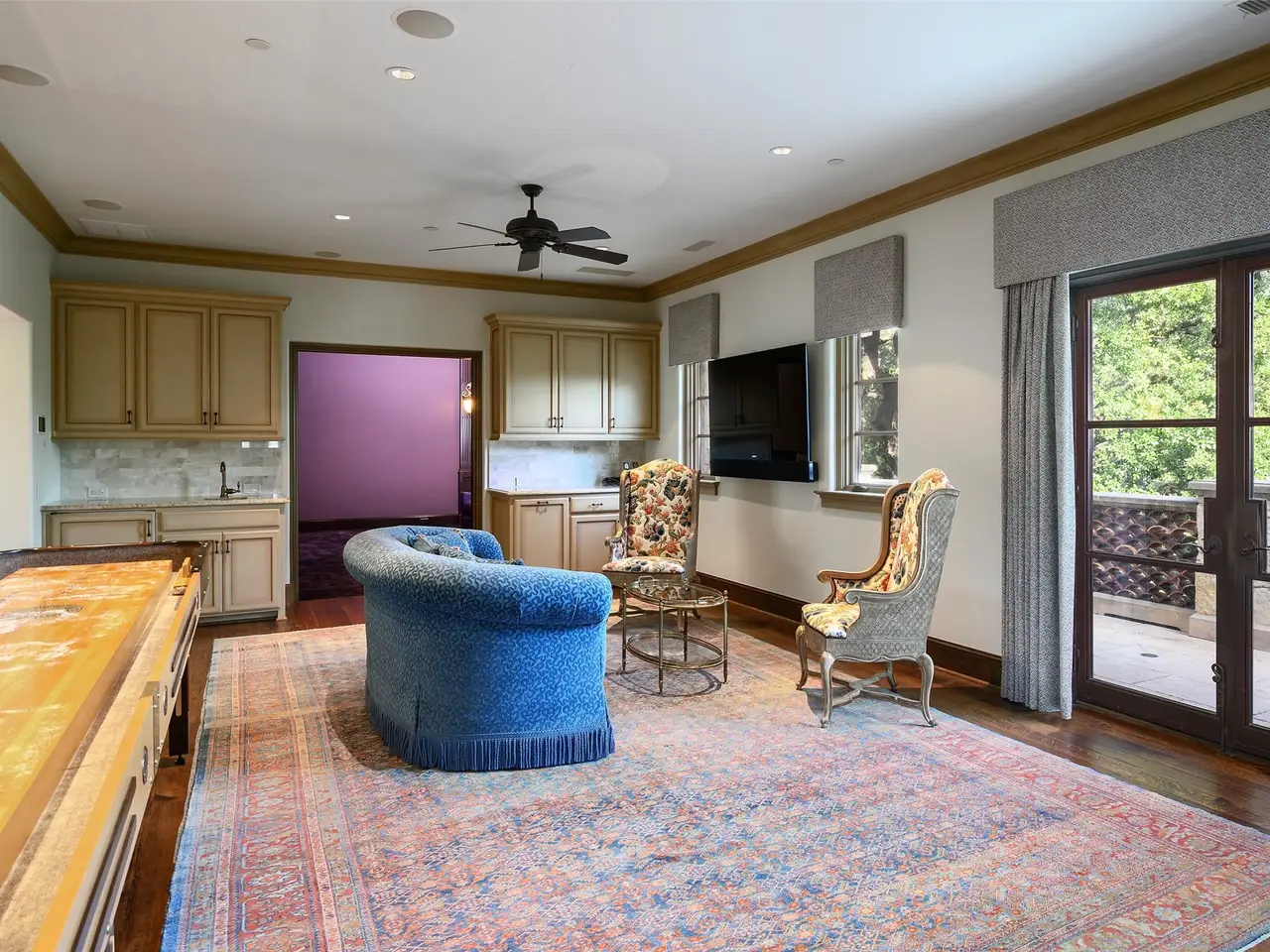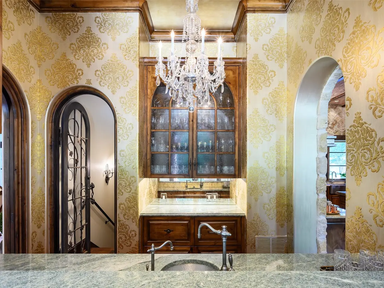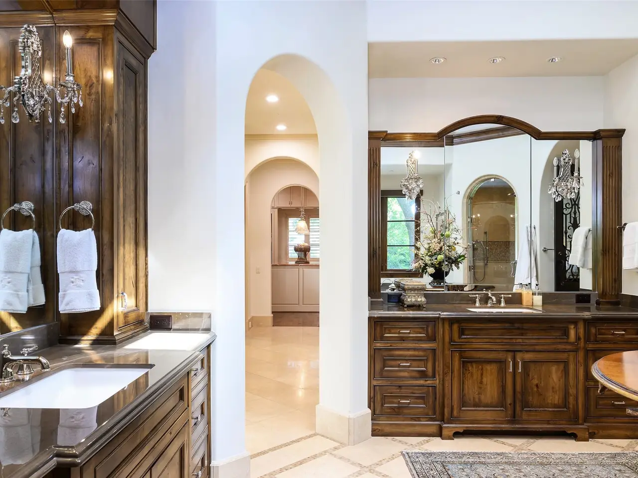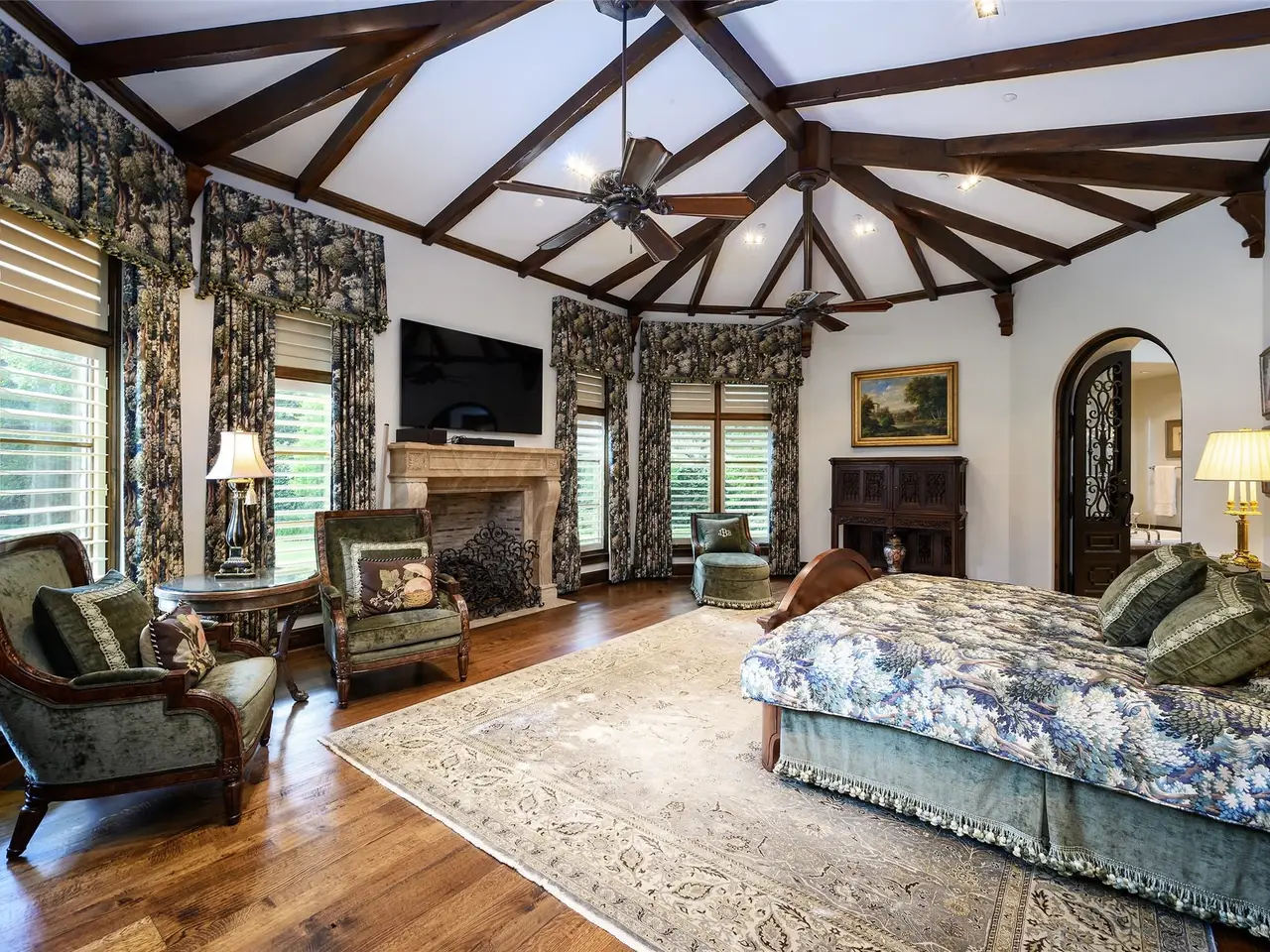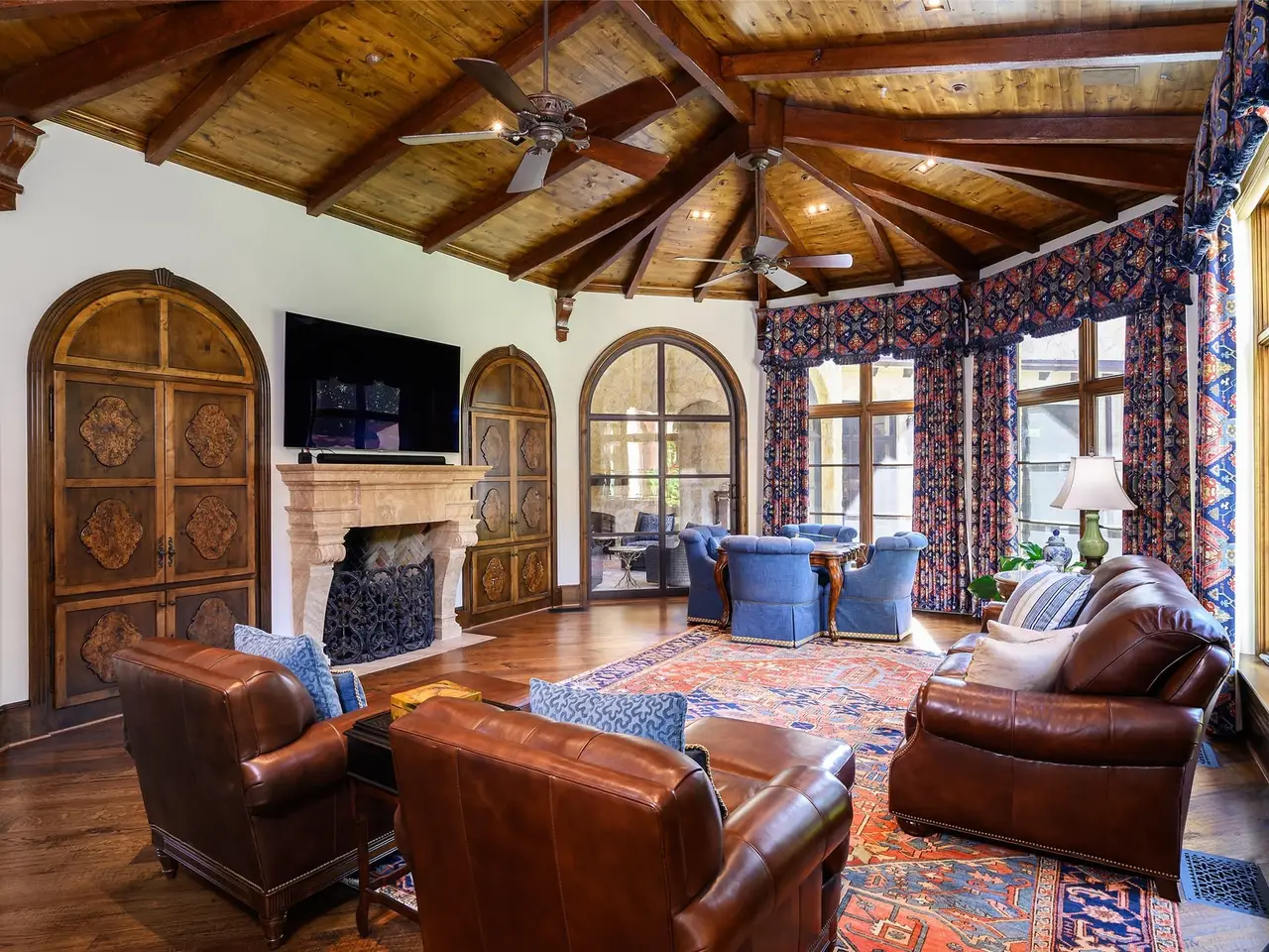 Inspired by the grand villas of the Tuscan countryside, this commanding, completely gated estate at 5335 Meaders Lane rests on a lot and a half. Its expansive presence stretching nearly a block along one of Preston Hollows most admired neighborhoods in Mayflower Estates. Designed by noted architect Elby Martin and built by Bob Thompson, one of Dallas’ most respected high-end builders, this residence captures the soul of a Tuscan mansion with modern livability. From the Italian-barrel tile roof to stately stone exteriors, every detail feels authentic. Lush grounds unfold over 1.1 acres, enhanced by moonlit mature trees, two courtyards, including a private meditation garden, and four hand-crafted fountains. Multiple verandas, terraces, and six balconies - all with beautiful sweeping views - create effortless indoor-outdoor living. A resort-style pool with cascading spouts, a just-completed sport court, and a fully appointed cabana with kitchen, fireplace, and dome ceiling set the stage for year-round entertaining. The property also offers a 1,159 square foot attached guest or au pair house with its own private exterior staircase and convenient parking pads. Inside, artistry and craftsmanship abound: a 24-foot ceiling entry with custom Solara iron stair, a 70-ft groin-vaulted gallery with hand-painted Italian frescoes, wine cellar and tasting room, billiard and game rooms, and a media room with motorized recliners. Clerestory windows frame sweeping estate views, underscoring the home’s connection to its surroundings. With geothermal HVAC, a recently installed whole-house generator, and thoughtful design, this is an extraordinary Tuscan-inspired retreat - expansive in scale, commanding in presence, and unrivaled in its Dallas setting.