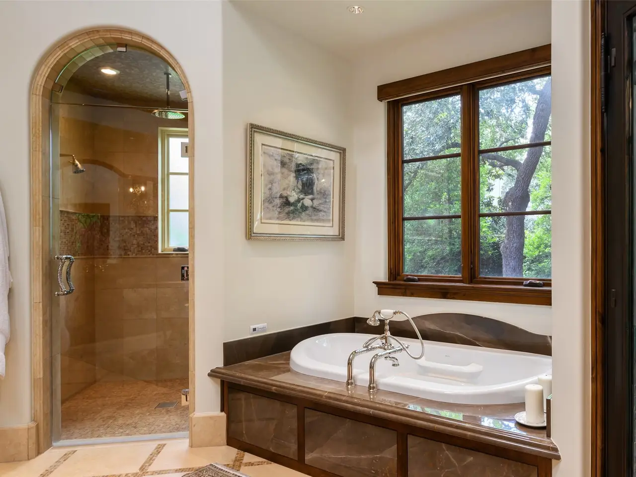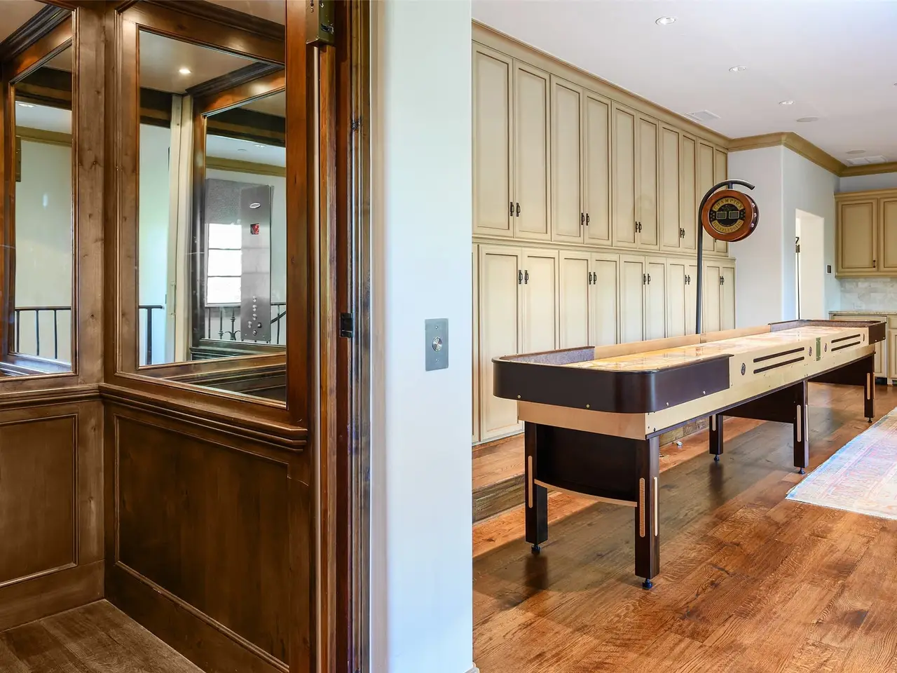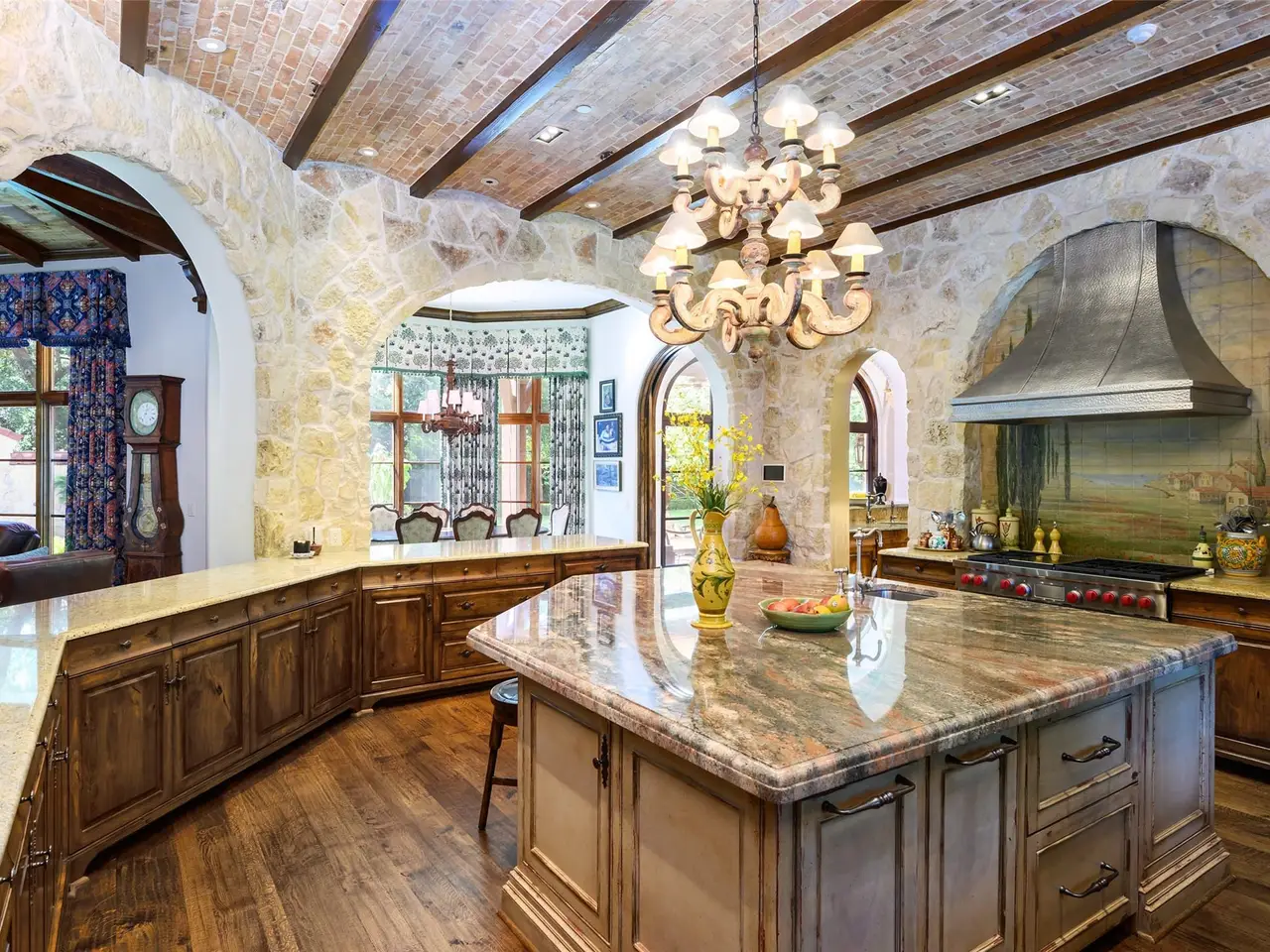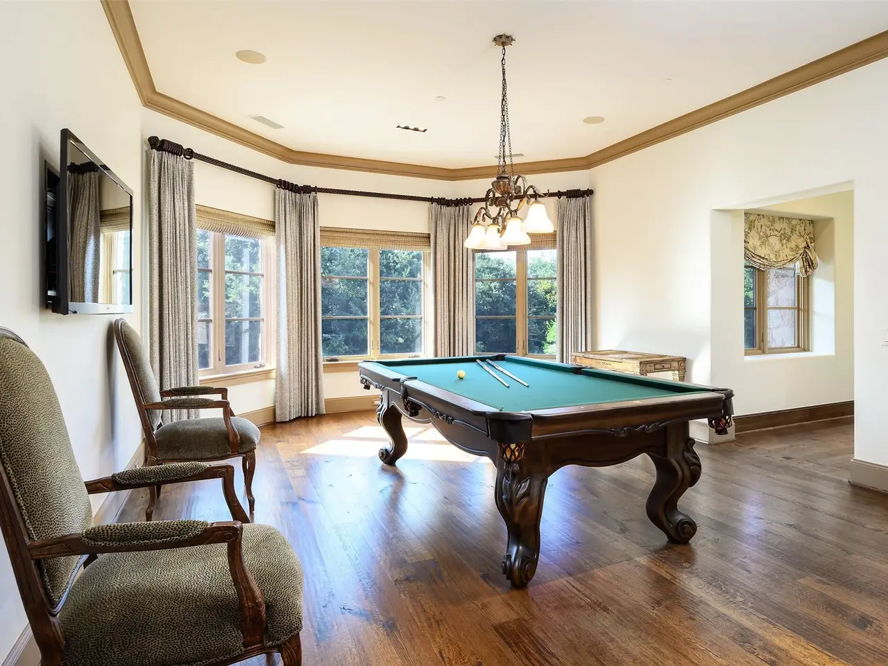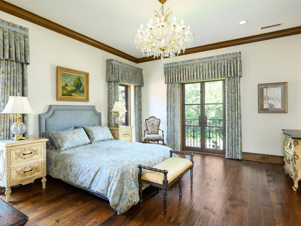 Inspired by the grand villas of the Tuscan countryside, this commanding, completely gated estate at 5335 Meaders Lane rests on a lot and a half. Its expansive presence stretching nearly a block along one of Preston Hollows most admired neighborhoods in Mayflower Estates. Designed by noted architect Elby Martin and built by Bob Thompson, one of Dallas’ most respected high-end builders, this residence captures the soul of a Tuscan mansion with modern livability. From the Italian-barrel tile roof to stately stone exteriors, every detail feels authentic. Lush grounds unfold over 1.1 acres, enhanced by moonlit mature trees, two courtyards, including a private meditation garden, and four hand-crafted fountains. Multiple verandas, terraces, and six balconies - all with beautiful sweeping views - create effortless indoor-outdoor living. A resort-style pool with cascading spouts, a just-completed sport court, and a fully appointed cabana with kitchen, fireplace, and dome ceiling set the stage for year-round entertaining. The property also offers a 1,159 square foot attached guest or au pair house with its own private exterior staircase and convenient parking pads. Inside, artistry and craftsmanship abound: a 24-foot ceiling entry with custom Solara iron stair, a 70-ft groin-vaulted gallery with hand-painted Italian frescoes, wine cellar and tasting room, billiard and game rooms, and a media room with motorized recliners. Clerestory windows frame sweeping estate views, underscoring the home’s connection to its surroundings. With geothermal HVAC, a recently installed whole-house generator, and thoughtful design, this is an extraordinary Tuscan-inspired retreat - expansive in scale, commanding in presence, and unrivaled in its Dallas setting.