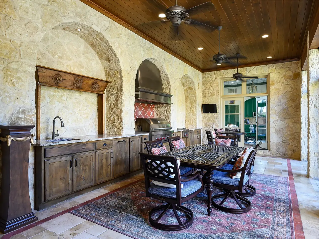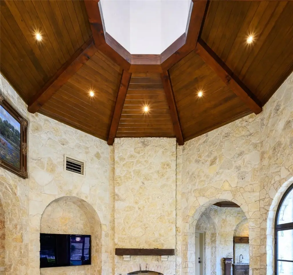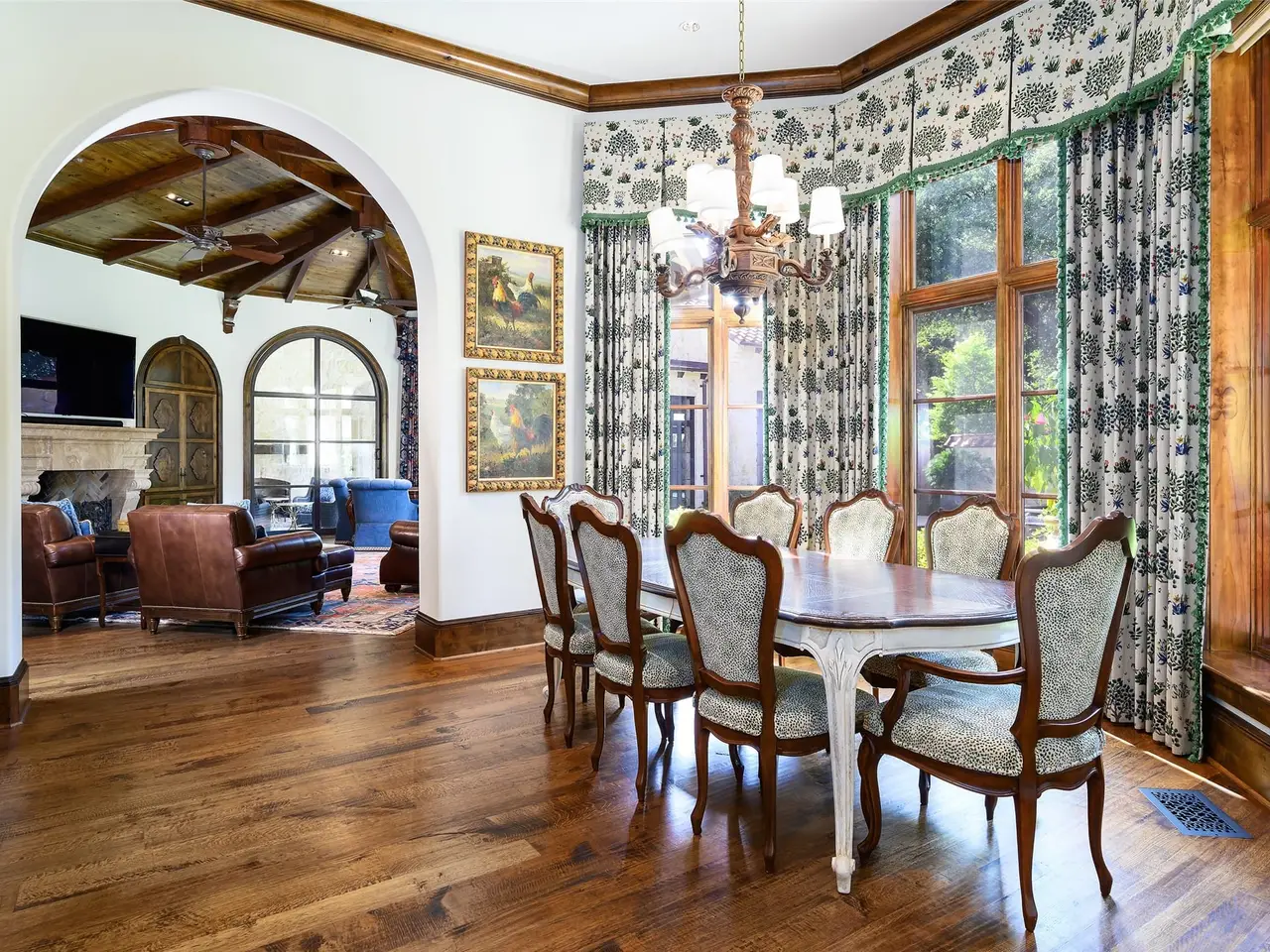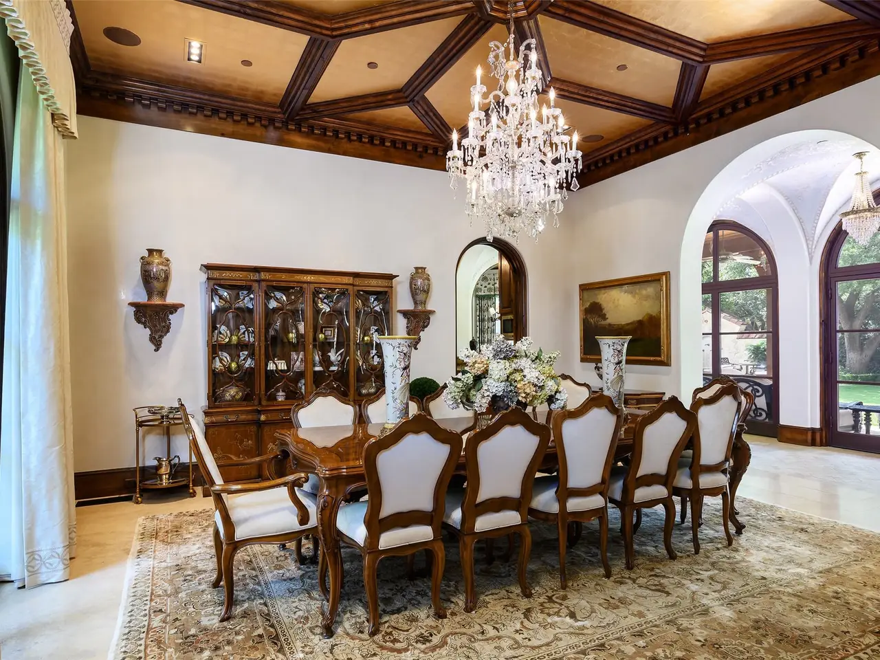 Inspired by the grand villas of the Tuscan countryside, this commanding, completely gated estate at 5335 Meaders Lane rests on a lot and a half. Its expansive presence stretching nearly a block along one of Preston Hollows most admired neighborhoods in Mayflower Estates. Designed by noted architect Elby Martin and built by Bob Thompson, one of Dallas’ most respected high-end builders, this residence captures the soul of a Tuscan mansion with modern livability. From the Italian-barrel tile roof to stately stone exteriors, every detail feels authentic. Lush grounds unfold over 1.1 acres, enhanced by moonlit mature trees, two courtyards, including a private meditation garden, and four hand-crafted fountains. Multiple verandas, terraces, and six balconies - all with beautiful sweeping views - create effortless indoor-outdoor living. A resort-style pool with cascading spouts, a just-completed sport court, and a fully appointed cabana with kitchen, fireplace, and dome ceiling set the stage for year-round entertaining. The property also offers a 1,159 square foot attached guest or au pair house with its own private exterior staircase and convenient parking pads. Inside, artistry and craftsmanship abound: a 24-foot ceiling entry with custom Solara iron stair, a 70-ft groin-vaulted gallery with hand-painted Italian frescoes, wine cellar and tasting room, billiard and game rooms, and a media room with motorized recliners. Clerestory windows frame sweeping estate views, underscoring the home’s connection to its surroundings. With geothermal HVAC, a recently installed whole-house generator, and thoughtful design, this is an extraordinary Tuscan-inspired retreat - expansive in scale, commanding in presence, and unrivaled in its Dallas setting.