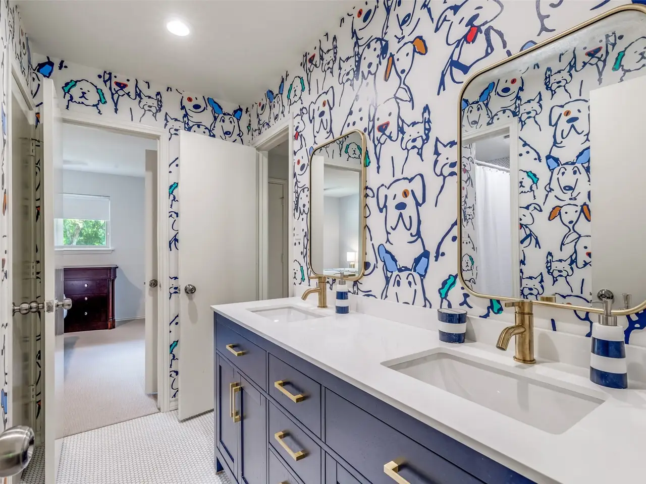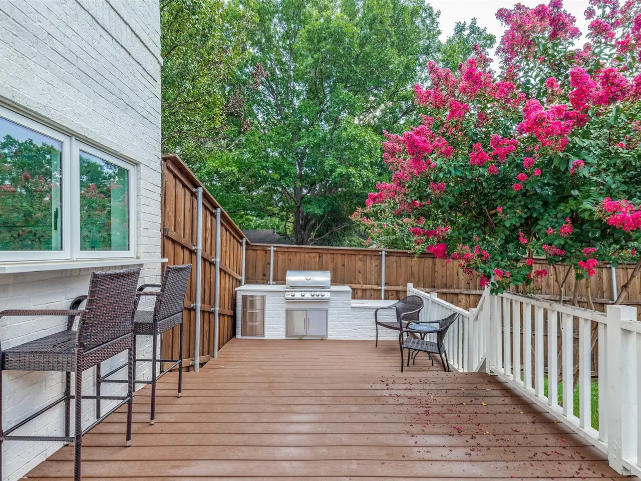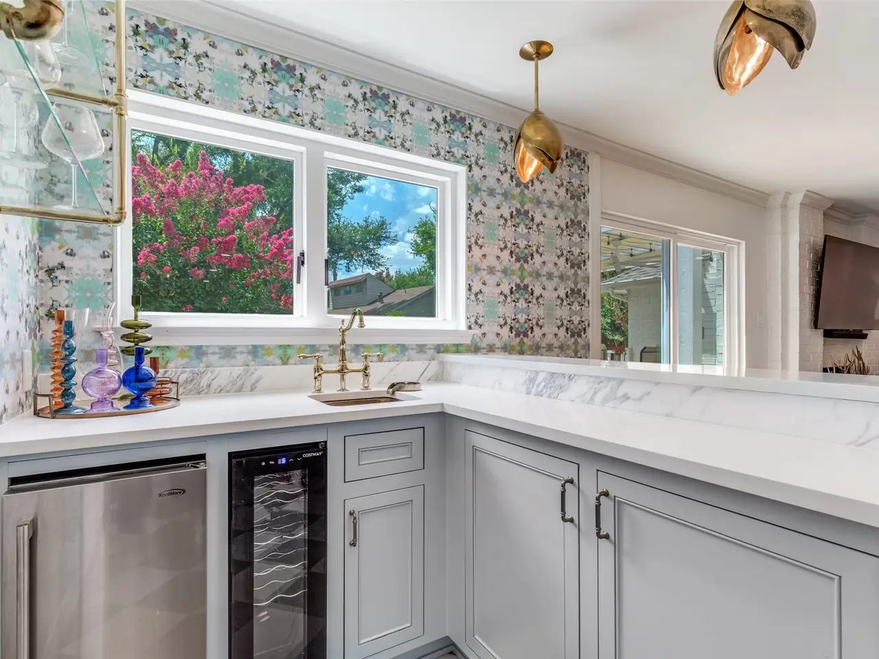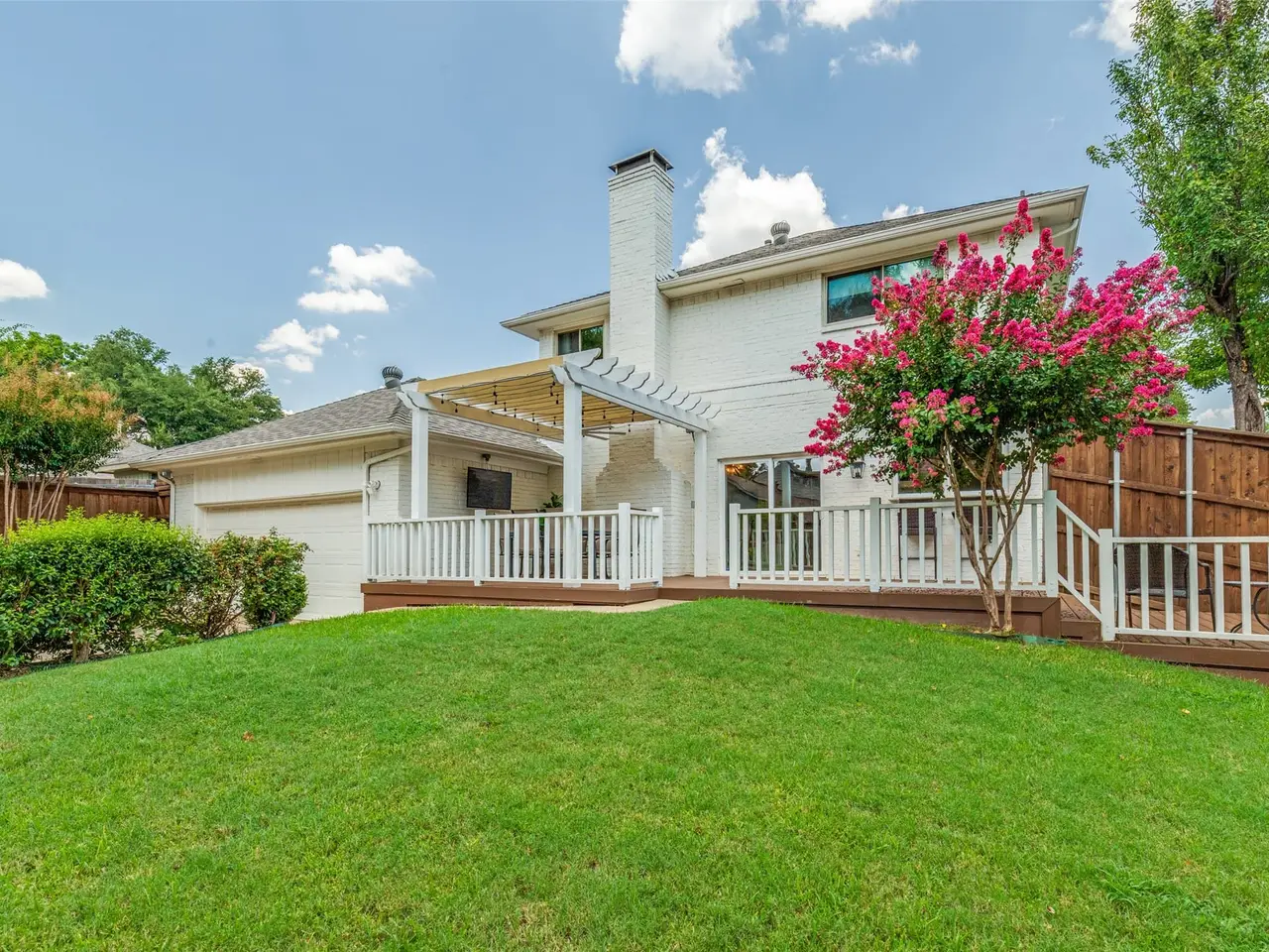 Welcome to this designer renovated Lake Highlands gem, a one of a kind home featured in design publications and curated by Emory McKim Design. Situated on a professionally landscaped and lighted quiet corner lot in the highly sought after, Moss Haven Elementary, this 4 bedroom, 2.5 bath property blends family functionality with elevated style and finishes. Offering an open floor plan and fully renovated in 2023, this special home boasts a custom kitchen with granite tops, Italian marble backsplash, Zline gas range, Bosch dishwasher, Monogram refrigerator, custom built cabinetry and window treatments. Open wet bar wrapped in iconic Laura Park wallpaper with icemaker and pass through window to custom Trex deck, grill, outdoor living area with pergola. Spacious first floor Primary suite with marble bath and custom tile and wallpaper, Formal Dining Room with avocado color walls and custom drapes, has pocket door to kitchen. Every space in this designer home is move in ready and thoughtfully designed. This home is the perfect blend of comfort, character and curb appeal.
