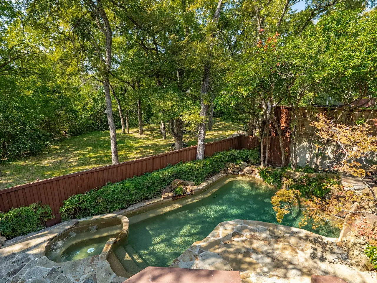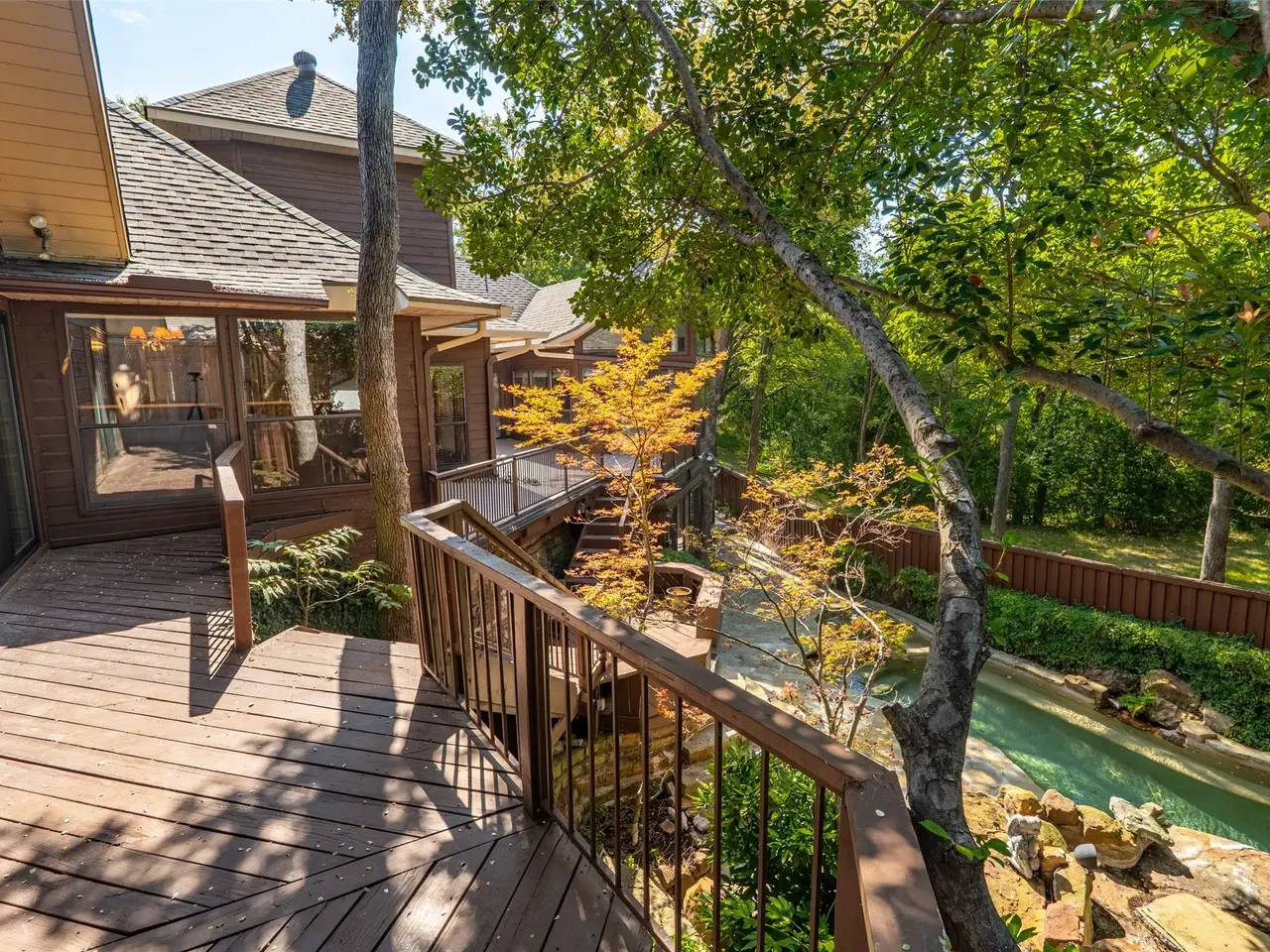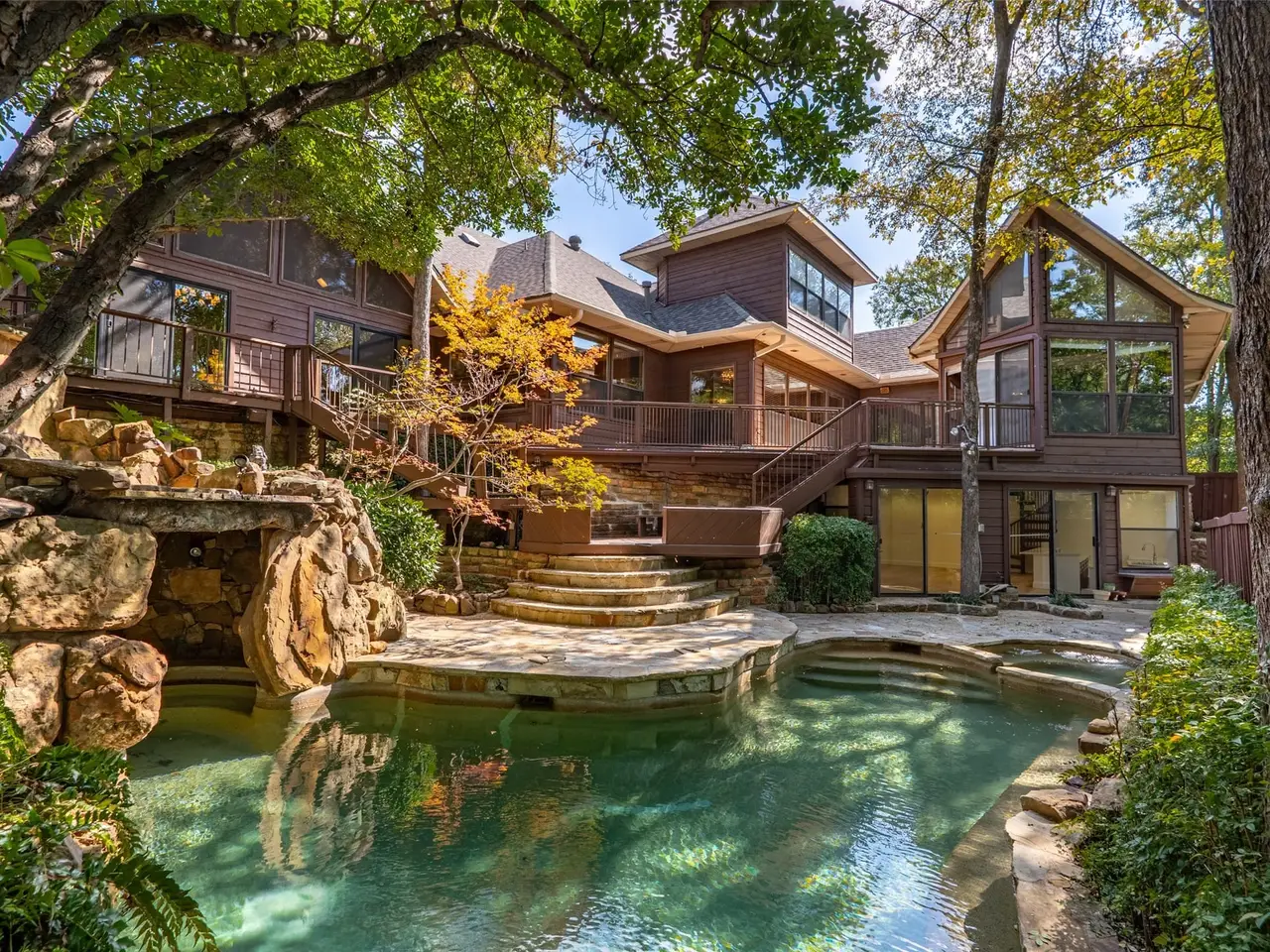 Welcome to a truly exceptional opportunity in the heart of Town Creek, one of Lake Highlands' most cherished neighborhoods. Set on an expansive 86 x 149 lot, this home offers 5,534 square feet of inspired living space plus a rare, finished 1,172 sq ft basement with direct walk-out access to a lush sanctuary of a backyard. Whether youre seeking a dream renovation that honors the original character or a foundation for modern luxury, this home is a rare gem blending location, layout, and lifestyle. Inside, soaring vaulted ceilings and oversized living spaces create a warm, grand ambiance. Custom built-in cabinetry throughout adds timeless charm and storage. A wall of windows in the living room overlooks the show-stopping three-tiered wooden deck, complete with a pool, natural grotto, and panoramic views of the treelined creek. From the distinct entryway, you enter the foyer to an open and inviting floor plan. The gourmet kitchen opens up to an eat-in breakfast area with a step down living space and walk-in wet bar. The office just off the primary creates a tree-house effect with windows overlooking the abundant trees. Upstairs, there are three bedrooms each accompanied with an en-suite bathroom. The third bedroom could easily be converted to another entertainment space or game room. Accessible via a beautiful spiral staircase, the fully finished downstairs offers an unexpected and versatile bonus: a full galley kitchen, elegant tile flooring, a full bath, and a dedicated safe room. Glass sliding doors open directly to the backyard oasis, creating the perfect space for entertaining, multigenerational living, a private guest retreat, or a one-of-a-kind creative studio. Backed by nature and surrounded by a close-knit community, this home boasts direct access to scenic creek-side trails, ideal for morning walks, evening runs, or simply soaking in the serenity. Town Creek isn't just a neighborhood, it's defined by beautiful surroundings and a welcoming spirit.