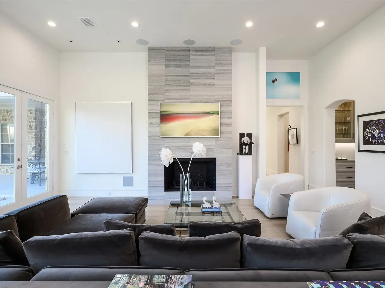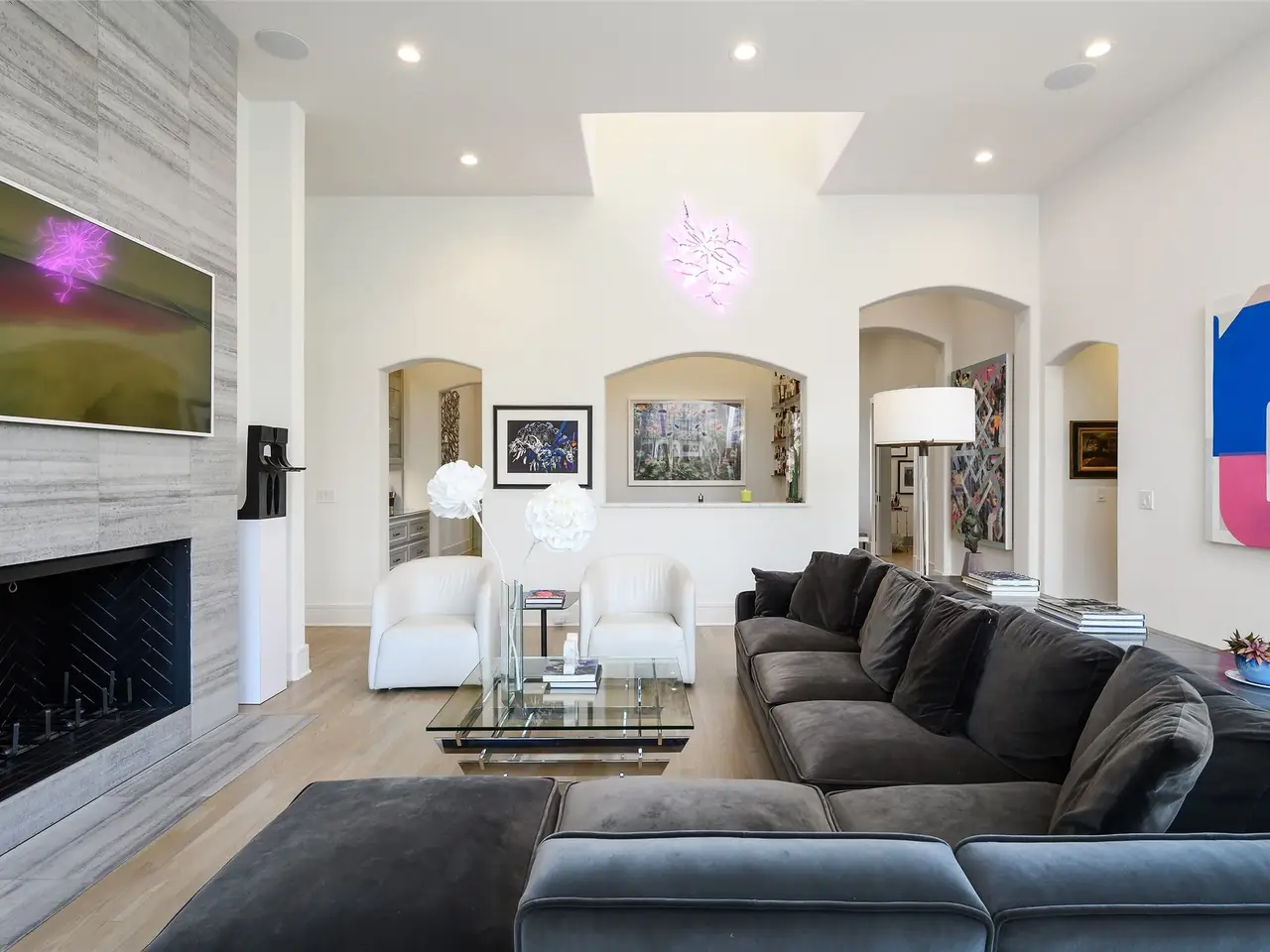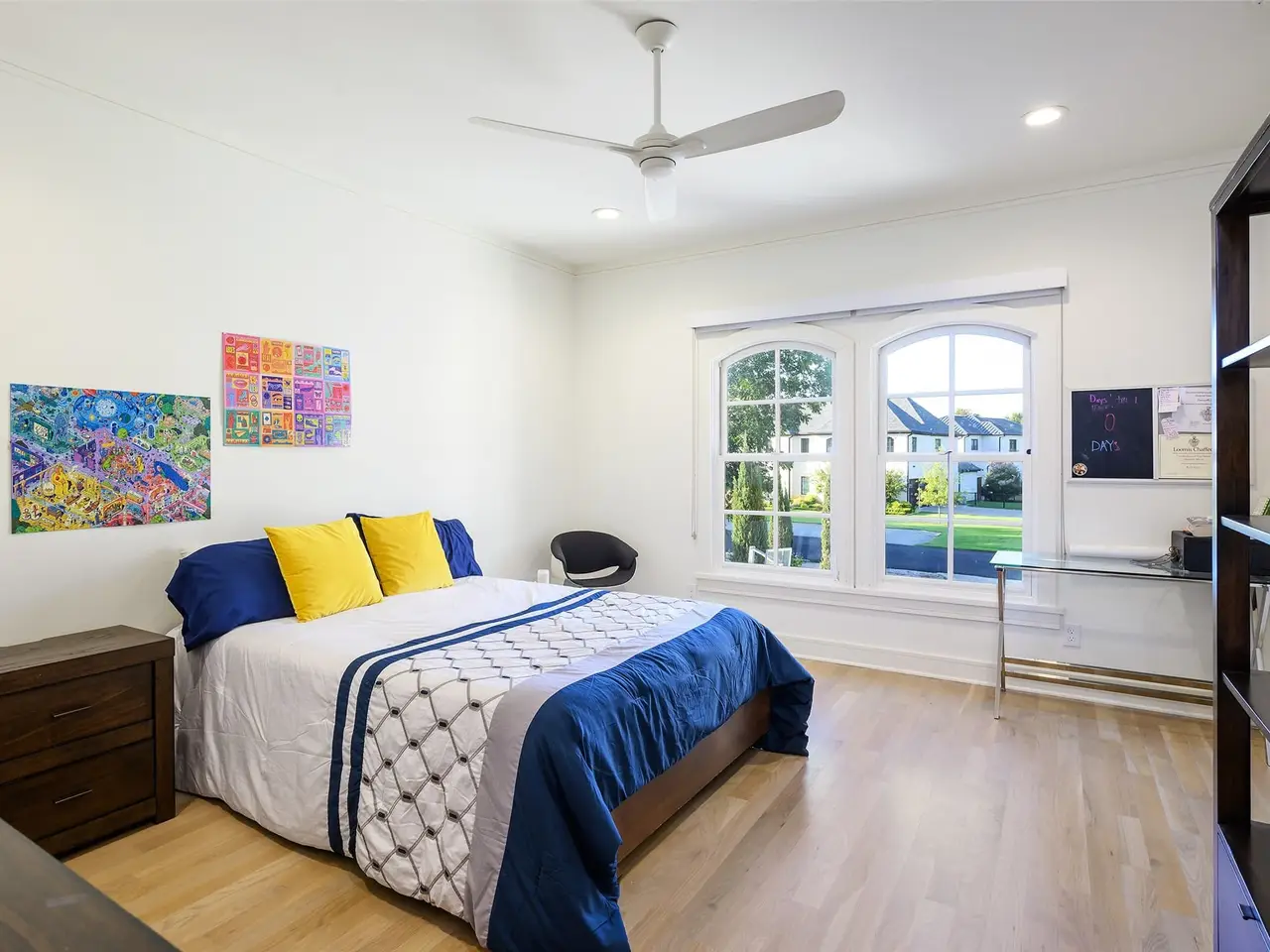 This light-filled home in the ESD-private school corridor was substantially rebuilt and renovated by one of Dallas' highest end builders, Paul Pastore of Waterside Homes circa 2021 - 2022. The 6,030 square foot home on an oversized 0.4+ acre lot blends transitional elegance with newer construction quality in one of Dallas' rising Preston Hollow neighborhoods. Inside, rich, recently installed hardwood flooring, designer lighting and architectural beams set the tone for refined living. A generous entry leads to a formal living room with a stately fireplace and pocket doors, ideal for privacy when used as a home office. The large formal dining room flows effortlessly into the main living area, where a dramatic fireplace, vaulted ceilings and views of the backyard create a stunning focal point. Adjacent to this inviting space, a well-appointed wet bar with wine refrigeration enhances the home's exceptional flow for entertaining. In the heart of the home is a true chef's kitchen, anchored by recently purchased Wolf and Sub-Zero appliances and dual sinks with resilient Quartz counters, that opens to a light-filled breakfast room. The main-level primary suite offers vaulted beam ceilings, French doors to the patio, a spacious walk-in closet and a spa bath with a soaking tub and oversized glass shower. A guest suite, laundry and two powder rooms complete the downstairs. Upstairs, three bedrooms with en suite bathrooms and a media or game room with bonus full bath complement the thoughtful floor plan. Major improvements since 2021 include a new roof and windows, updated plumbing, electrical, insulation, cabinetry, appliances, wood flooring, zoned Lennox HVAC systems and ductwork and two tankless water heaters. Savant smart home integration, Cat 6 wiring, a seven-zone sound system (full downstairs, patio and upstairs game room), and security cameras ensure modern comfort. An attached three-car garage and substantial storage throughout the home add convenience to style.