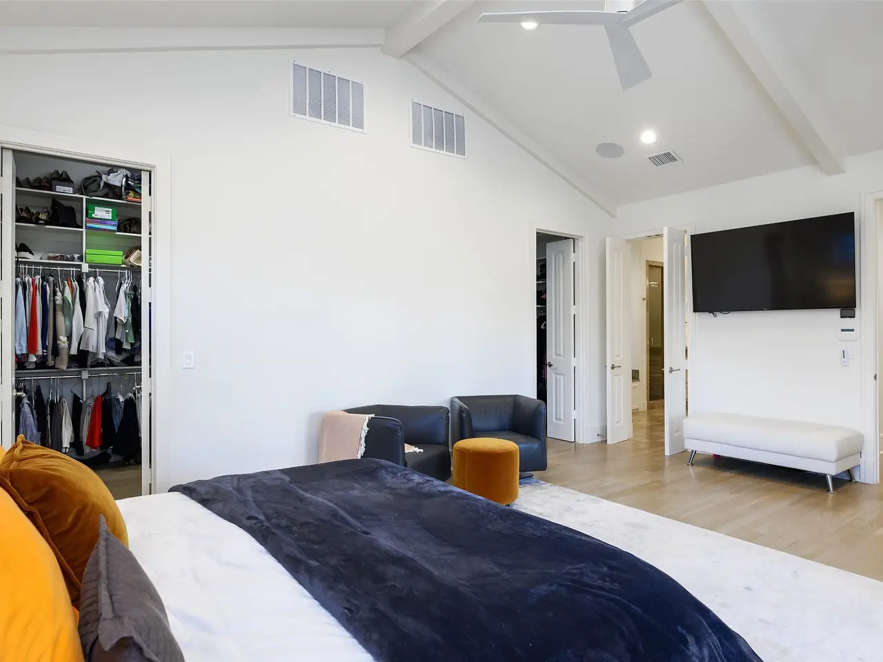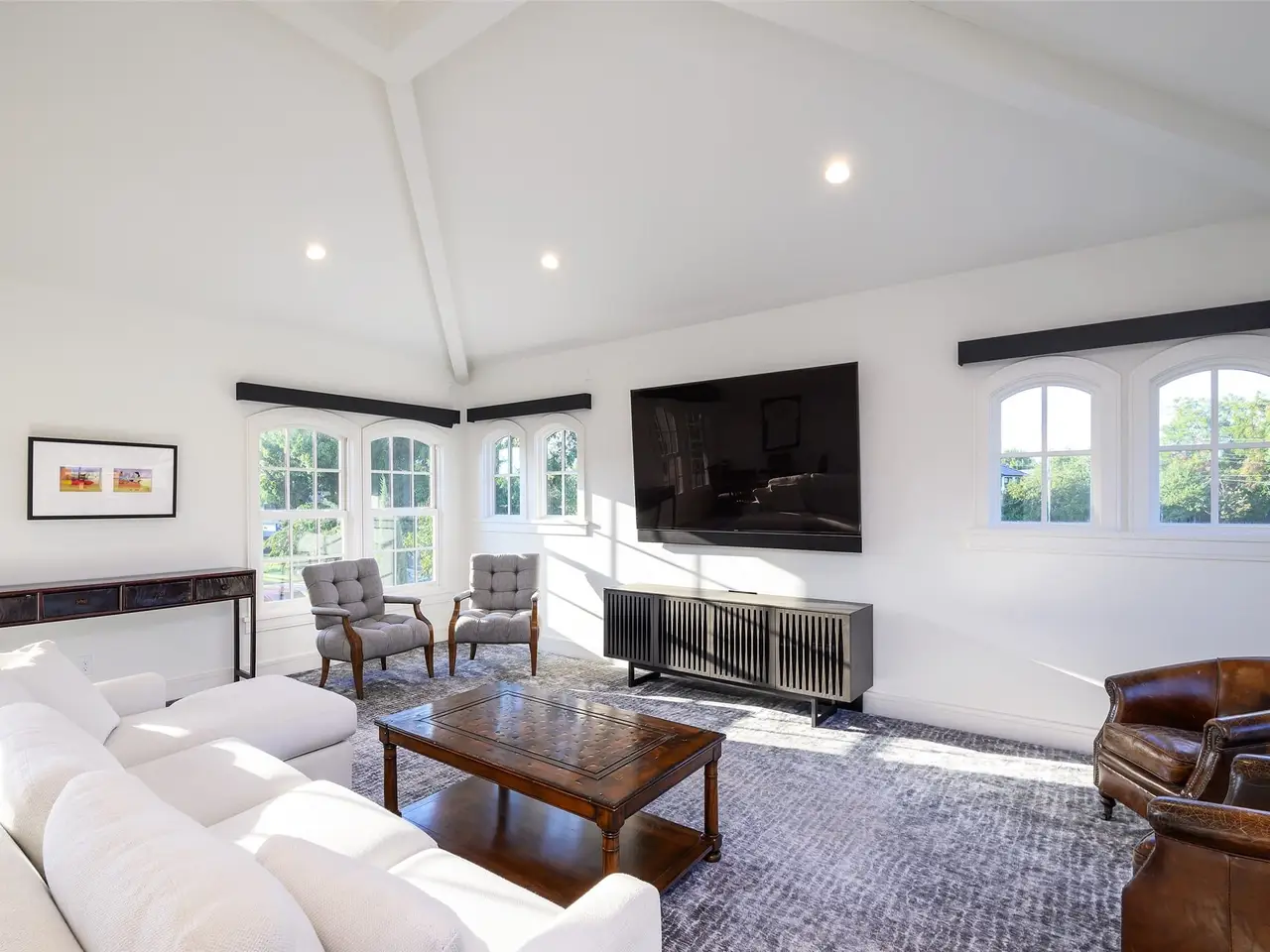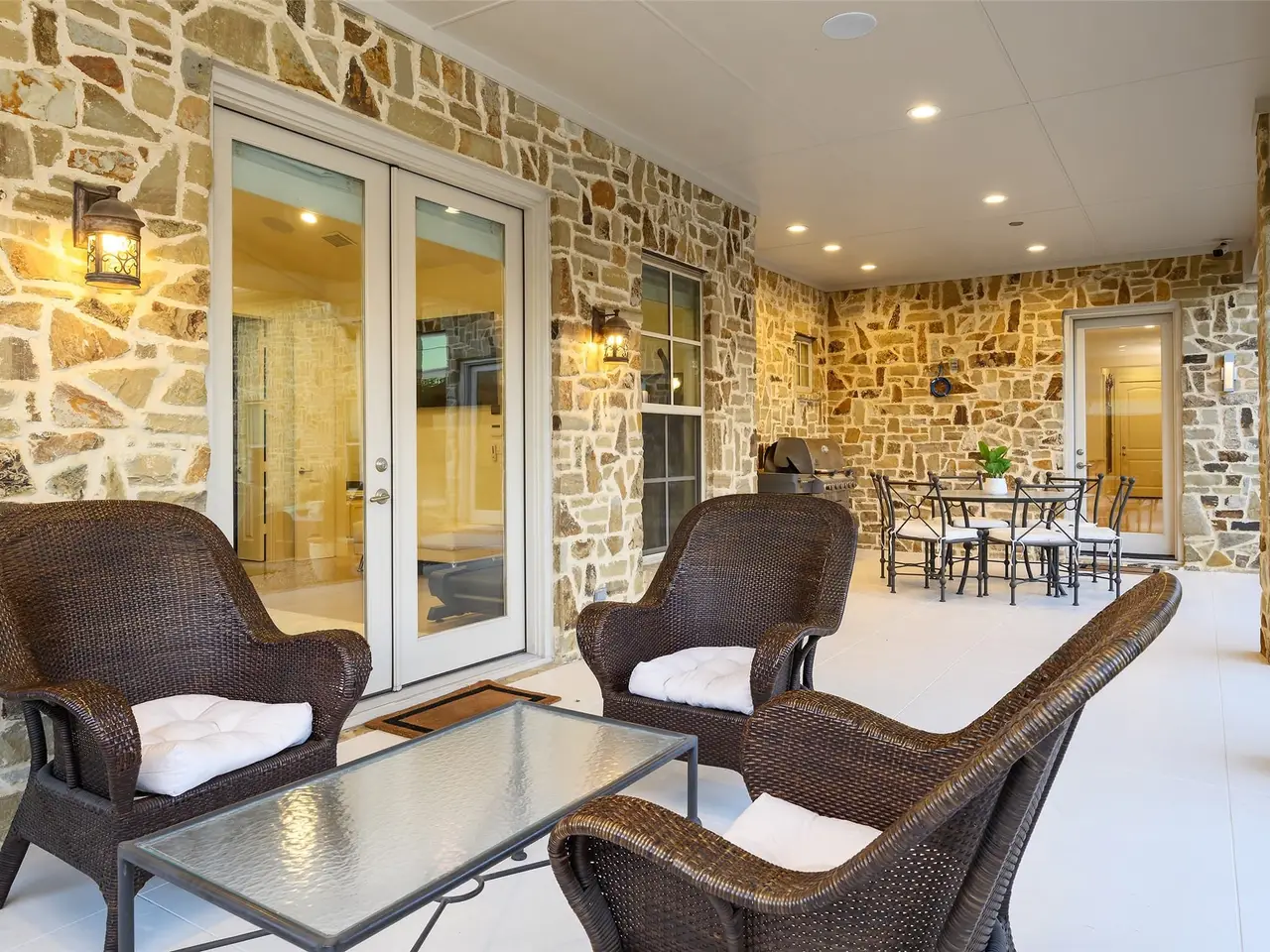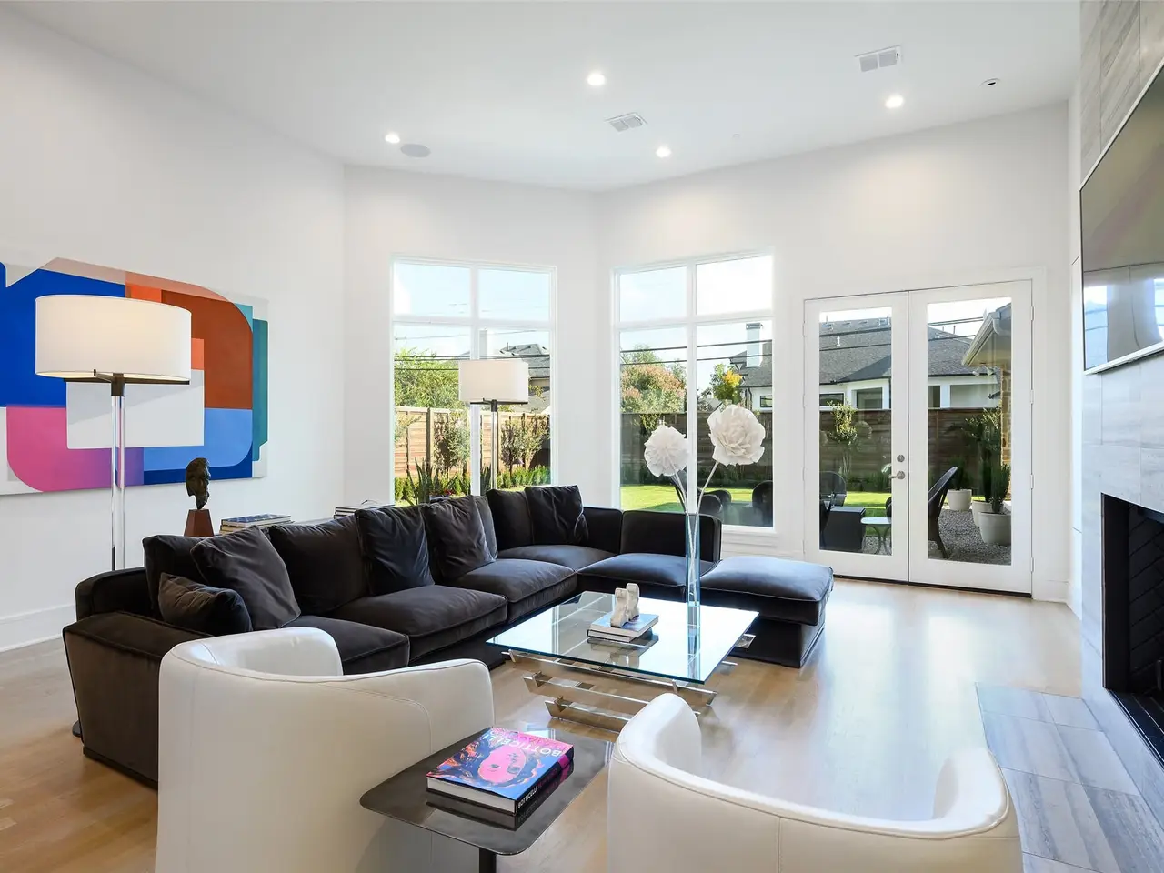 This light-filled home in the ESD-private school corridor was substantially rebuilt and renovated by one of Dallas' highest end builders, Paul Pastore of Waterside Homes circa 2021 - 2022. The 6,030 square foot home on an oversized 0.4+ acre lot blends transitional elegance with newer construction quality in one of Dallas' rising Preston Hollow neighborhoods. Inside, rich, recently installed hardwood flooring, designer lighting and architectural beams set the tone for refined living. A generous entry leads to a formal living room with a stately fireplace and pocket doors, ideal for privacy when used as a home office. The large formal dining room flows effortlessly into the main living area, where a dramatic fireplace, vaulted ceilings and views of the backyard create a stunning focal point. Adjacent to this inviting space, a well-appointed wet bar with wine refrigeration enhances the home's exceptional flow for entertaining. In the heart of the home is a true chef's kitchen, anchored by recently purchased Wolf and Sub-Zero appliances and dual sinks with resilient Quartz counters, that opens to a light-filled breakfast room. The main-level primary suite offers vaulted beam ceilings, French doors to the patio, a spacious walk-in closet and a spa bath with a soaking tub and oversized glass shower. A guest suite, laundry and two powder rooms complete the downstairs. Upstairs, three bedrooms with en suite bathrooms and a media or game room with bonus full bath complement the thoughtful floor plan. Major improvements since 2021 include a new roof and windows, updated plumbing, electrical, insulation, cabinetry, appliances, wood flooring, zoned Lennox HVAC systems and ductwork and two tankless water heaters. Savant smart home integration, Cat 6 wiring, a seven-zone sound system (full downstairs, patio and upstairs game room), and security cameras ensure modern comfort. An attached three-car garage and substantial storage throughout the home add convenience to style.
