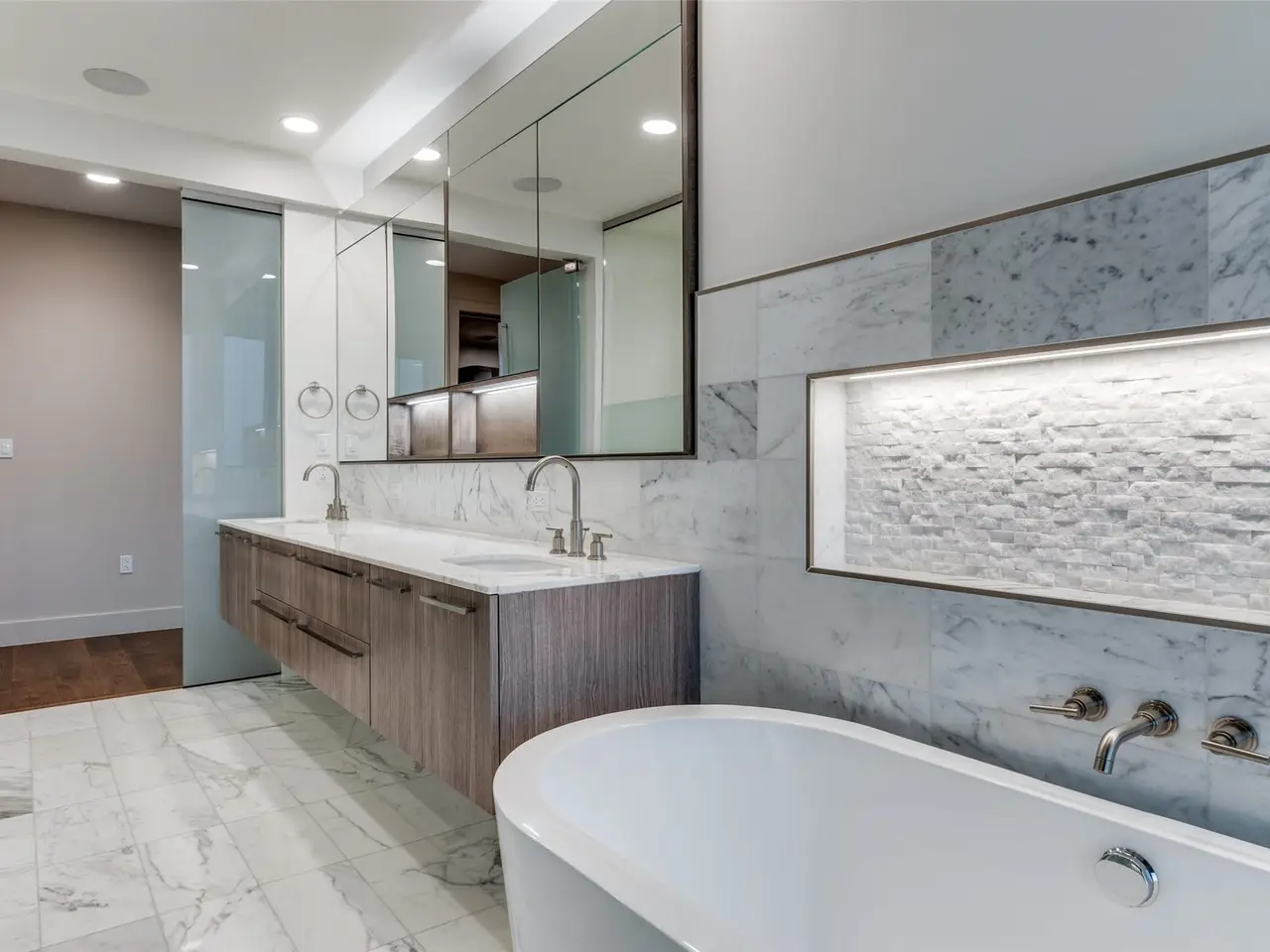 Marble-clad bath with soaking tub