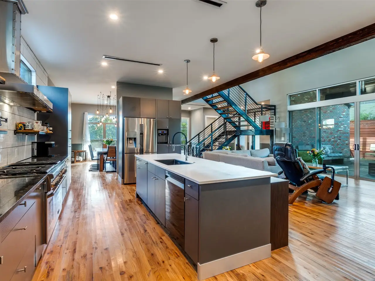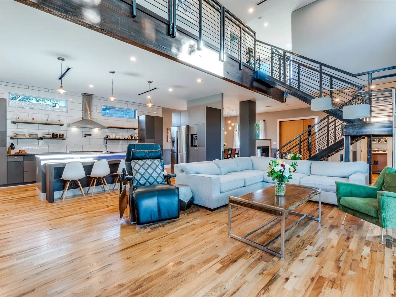 This modern showcase was completely rebuilt from the foundation up in 2018 by the owner builder. Open and modern floorplan has high ceilings and designer touches throughout the home, including a custom designed front door, modern staircase, see-through fireplace in the dining room, custom cabinets in the kitchen, custom finishes in all bathrooms and wood floors throughout. There's a covered front porch, an oversized, covered and picturesque deck in the rear and an open patio upstairs with a view! 2 bedrooms down and 3 bedrooms, including the primary, upstairs. There is an additional home office downstairs that is quiet and private. Two living areas allow everyone to have their own space! The home has two tankless water heaters and two HVAC systems, as well as solar panels on the roof which keep energy costs to a minimum.