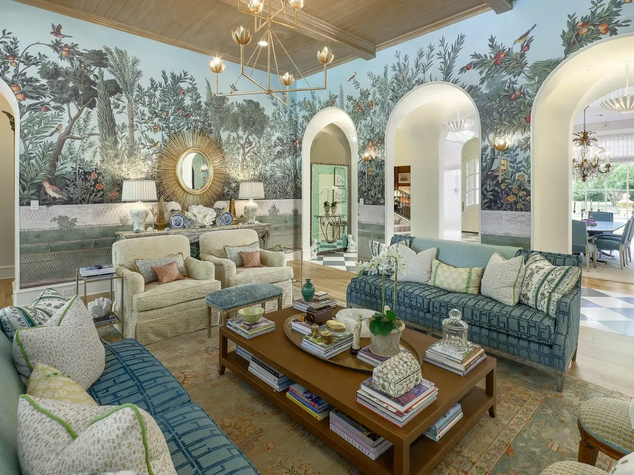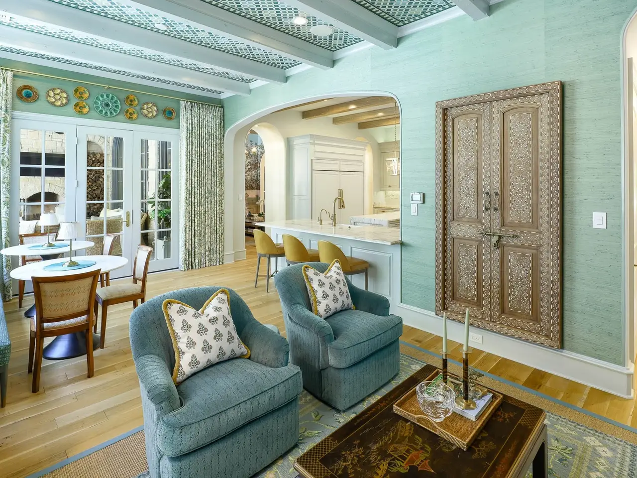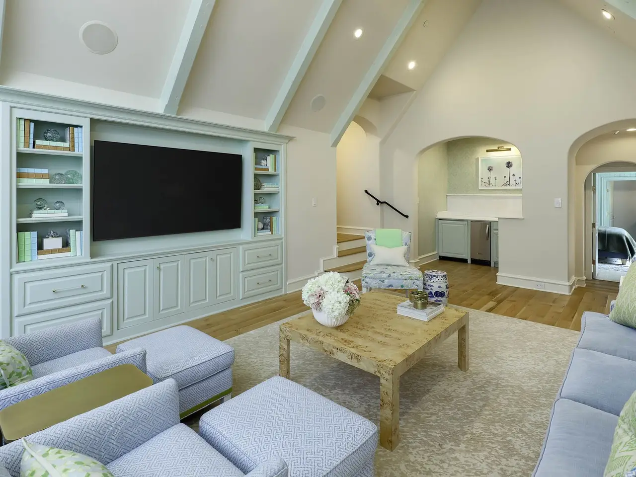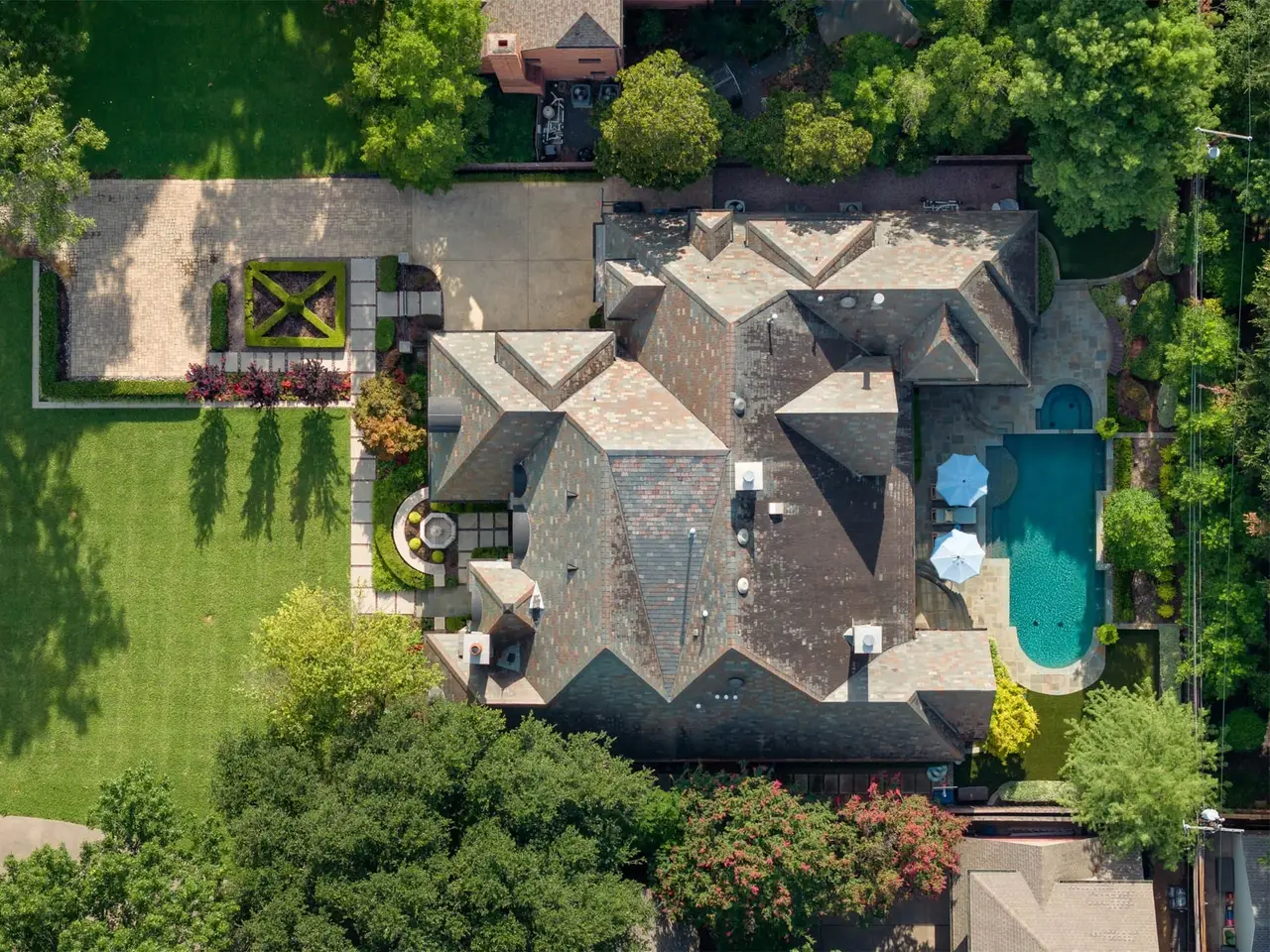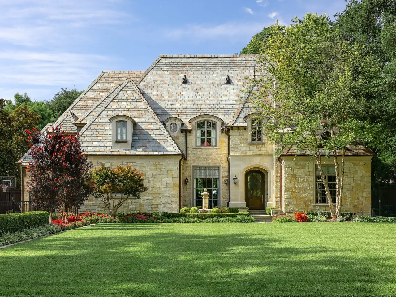 This French-inspired custom home by Allen Nixon is a standout in Preston Hollow, showcasing the highest-quality designer finishes throughout. A timeless stone exterior, slate roof, and copper gutters set the architectural tone, while the two-story foyer opens to a formal dining room with lacquered walls, a sweeping staircase, and a richly paneled library. The chef’s kitchen is equipped with premium appliances and opens to a stylish breakfast area with banquette seating and an inviting adjoining sitting room. The vaulted primary suite is conveniently located on the main level with serene views of the manicured backyard and pool. Upstairs, you’ll find three additional en-suite bedrooms, a seven-seat theater, and a vaulted game room with an adjacent gym. Outdoor living is elevated with a resort-style pool and spa, screened-in porch with motorized screens, and a fully equipped summer kitchen. A three-car garage and elevator-ready design complete this exceptional offering, perfectly suited for multi-generational living.