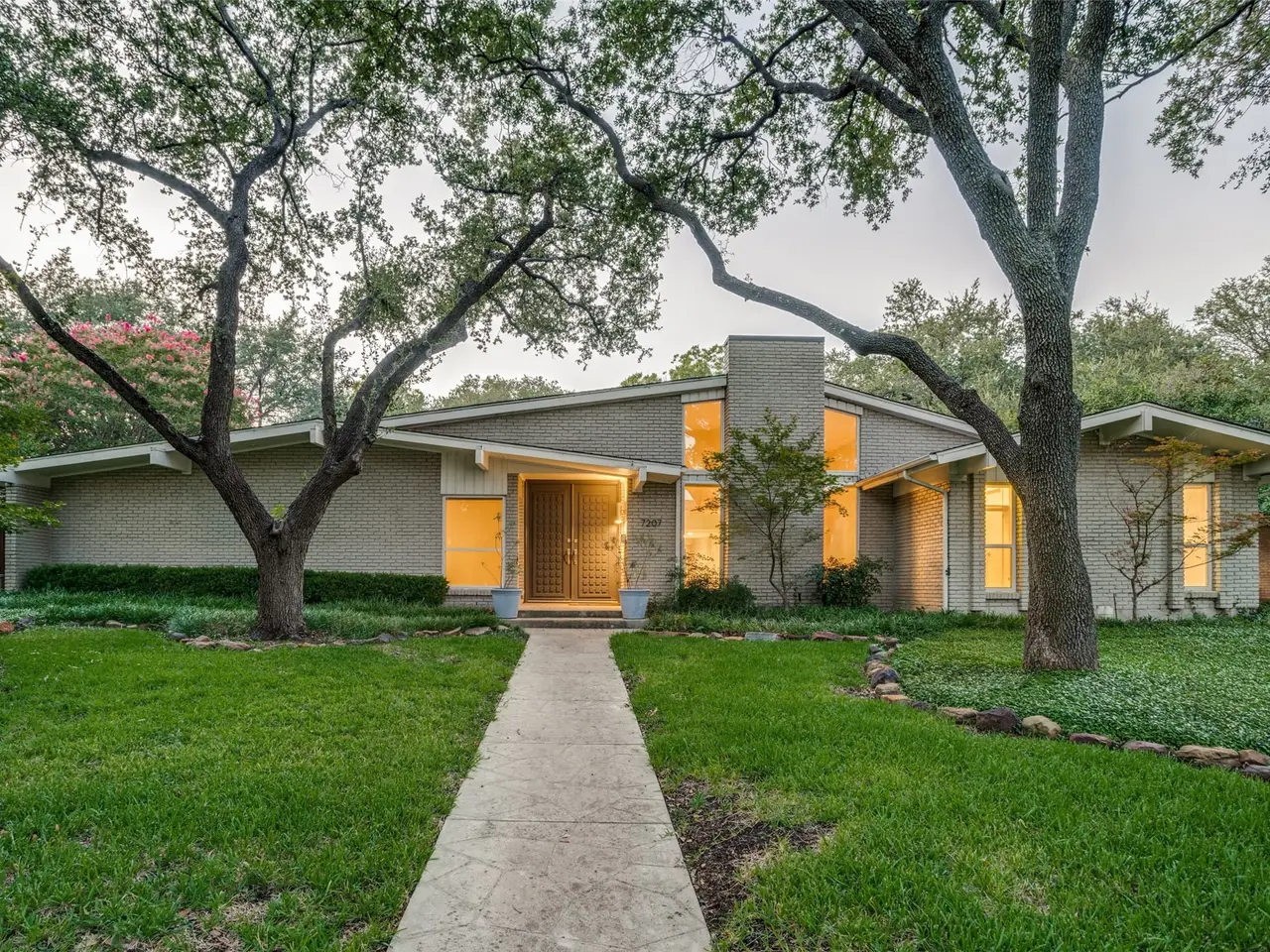 Mid-Century Modern charm meets flexible family living in the highly sought-after Windsor Park neighborhood of Preston Hollow. Nestled on a stunning, mature tree lot, this spacious 5-bedroom, 3.5-bath home offers iconic architectural style, clean lines, and a functional layout on one of North Dallas’s most picturesque streets. Built with the hallmarks of Mid-Century Modern design, the home features an open floor-plan. Inside, you’ll find multiple living and dining spaces, ideal for both entertaining and everyday life. The formal dining room is generously sized, while the family room with a classic brick fireplace offers warmth and comfort. A wood-beamed breakfast room connects to the open kitchen. The homes layout provides privacy and flexibility. On one side, two bedrooms share a full bath, creating the perfect guest suite or retreat. One bedroom includes direct access to the backyard. On the opposite wing, the primary suite and two additional bedrooms offer separation and space for the whole family. The primary bathroom is a standout, featuring a standalone soaking tub inside a spacious walk-in shower, delivering a luxurious, spa-like atmosphere. The secondary bedrooms are connected by a Jack-and-Jill bath, and there's a convenient half bath for guests. Additional features include a private office with French doors, perfect for working from home or a quiet creative space. Throughout the home, natural light and clean architectural lines highlight the thoughtful design and timeless appeal of the Mid-Century era. A large, tree-covered lot shaded by a canopy of mature oaks. Whether you envision a peaceful retreat, lively outdoor entertaining, the home offers endless potential in a serene environment. Located in Windsor Park, one of Preston Hollow's most established and sought-after neighborhoods, this home combines vintage character with modern livability.