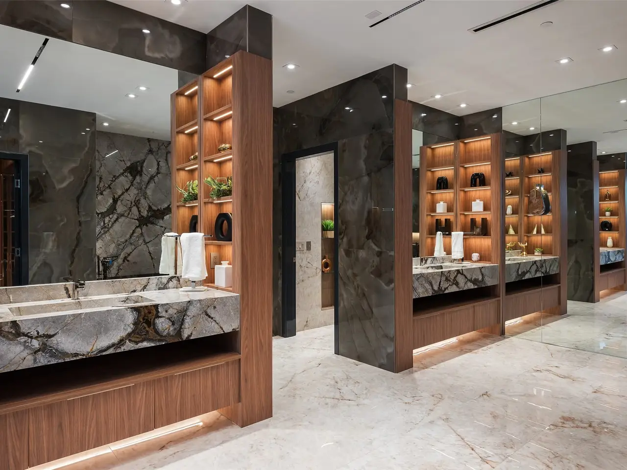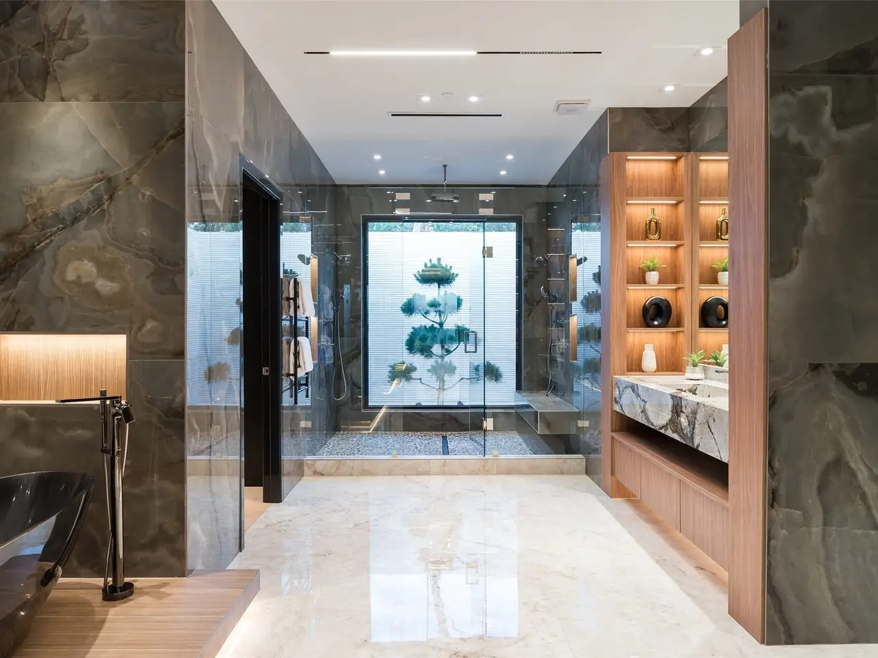 Spa-like bathroom with porcelain onyx and marble
