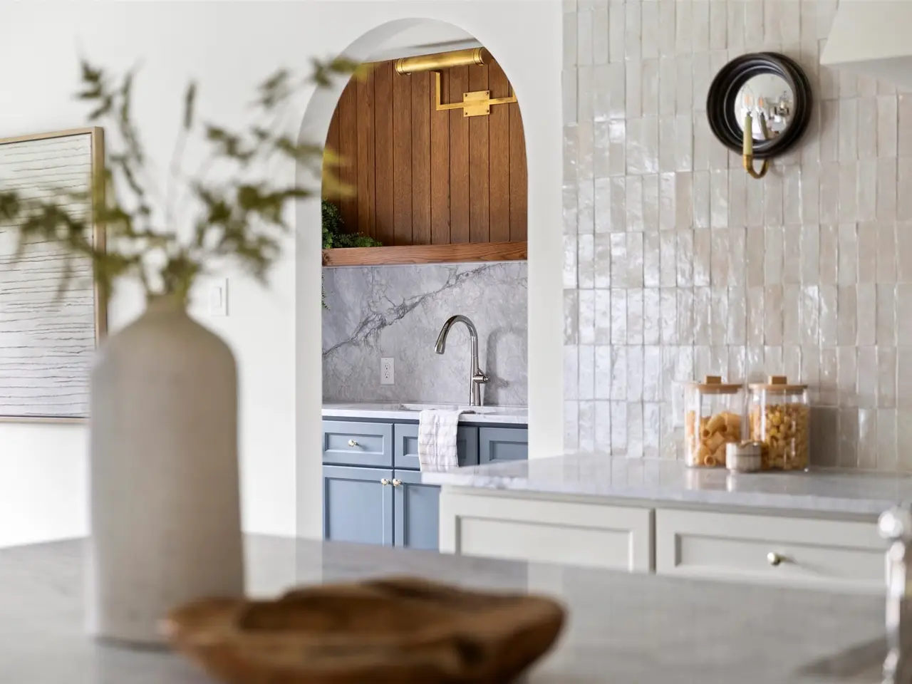 Butlers pantry with marble counters and wine cooler