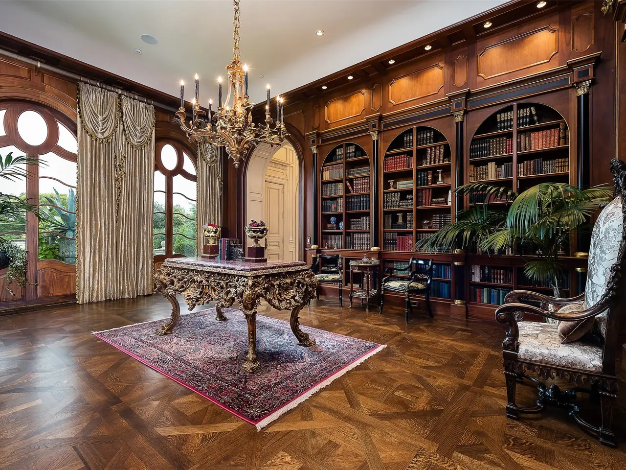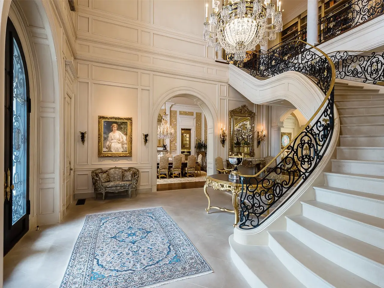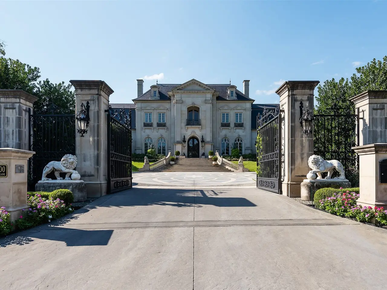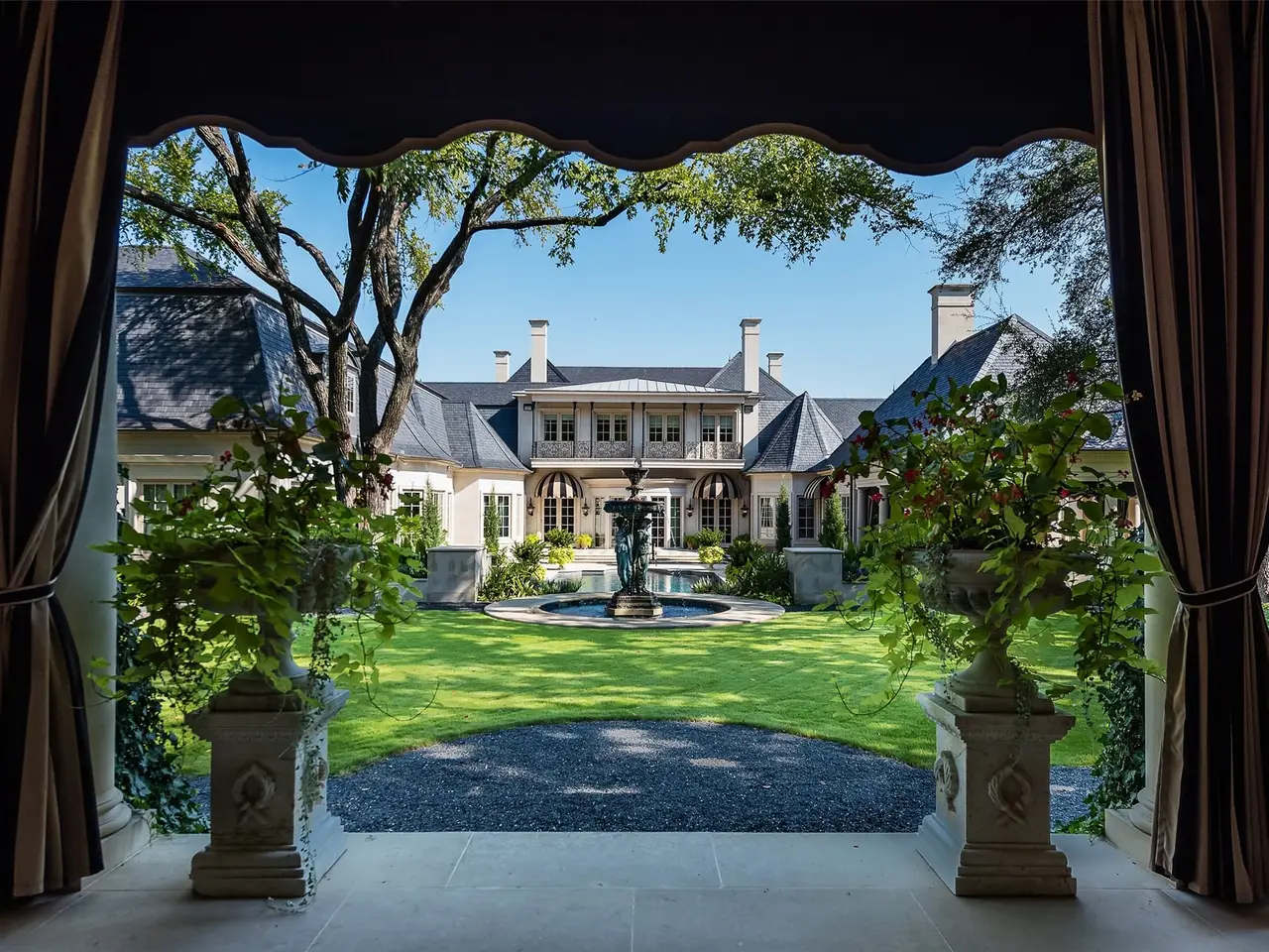 Tucked behind iron gates, this remarkable estate sits on over two acres in the heart of Old Preston Hollow. The custom 6-bedroom, 7.3-bath residence, completed in 2014, blends luxurious materials, textiles, and finishes. Spanning nearly 20,000 square feet, the French Renaissance-inspired home offers complete privacy and tranquility. A two-story domed entry features a stunning floating staircase, with marble floors in the Grand Foyer and rich mahogany moldings in the Library, Formal Study, and Media Room creating a dramatic atmosphere. The Grand Dining Room, adorned with de Gournay silk and embroidered wallpaper, offers unparalleled elegance. The gourmet kitchen includes an 8-burner Wolf range, 4 Wolf ovens, induction stovetop, and a center island, complemented by custom cabinetry. An open layout leads to a keeping room, junior dining room, and family room, which opens to a covered outdoor terrace. At the heart of the home, the Grand Hall boasts ornate plaster ceilings, two black marble fireplaces, and stunning marble medallions. The Media Room is a sports enthusiast's dream, with 5 televisions, a 120' drop-down screen, and a full wet bar. The main level Master Suite includes a private sitting room and opens to a terrace with a fireplace, pool, waterfall, and cabana. His-and-hers master baths feature marble floors, separate dressing areas, including a second story additional master showroom couture closet, and a large double shower. Upstairs, 5 additional bedrooms with luxurious baths include suites with private balconies overlooking the pool and gardens. Other highlights include a Billiards Room, Game Room, Physiotherapy Room with Steam Room, and Home Gym, all accessible by elevator. For car enthusiasts, the estate offers 3 garages with 4 car lifts, providing space for 10 luxury vehicles. The grounds feature a saltwater pool, cabana, walking paths and gardens, creating a serene resort-like atmosphere.