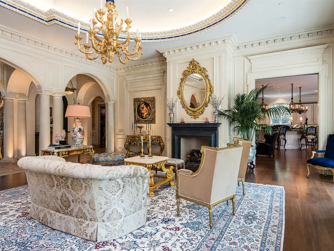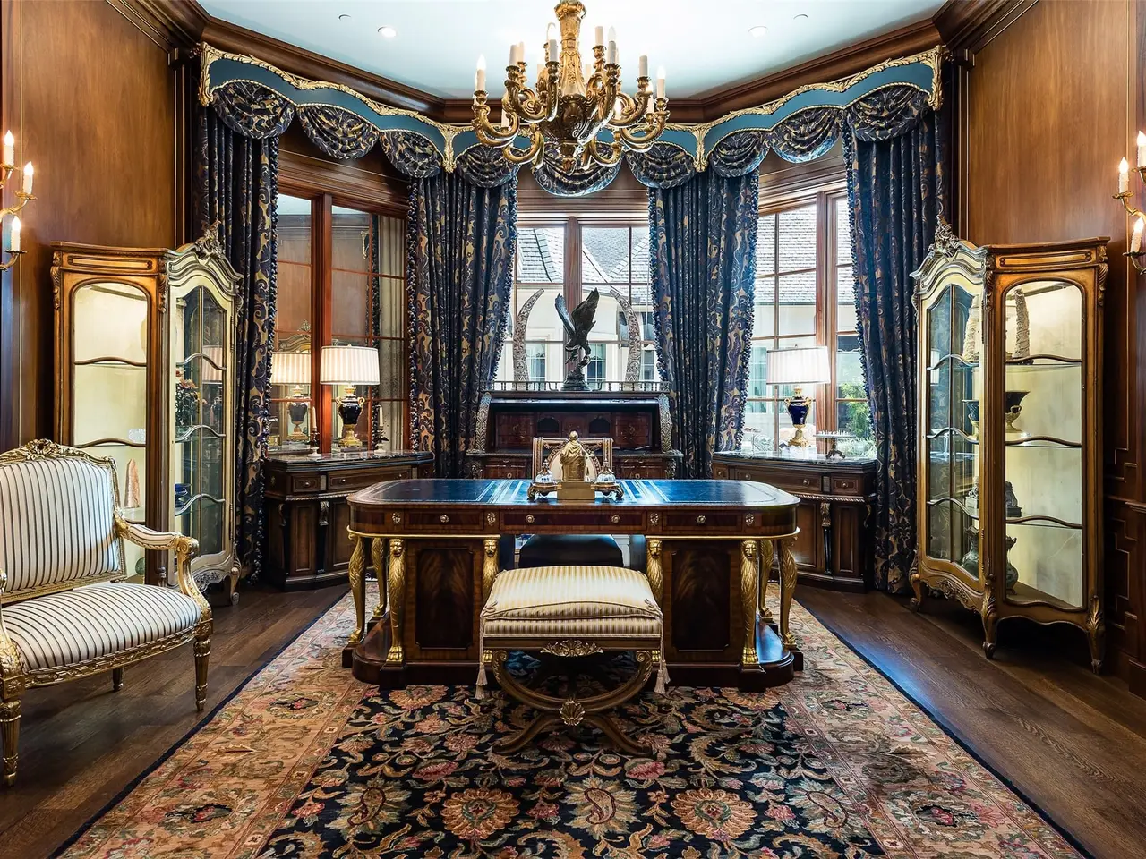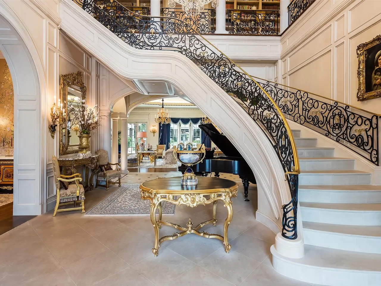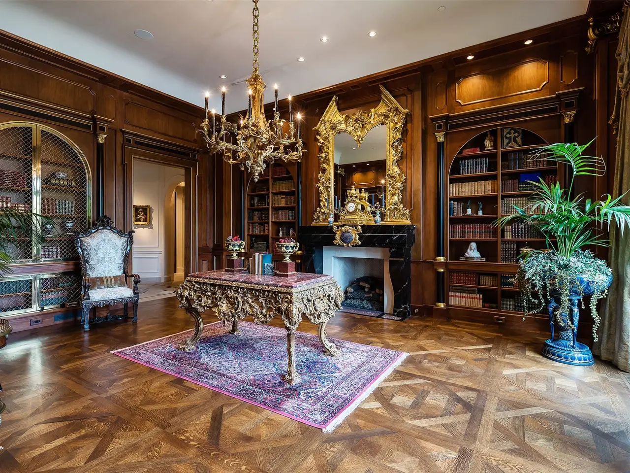 Tucked behind iron gates, this remarkable estate sits on over two acres in the heart of Old Preston Hollow. The custom 6-bedroom, 7.3-bath residence, completed in 2014, blends luxurious materials, textiles, and finishes. Spanning nearly 20,000 square feet, the French Renaissance-inspired home offers complete privacy and tranquility. A two-story domed entry features a stunning floating staircase, with marble floors in the Grand Foyer and rich mahogany moldings in the Library, Formal Study, and Media Room creating a dramatic atmosphere. The Grand Dining Room, adorned with de Gournay silk and embroidered wallpaper, offers unparalleled elegance. The gourmet kitchen includes an 8-burner Wolf range, 4 Wolf ovens, induction stovetop, and a center island, complemented by custom cabinetry. An open layout leads to a keeping room, junior dining room, and family room, which opens to a covered outdoor terrace. At the heart of the home, the Grand Hall boasts ornate plaster ceilings, two black marble fireplaces, and stunning marble medallions. The Media Room is a sports enthusiast's dream, with 5 televisions, a 120' drop-down screen, and a full wet bar. The main level Master Suite includes a private sitting room and opens to a terrace with a fireplace, pool, waterfall, and cabana. His-and-hers master baths feature marble floors, separate dressing areas, including a second story additional master showroom couture closet, and a large double shower. Upstairs, 5 additional bedrooms with luxurious baths include suites with private balconies overlooking the pool and gardens. Other highlights include a Billiards Room, Game Room, Physiotherapy Room with Steam Room, and Home Gym, all accessible by elevator. For car enthusiasts, the estate offers 3 garages with 4 car lifts, providing space for 10 luxury vehicles. The grounds feature a saltwater pool, cabana, walking paths and gardens, creating a serene resort-like atmosphere.