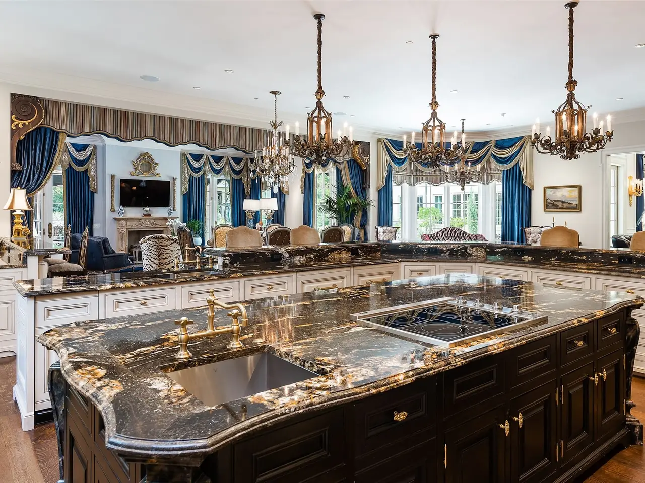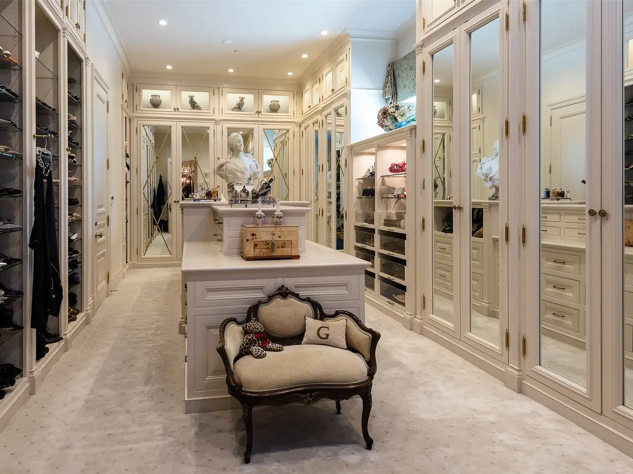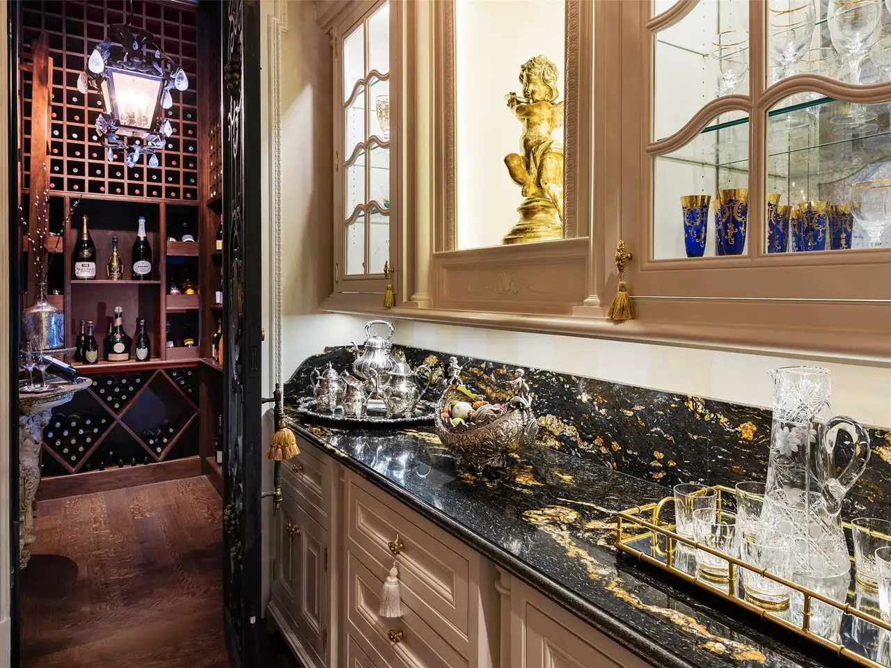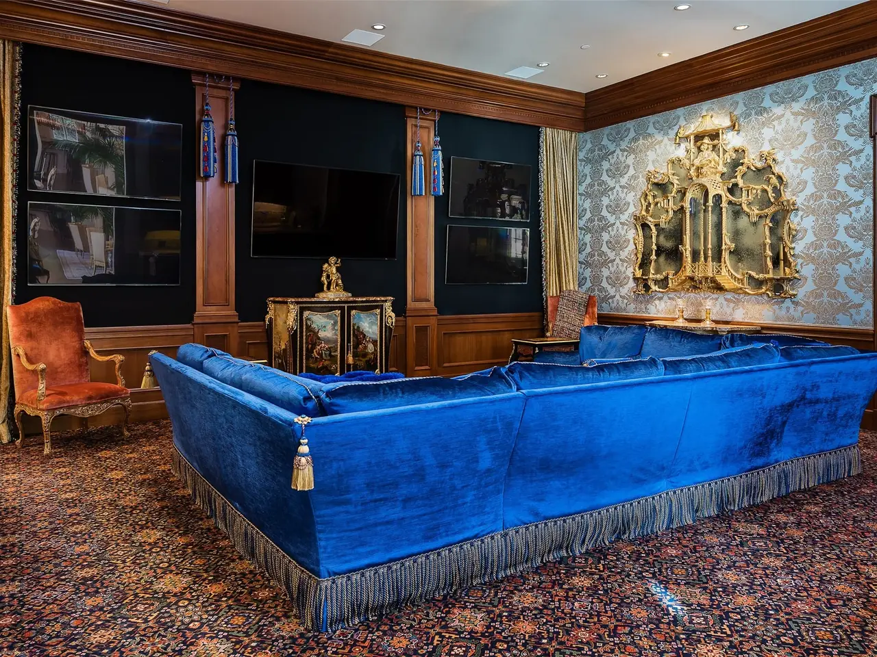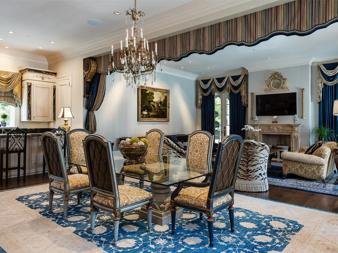 Tucked behind iron gates, this remarkable estate sits on over two acres in the heart of Old Preston Hollow. The custom 6-bedroom, 7.3-bath residence, completed in 2014, blends luxurious materials, textiles, and finishes. Spanning nearly 20,000 square feet, the French Renaissance-inspired home offers complete privacy and tranquility. A two-story domed entry features a stunning floating staircase, with marble floors in the Grand Foyer and rich mahogany moldings in the Library, Formal Study, and Media Room creating a dramatic atmosphere. The Grand Dining Room, adorned with de Gournay silk and embroidered wallpaper, offers unparalleled elegance. The gourmet kitchen includes an 8-burner Wolf range, 4 Wolf ovens, induction stovetop, and a center island, complemented by custom cabinetry. An open layout leads to a keeping room, junior dining room, and family room, which opens to a covered outdoor terrace. At the heart of the home, the Grand Hall boasts ornate plaster ceilings, two black marble fireplaces, and stunning marble medallions. The Media Room is a sports enthusiast's dream, with 5 televisions, a 120' drop-down screen, and a full wet bar. The main level Master Suite includes a private sitting room and opens to a terrace with a fireplace, pool, waterfall, and cabana. His-and-hers master baths feature marble floors, separate dressing areas, including a second story additional master showroom couture closet, and a large double shower. Upstairs, 5 additional bedrooms with luxurious baths include suites with private balconies overlooking the pool and gardens. Other highlights include a Billiards Room, Game Room, Physiotherapy Room with Steam Room, and Home Gym, all accessible by elevator. For car enthusiasts, the estate offers 3 garages with 4 car lifts, providing space for 10 luxury vehicles. The grounds feature a saltwater pool, cabana, walking paths and gardens, creating a serene resort-like atmosphere.