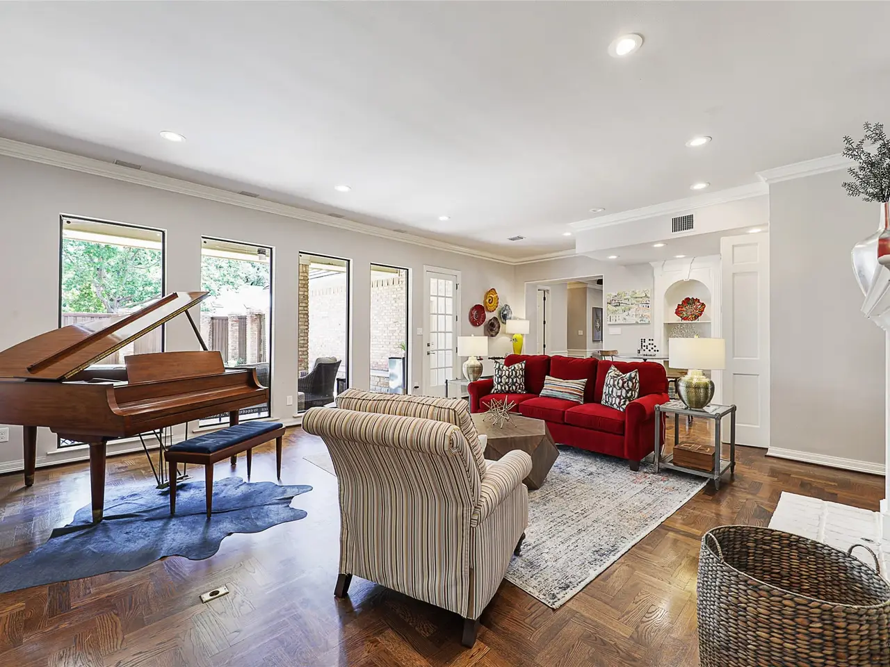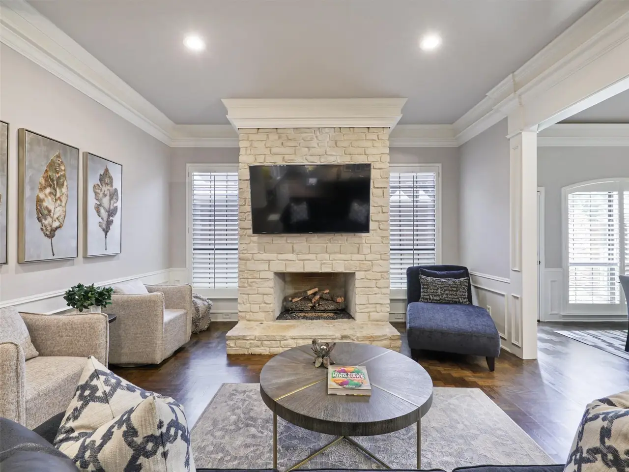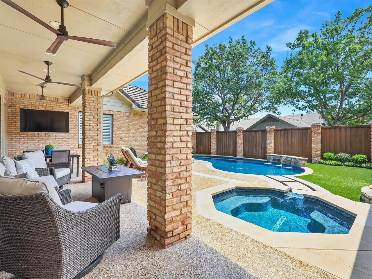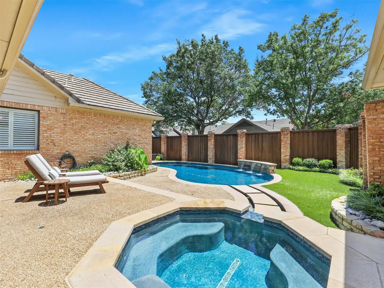 Step into timeless elegance in the heart of Bent Tree North 2. Nestled on a beautifully landscaped lot, this exquisite custom home seamlessly blends modern updates with classic charm. Rich hardwood floors and a soft, inviting color palette carry you through the first floor, where the formal dining room delights with updated lighting and sunlit plantation-shuttered windows perfect for intimate dinners or lively gatherings. The formal living room is the epitome of grace, anchored by a stately brick fireplace and framed by expansive windows. Entertain in style with a built-in wet bar, complete with wine fridge and ice maker.The family room offers rustic charm with a stone fireplace and wood-beamed ceiling, creating the perfect setting for cozy evenings. The gourmet kitchen is designed for culinary inspiration, features bespoke cabinetry, leathered quartzite countertops, a Bertazzoni gas range, Subzero refrigerator-freezer, stainless steel dw, and a walk-in pantry. Adjoining breakfast area boasts a well-appointed butlers pantry with a stylish coffee bar nook. Generous downstairs study offers built-ins for books, and can easily double as a welcoming guest suite with a full, updated bathroom just steps away.Oversized primary suite is a tranquil retreat, with a peaceful sitting area bathed in natural light and a private bonus room ideal for a home gym or quiet sanctuary. Luxurious en suite bathroom is a spa-like haven with dual vanities, sleek Carrera marble, a frameless glass shower, a deep soaking tub, and two separate water closets and custom walk-in closets. Upstairs, discover three spacious bedrooms, each thoughtfully designed with plush carpeting, soft tones, and plantation shutters. Two fully updated bathrooms with designer finishes ensure comfort and style for family or guests. Outside, your private backyard oasis awaits. A sparkling pool and bubbling spa are nestled in lush, tranquil landscapingan idyllic escape for morning coffee or sunset cocktails.
