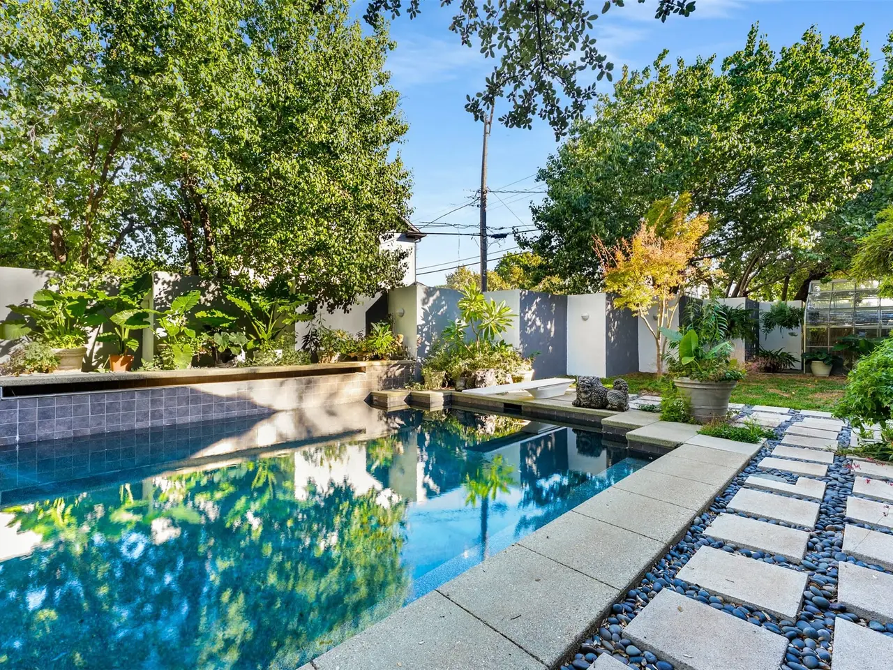 Step inside and experience light, volume and architectural drama. The main living area is defined by soaring 28-foot ceilings, floor-to-ceiling windows, and a stunning 30-foot barrel-vaulted skylight that floods the home with natural light. The spacious owner's suite offers a retreat of its own with a vaulted ceiling, skylight, fireplace with gas logs, and rich wood floors. Outdoors, the private backyard oasis features a sparkling pool, a glass greenhouse with an integrated spa, and plenty of room to relax or entertain. With all the bedrooms, bathrooms and living spaces needed for today's lifestyle, this home offers incredible potential. Priced to remodel and make it your own or start fresh and build new this .43-acre lot in the heart of the Private School Corridor presents a rare opportunity to create your dream home.