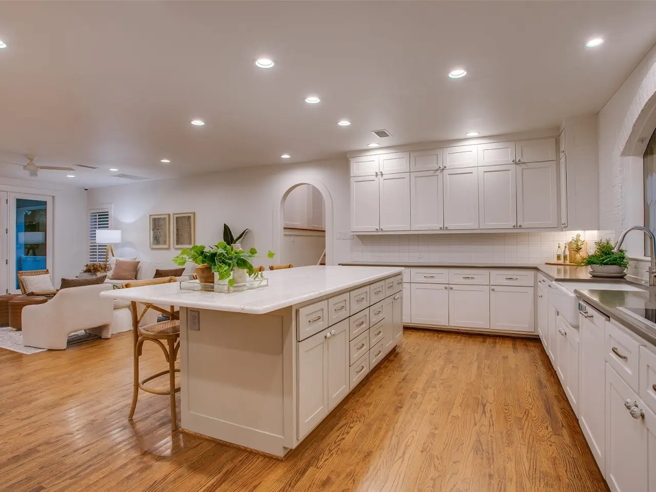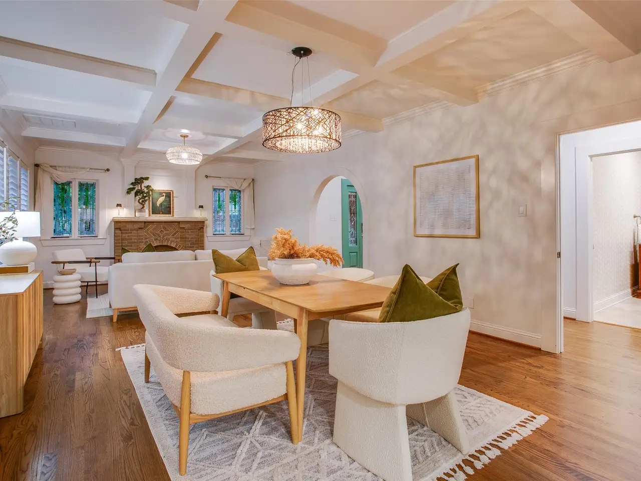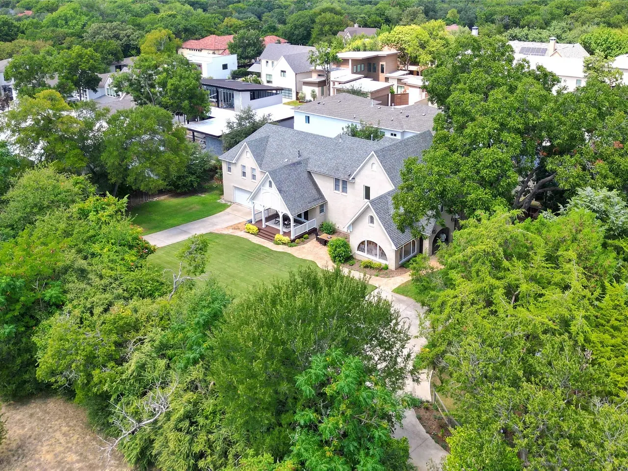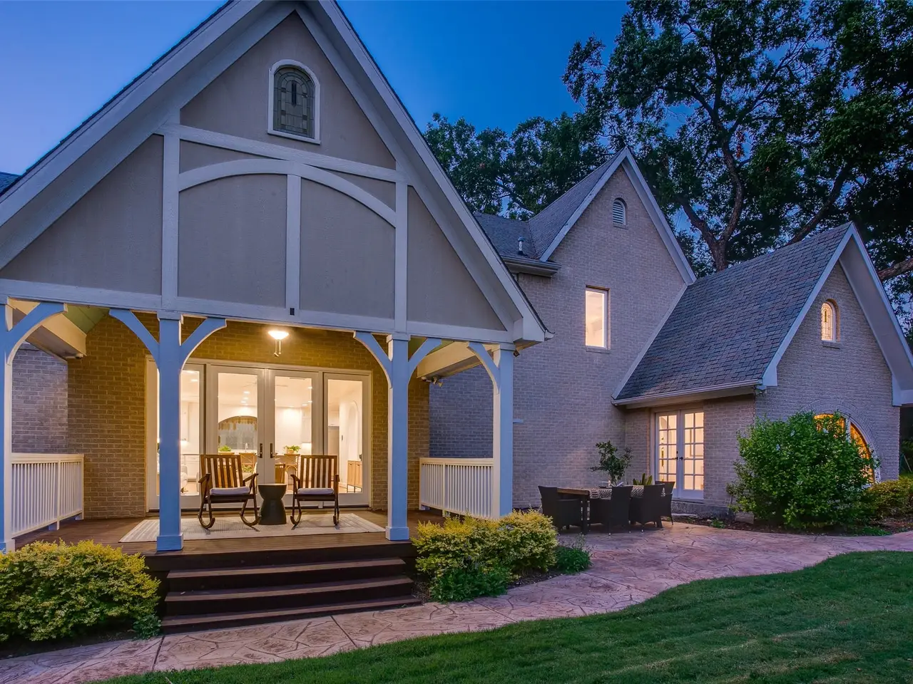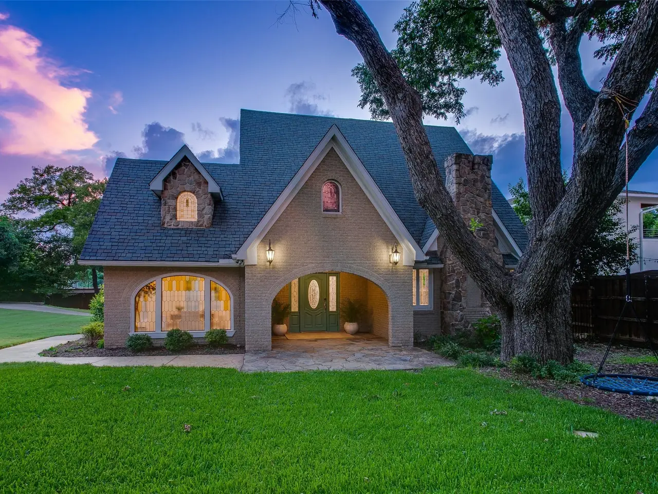Tucked away on a gated half-acre lot in North Oak Cliff, this Tudor Revival blends storybook charm with thoughtful updates. Stained-glass windows, arched doorways, and coffered ceilings in the formals highlight timeless craftsmanship, while hardwood and tile flooring throughout, plantation shutters, and an original brick fireplace anchor the living spaces. A cathedral-like office or sitting room with vaulted ceilings, exposed beams, and stained-glass windows provides a striking retreat. The bright kitchen boasts a large island, double ovens, walk-in pantry, and oversized, built-in refrigerator. Multiple living areas include an upstairs bonus room ideal as a second living or playroom. The primary suite features a bath with dual vanities, soaking tub, walk-in shower, and walk-in closet. Outdoors, mature trees and wide lawns provide space for entertaining, with the walking trails and playgrounds of Kidd Springs Park just steps away.