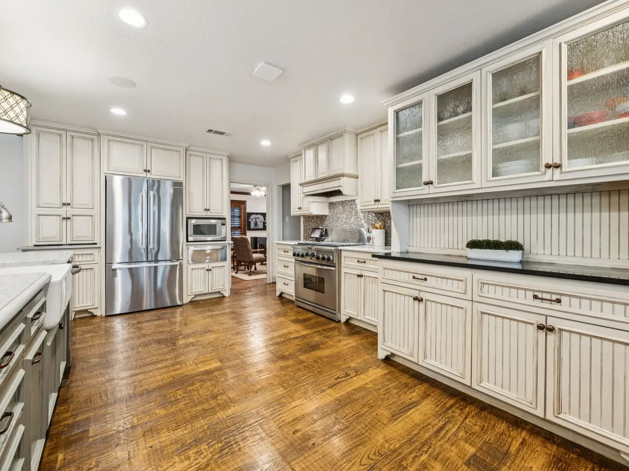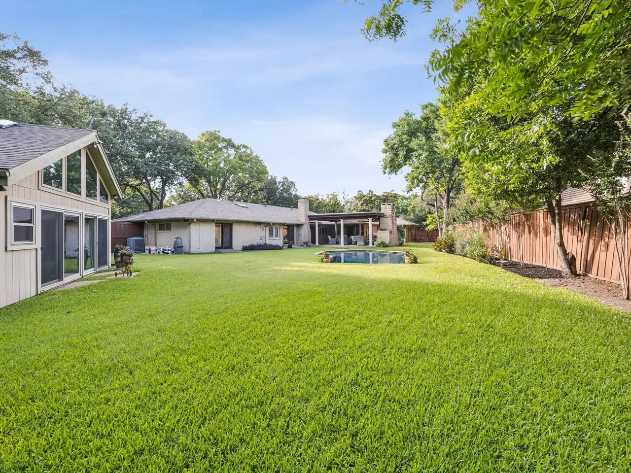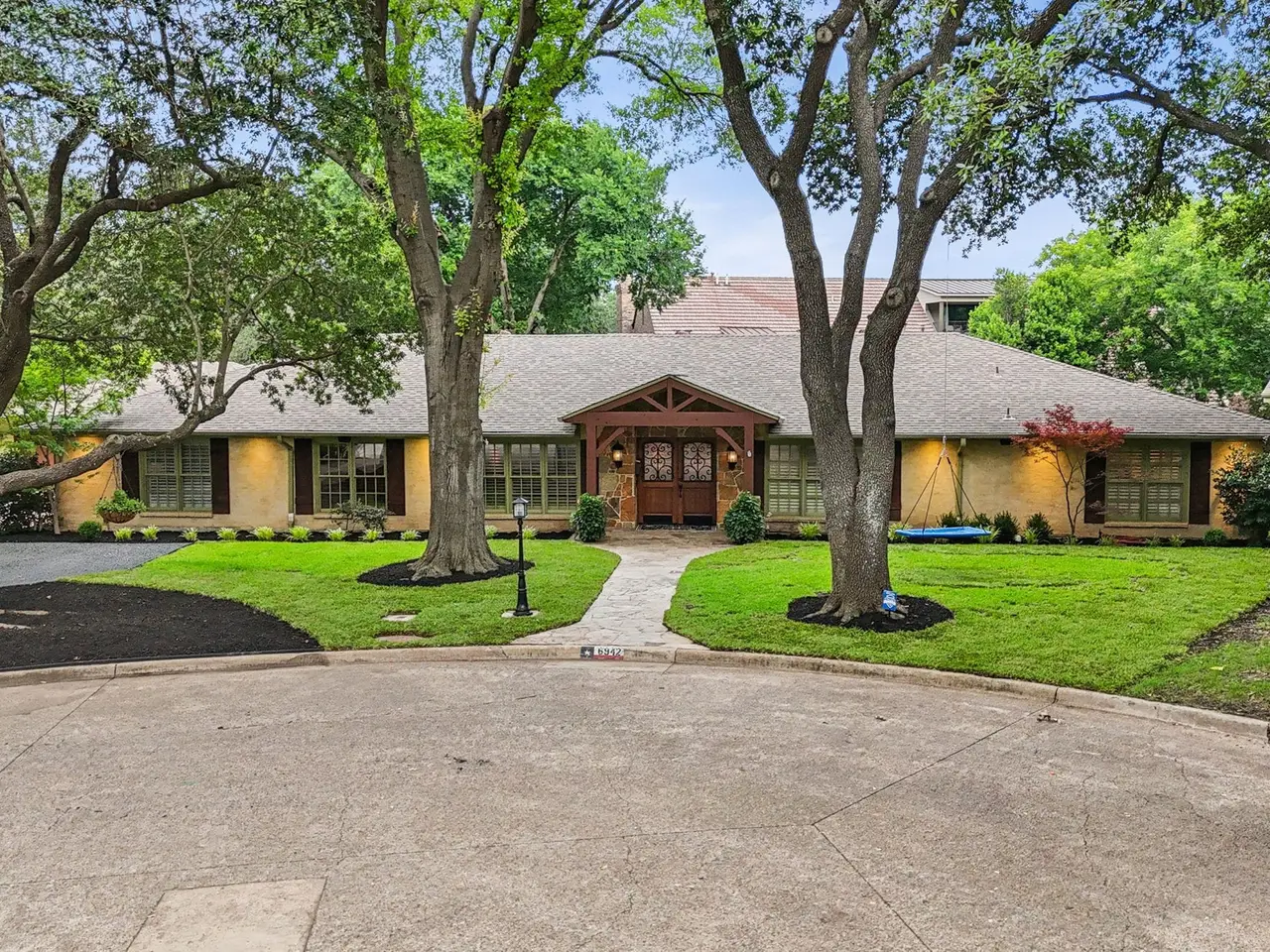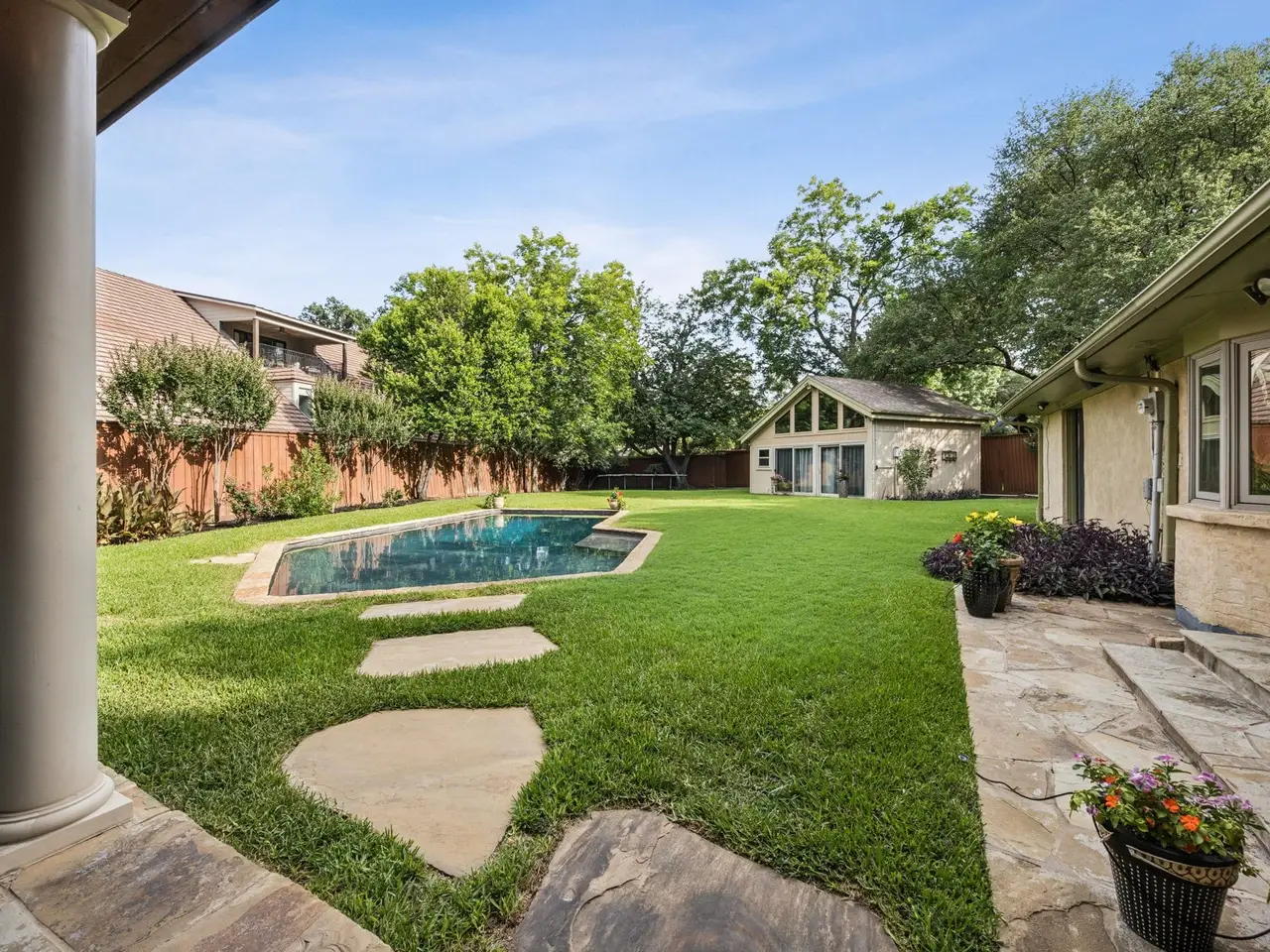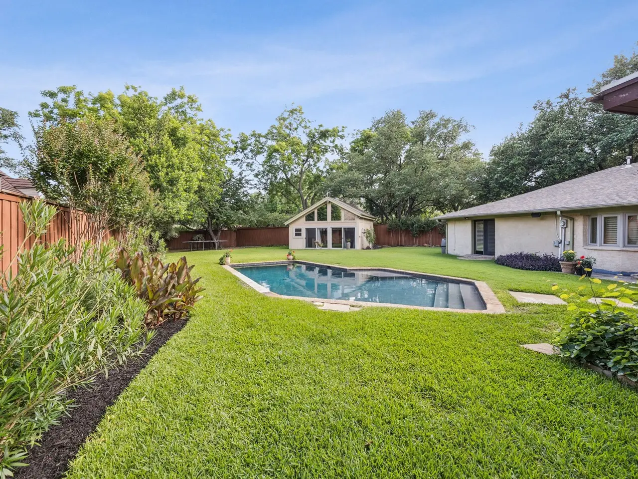 Discover timeless elegance and everyday comfort in this beautifully updated single-story ranch home, ideally situated on nearly half an acre in a quiet cul-de-sac in the heart of Preston Hollow's Windsor Park neighborhood. The open-concept layout features a spacious island kitchen and breakfast nook that flow seamlessly into a vaulted living room with wood beam accents and a gas log fireplace. A private office and formal dining room offer flexible spaces for work or entertaining, while a thoughtful split floor plan provides exceptional privacy. The expansive primary suite includes dual walk-in closets and additional wardrobe storage, with two guest bedrooms nearby. A separate guest suite and a private game room, easily used as a fifth bedroom, adds versatility. Practical highlights include an oversized mudroom, abundant storage, and a oversized two-car garage. The lush backyard retreat is perfect for relaxing or entertaining, with a sparkling pool, covered patio with fireplace, and a full guest house complete with kitchen, bathroom, and Murphy bed.