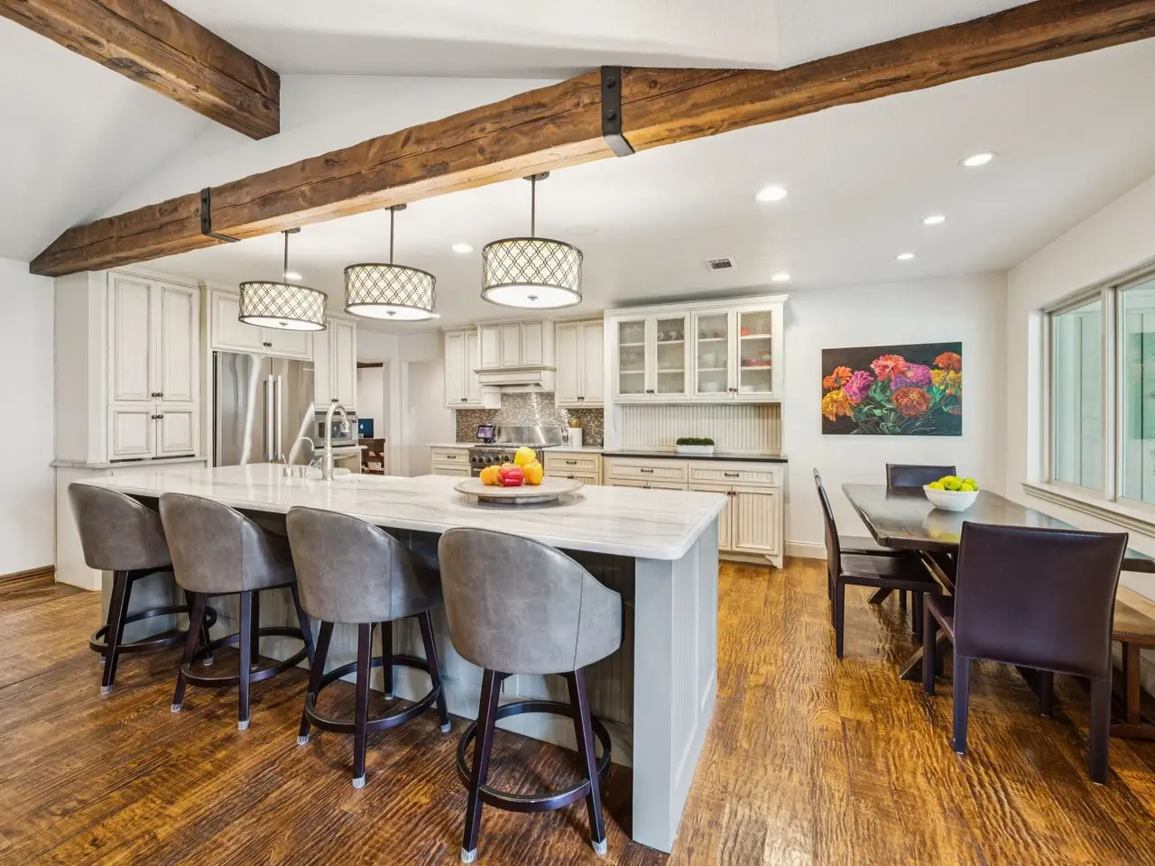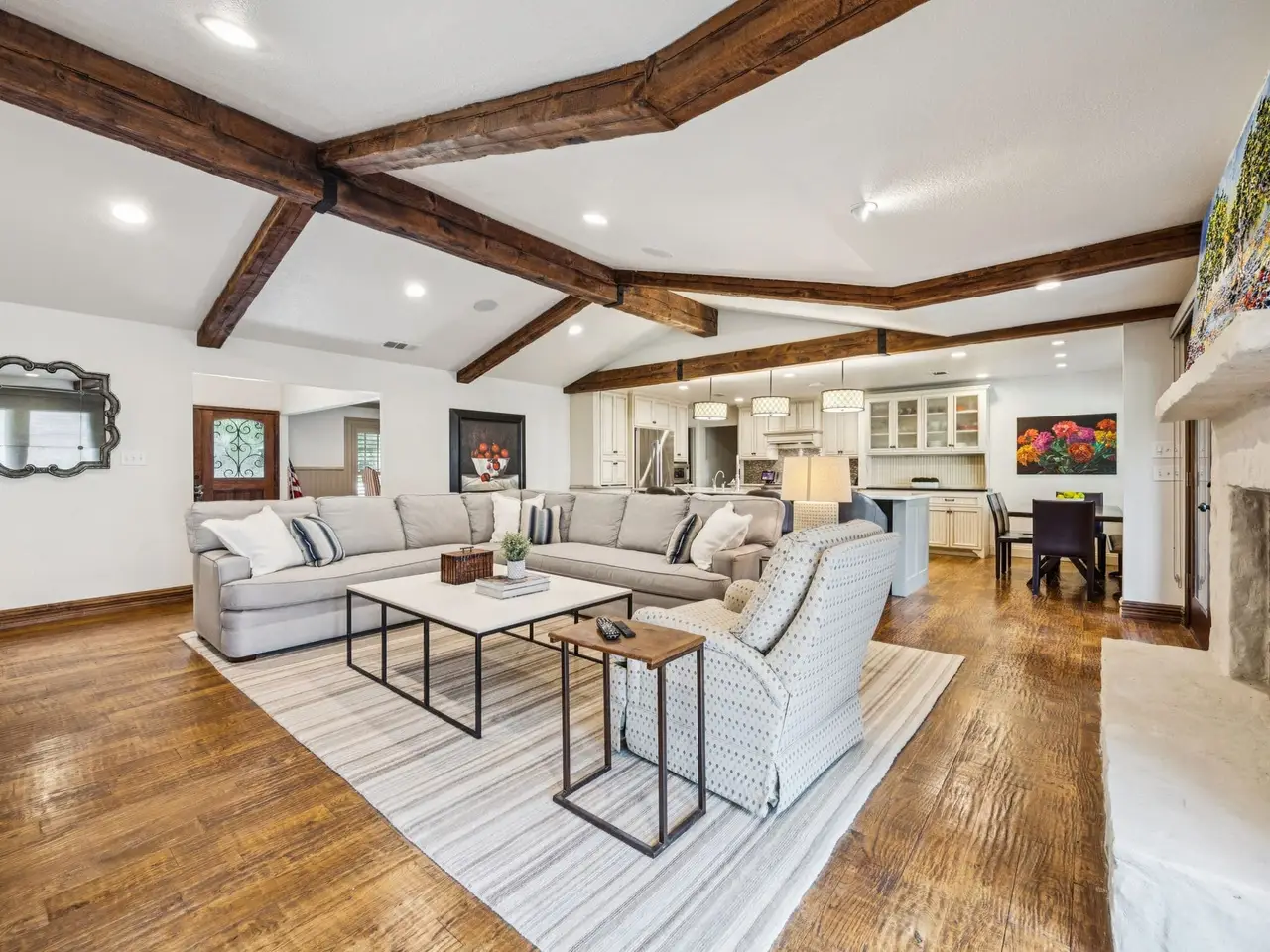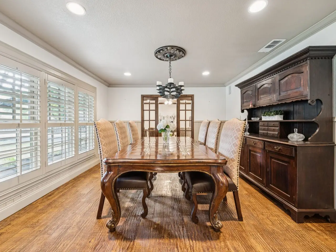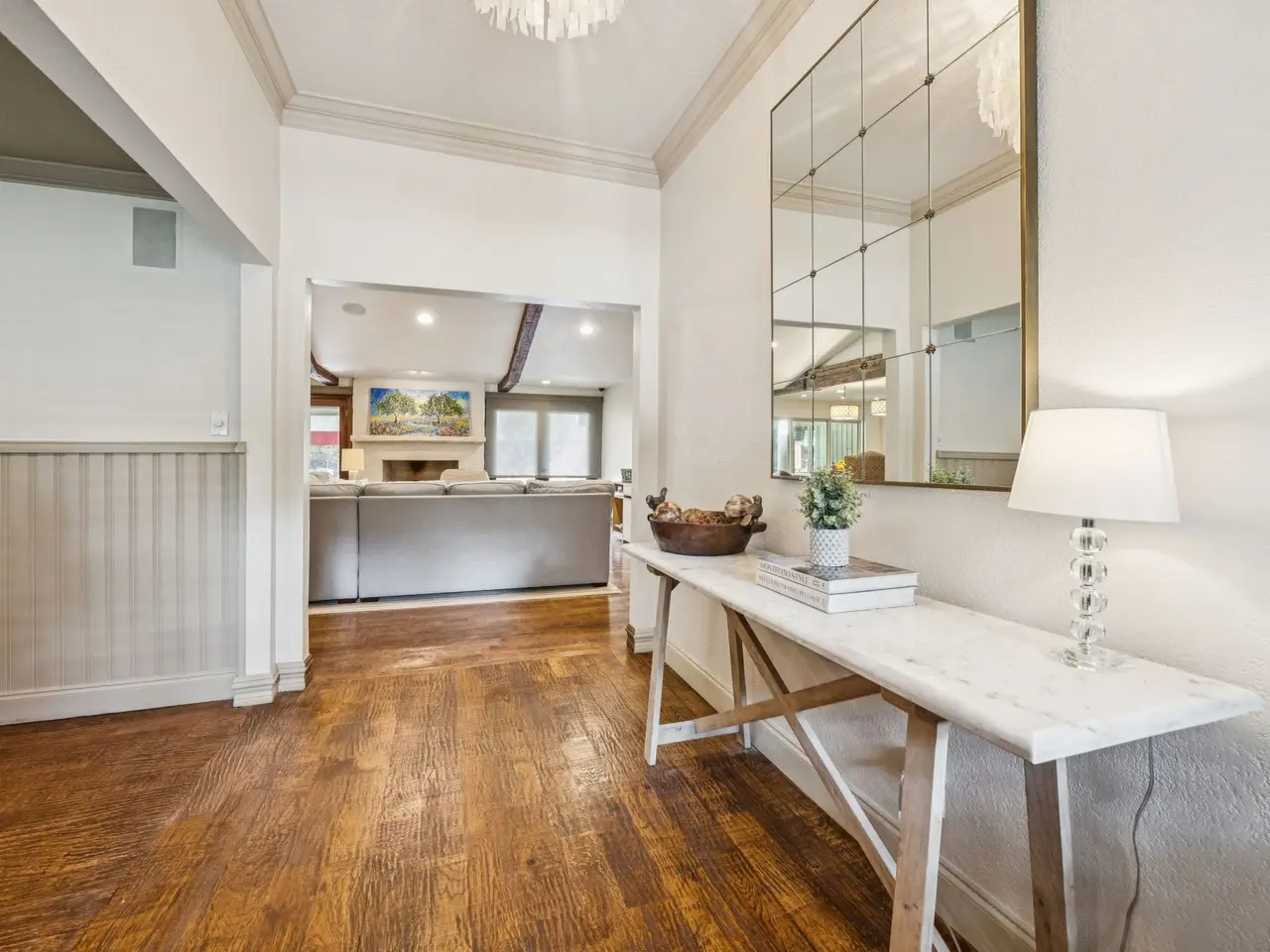 Discover timeless elegance and everyday comfort in this beautifully updated single-story ranch home, ideally situated on nearly half an acre in a quiet cul-de-sac in the heart of Preston Hollow's Windsor Park neighborhood. The open-concept layout features a spacious island kitchen and breakfast nook that flow seamlessly into a vaulted living room with wood beam accents and a gas log fireplace. A private office and formal dining room offer flexible spaces for work or entertaining, while a thoughtful split floor plan provides exceptional privacy. The expansive primary suite includes dual walk-in closets and additional wardrobe storage, with two guest bedrooms nearby. A separate guest suite and a private game room, easily used as a fifth bedroom, adds versatility. Practical highlights include an oversized mudroom, abundant storage, and a oversized two-car garage. The lush backyard retreat is perfect for relaxing or entertaining, with a sparkling pool, covered patio with fireplace, and a full guest house complete with kitchen, bathroom, and Murphy bed.