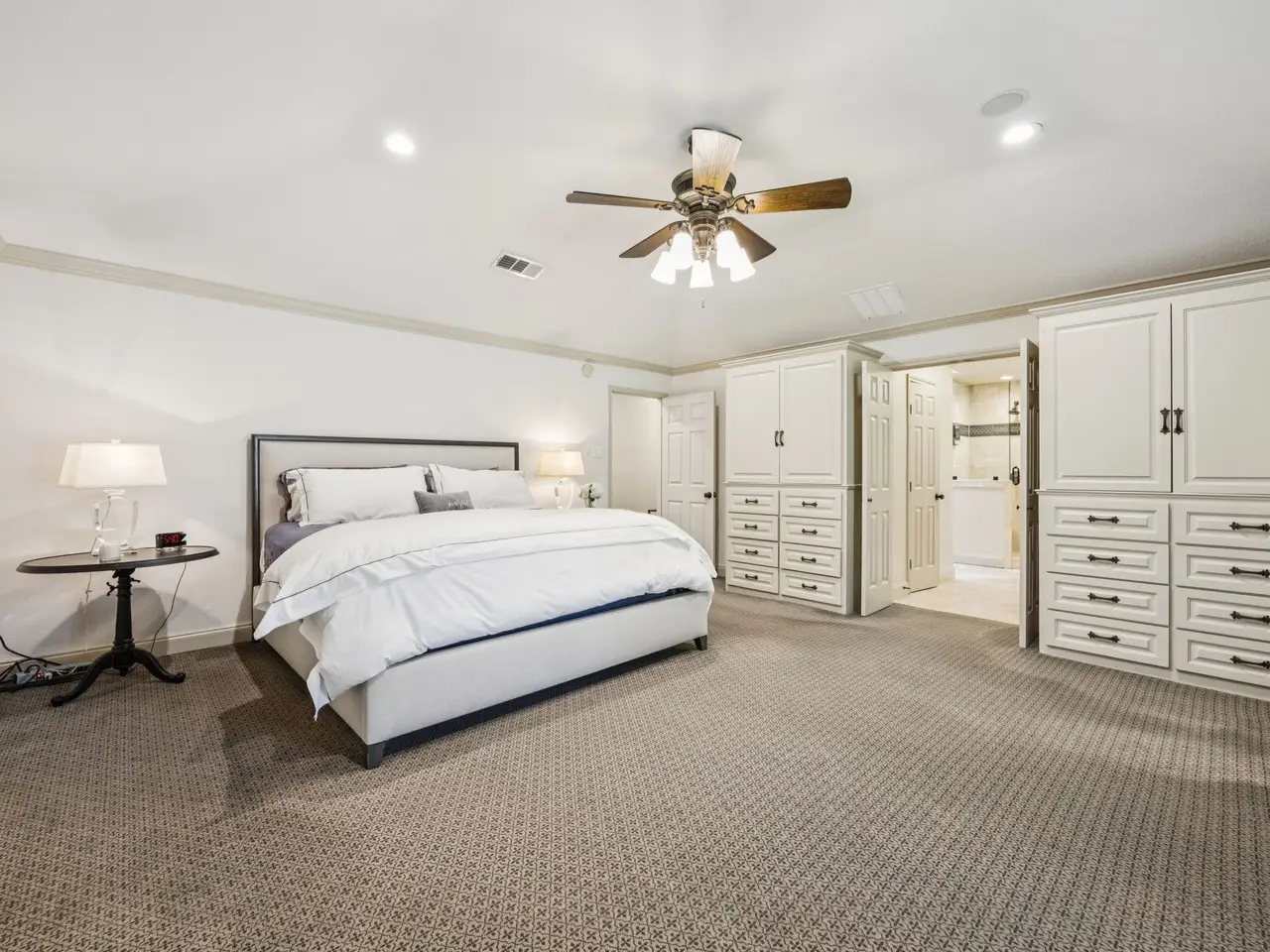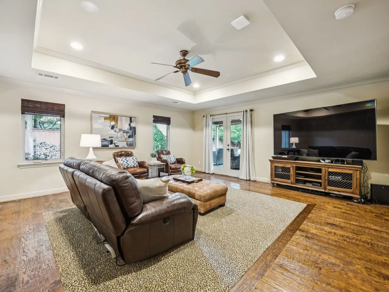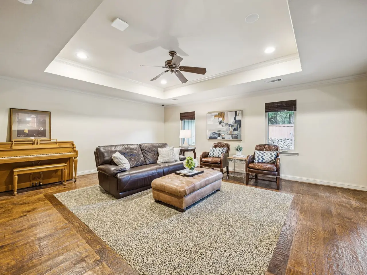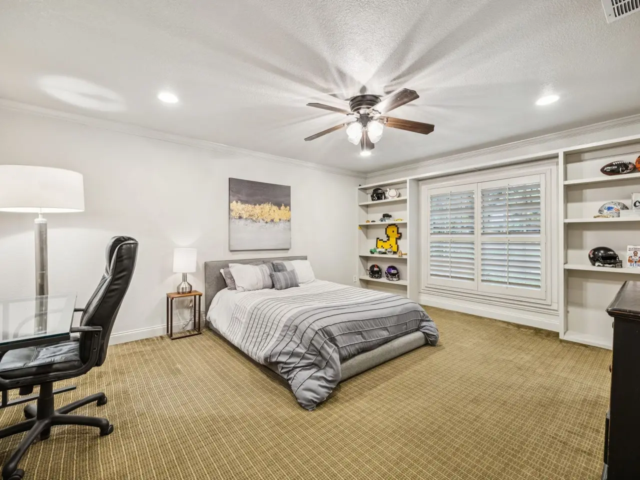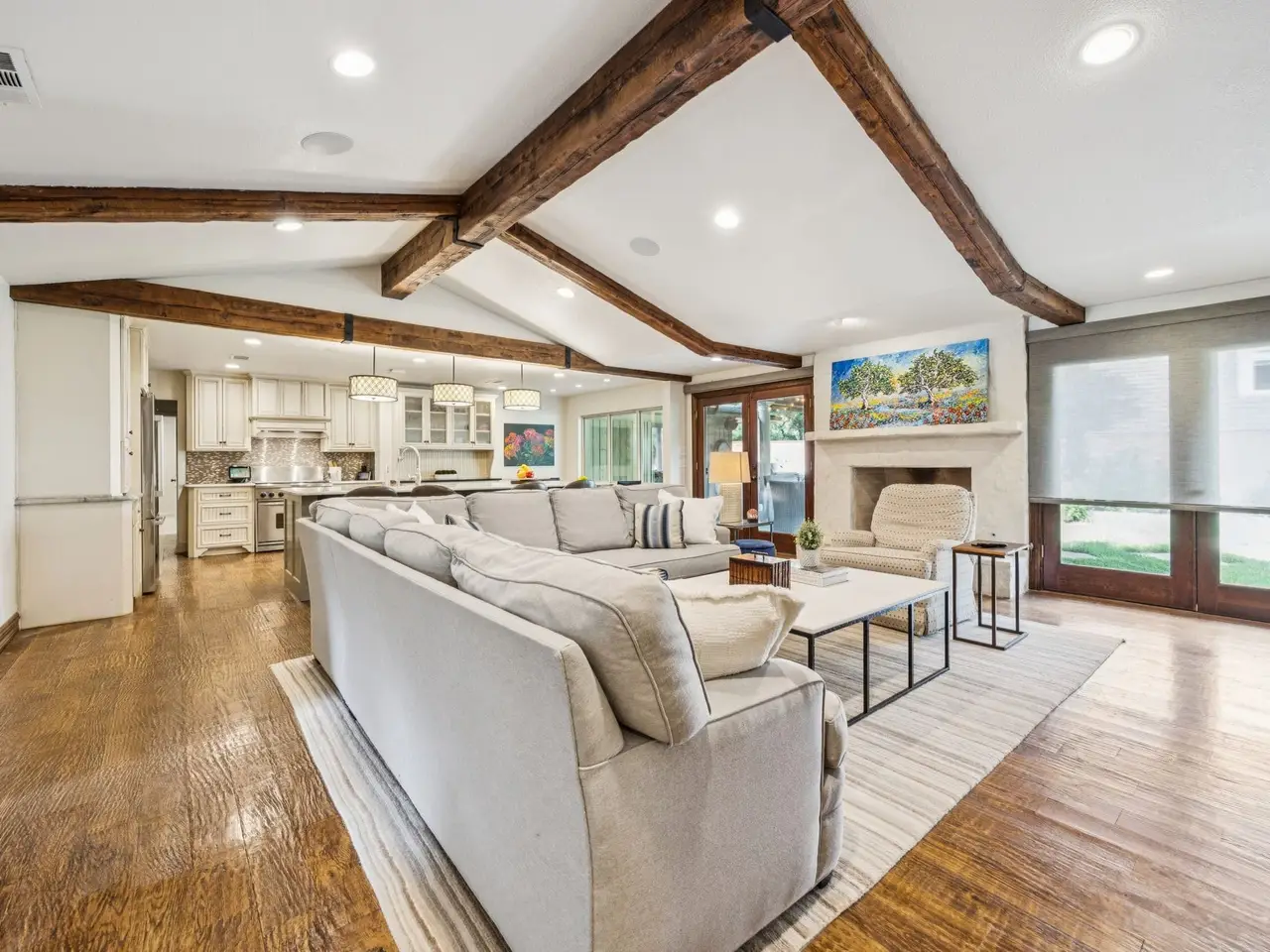 Discover timeless elegance and everyday comfort in this beautifully updated single-story ranch home, ideally situated on nearly half an acre in a quiet cul-de-sac in the heart of Preston Hollow's Windsor Park neighborhood. The open-concept layout features a spacious island kitchen and breakfast nook that flow seamlessly into a vaulted living room with wood beam accents and a gas log fireplace. A private office and formal dining room offer flexible spaces for work or entertaining, while a thoughtful split floor plan provides exceptional privacy. The expansive primary suite includes dual walk-in closets and additional wardrobe storage, with two guest bedrooms nearby. A separate guest suite and a private game room, easily used as a fifth bedroom, adds versatility. Practical highlights include an oversized mudroom, abundant storage, and a oversized two-car garage. The lush backyard retreat is perfect for relaxing or entertaining, with a sparkling pool, covered patio with fireplace, and a full guest house complete with kitchen, bathroom, and Murphy bed.