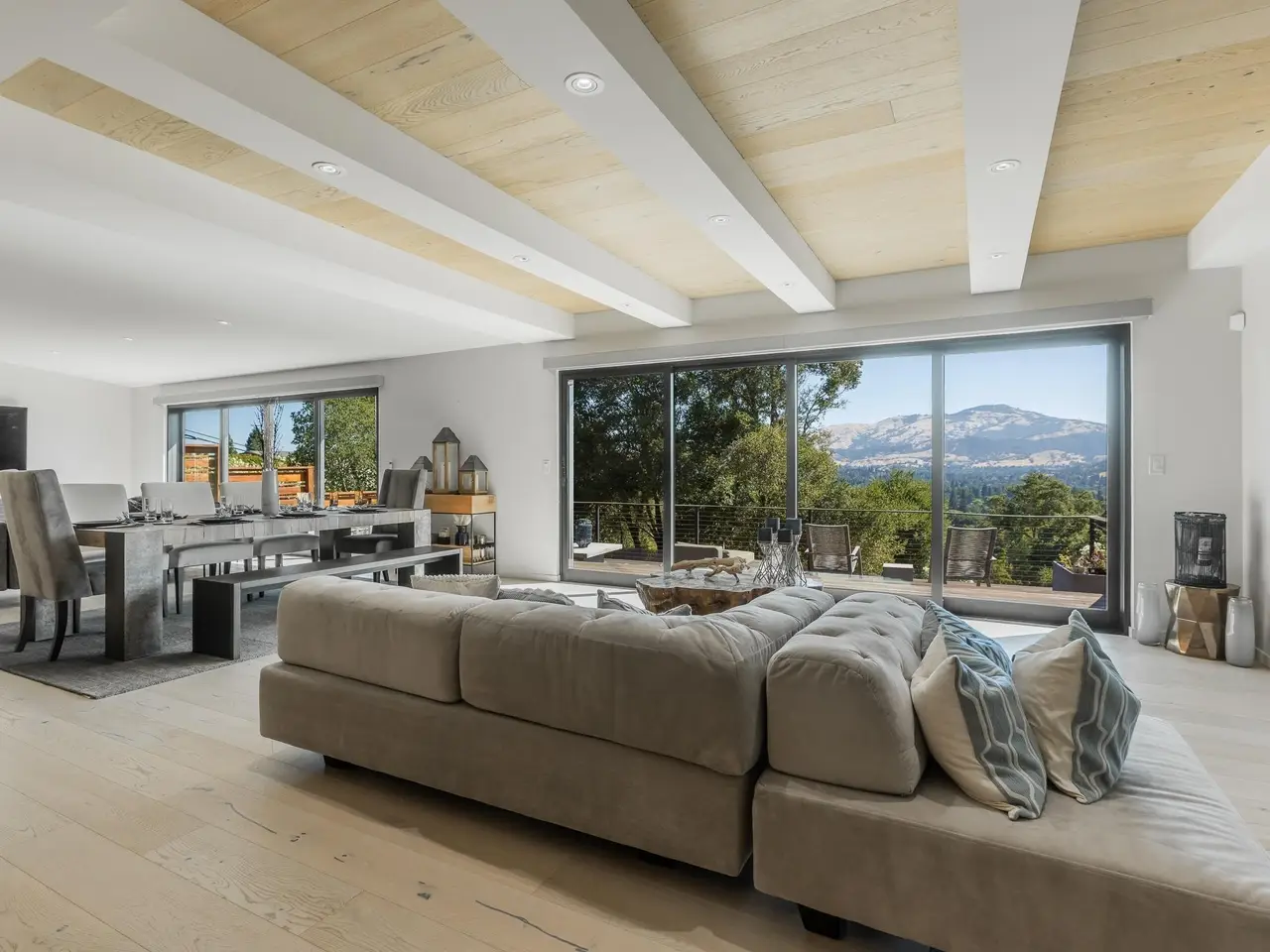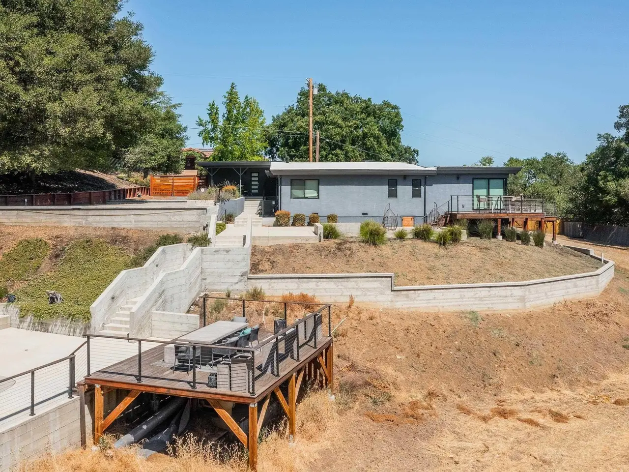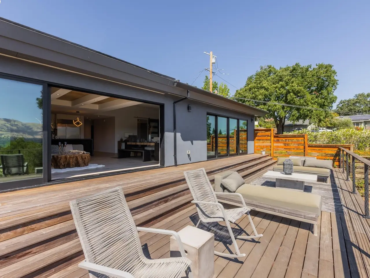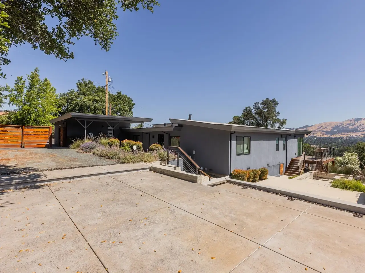 Experience elevated living in this stunning, fully rebuilt modern home on Danville’s coveted Westside. Located in the exclusive Sky Terrace community, this rare 1.4+ acre property offers panoramic views of Mount Diablo and seamless indoor-outdoor living through La Cantina doors that open to a spacious deck. The open-concept floor plan features high-end modern finishes throughout, including wide-plank hardwood flooring, marble tile bathrooms, sleek Euro-style cabinetry, and natural Quartzite countertops with a waterfall island and glass-beveled backsplash. A chef’s kitchen showcases top-tier appliances, including a premium Sub-Zero refrigerator, 48" professional cooktop with griddle, smart double ovens, and a built-in drawer microwave. The primary suite offers breathtaking views and direct access to the deck. One of the four bedrooms has been transformed into a custom walk-in closet by Valet Cabinets, perfect for a fashion-forward lifestyle. All bedrooms, including the luxurious primary suite, are conveniently located off a single hallway for ideal flow and functionality. Step outside to a fully hardscaped backyard oasis complete with an infinity-edge pool, custom outdoor furnishings from Terra (most included in sale), and multiple gathering spaces designed for both !