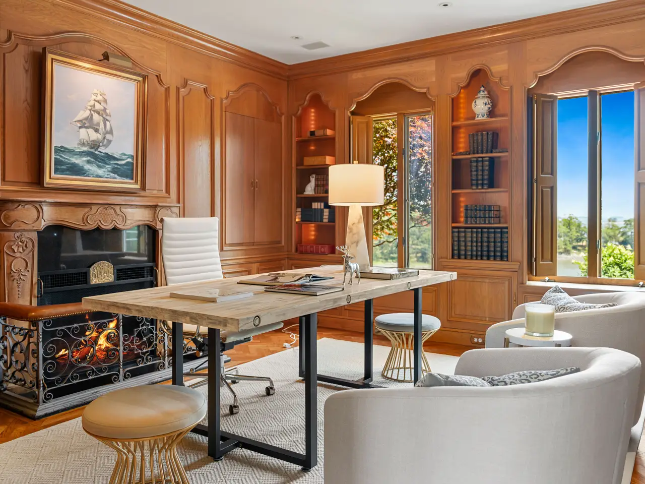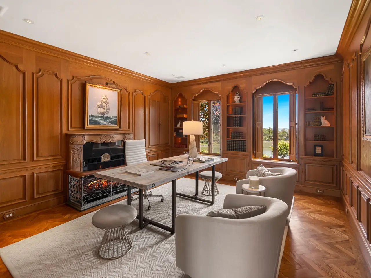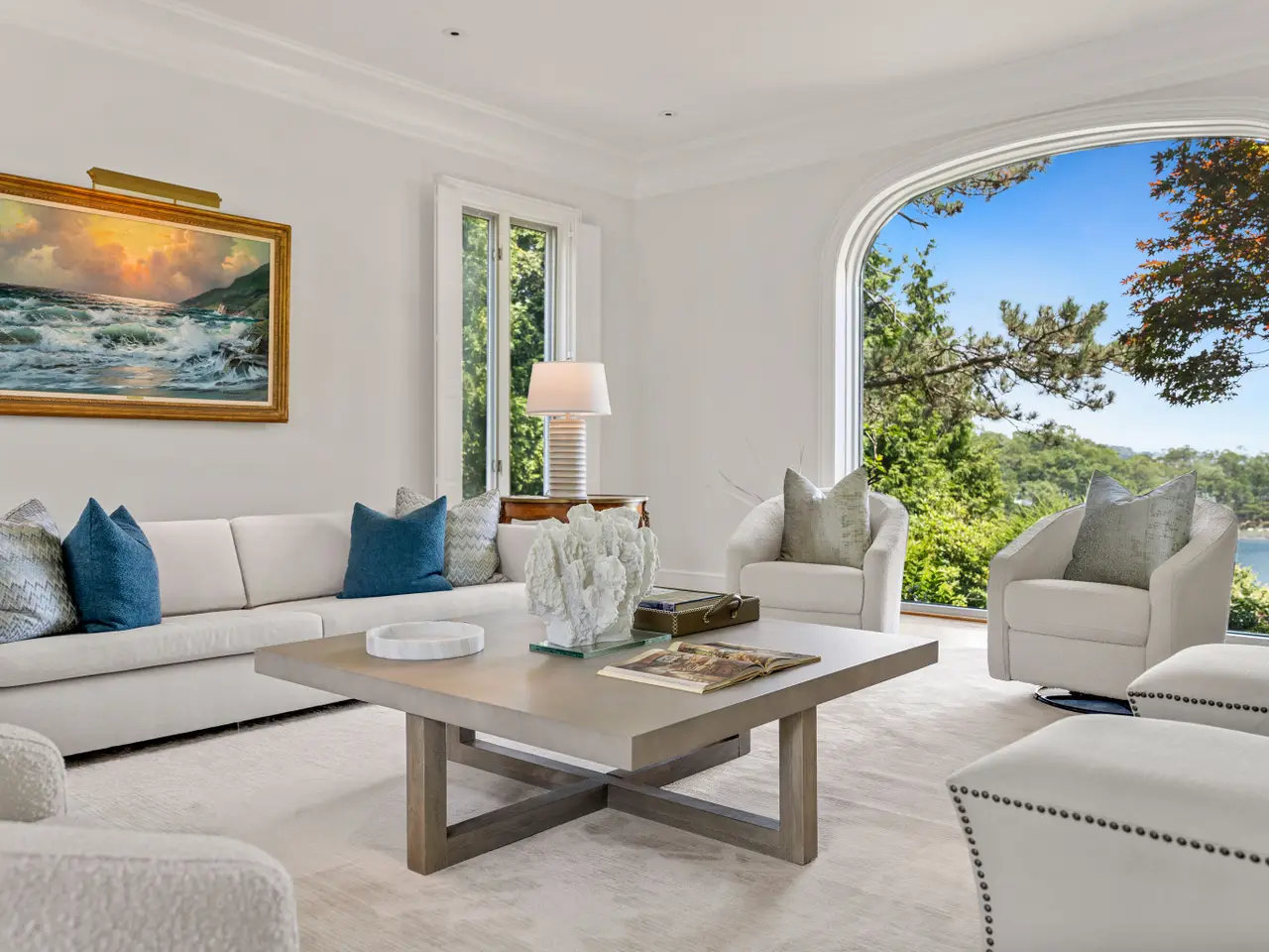 Perched high on the bluff of Long Neck Point, this 6680sf custom-built brick estate offers you unmatched privacy and panoramic water views, all in this captivating natural environment where land and sea converge in harmony. Set on 1.38 acres with 175 feet of shoreline, the home enjoys 180-degree views over Long Island Sound, with main floor rooms capturing the stunning scenery and the ever-changing water. The home opens with a dramatic marble foyer and circular staircase. Graciously scaled rooms feature 9-foot ceilings, an oversized arched window and sliding glass door walls that flood the interiors with light. A long flat backyard, with a 20 X 40 ft concrete pool, slopes gently toward the water, leading to a private dock. The home offers five bedrooms, a luxurious primary suite with its own wing, dual bathrooms and two large walk-in closets. Indoor 38x6 ft lap pool in a separate glass room with sliders to the garden and sea. Separate in-law apartment has a private entrance, kitchen, and sitting room. The lower level has a great room with fireplace, home office with built ins, gym, and a newly renovated pool bathroom and dressing room. Three-car garage, a new slate-style DaVinci roof, new furnace, new A/C units, 45 Viking cooktop, new oil tanks, full property landscaping and a partially finished attic with cedar closet. This is a rare opportunity to own a truly special waterfront home where every detail was thoughtfully designed to elevate daily living.