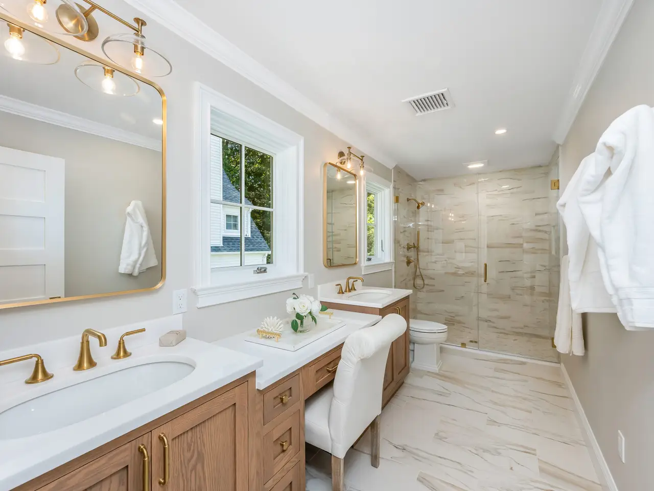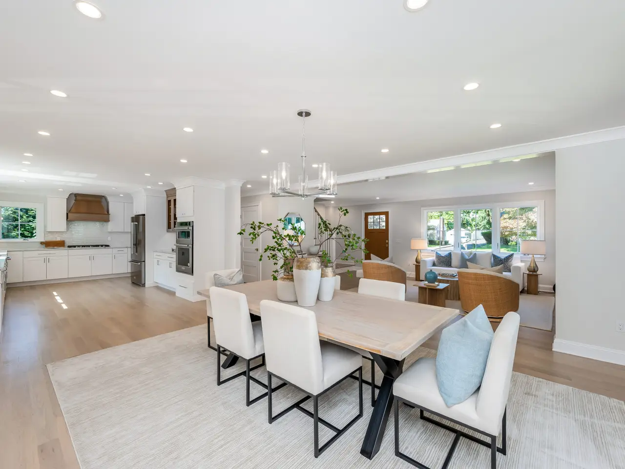 This newly re-built 4-bedroom, 3-bath Colonial offers 2400 sq feet of finely crafted living space on a level .25-acre lot. Set on the corner of Anthony Lane and a cul-de-sac, the property pairs neighborhood charm with privacy. Enjoy the outdoors in a newly fenced yard with professional landscaping and a full irrigation system. Inside, the open layout is defined by natural light and superior craftsmanship. White oak floors run throughout the home, complemented by custom millwork and oversized windows. The living room's fireplace, framed by built-in cabinetry, provides both warmth and architectural interest.The chef's kitchen impresses with custom cabinetry, quartz countertops, and high-performance energy-efficient appliances. A large mudroom with integrated laundry is designed for durability and organization. A first-floor bedroom offers versatility as an office, guest suite, den or playroom. The full bath is finished with frameless glass shower ensuring comfort and style. Upstairs, three bedrooms feature ample closets and abundant light. The hall bath includes a glass-enclosed tub/shower, dual windows, heated floor. The primary suite features two large closets and bath highlighted by a walk-in shower, heated floors, double sink vanity and polished finishes. With zoned propane heating, central air, and a balance of classic proportions and modern amenities this home combines elegance and functionality less than one mile to shops, dining and transportation of Noroton Heights.