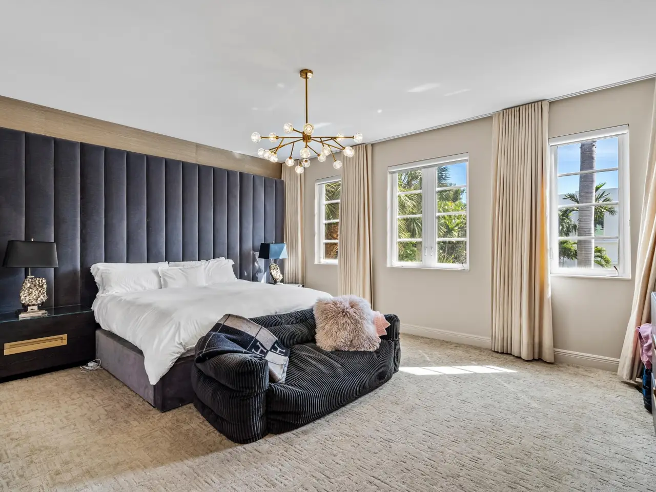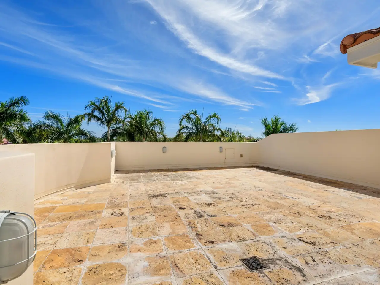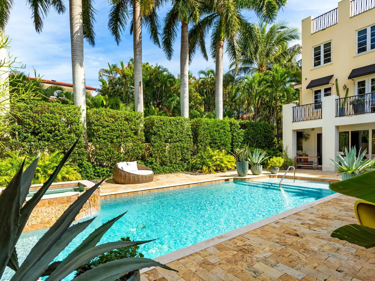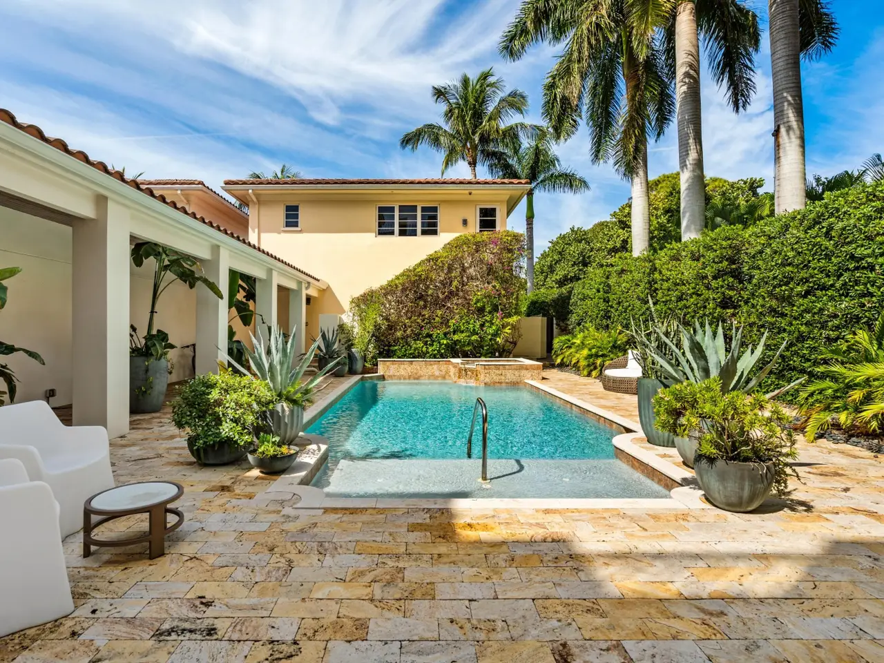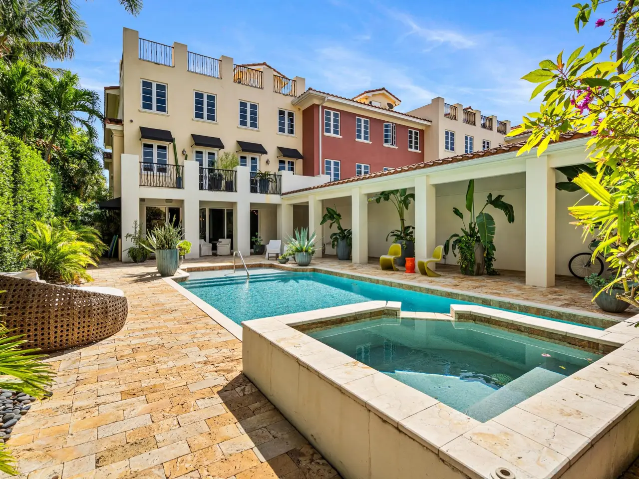 Palm Trail, Delray Beach, Florida. On tree-lined Palm Trail, across from the Intracoastal Waterway's shore, this is one of just six courtyard townhomes in an exclusive enclave offering resort-style living close to the beach, minutes from famous Atlantic Avenue's bistros and boutiques. Going beyond every expectation, this luxury townhome is an exquisite showplace by Leighton Design Group. Casual elegance is expressed with sophisticated modern ease in select finishes and bespoke elements that come together in a calm neutral palette with a textural look and touches of subtle glamour. Creating an estate-like environment in the Mediterranean-inspired architectural design, this light-filled end-position townhome opens to loggias around the private, tropically landscaped courtyard.