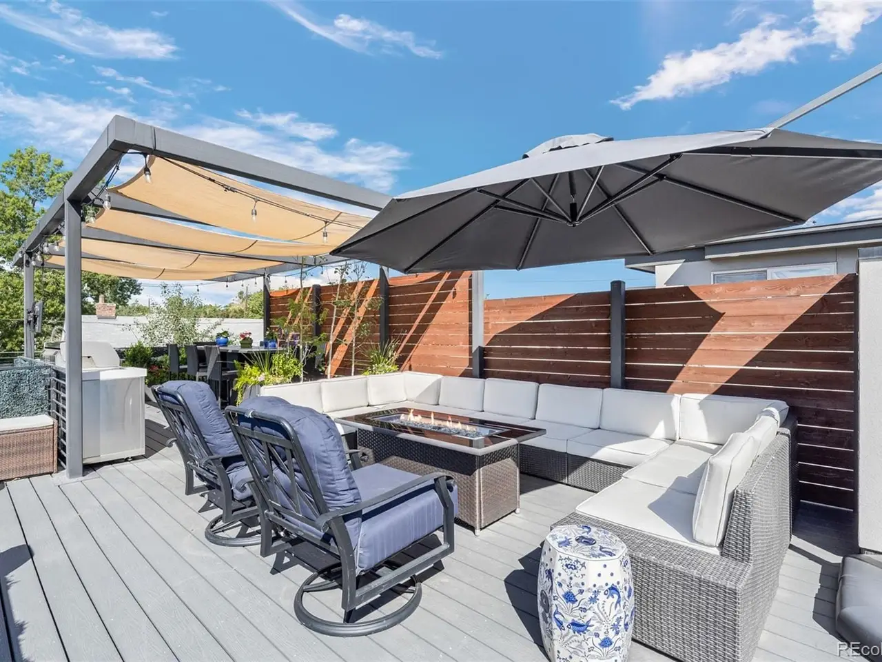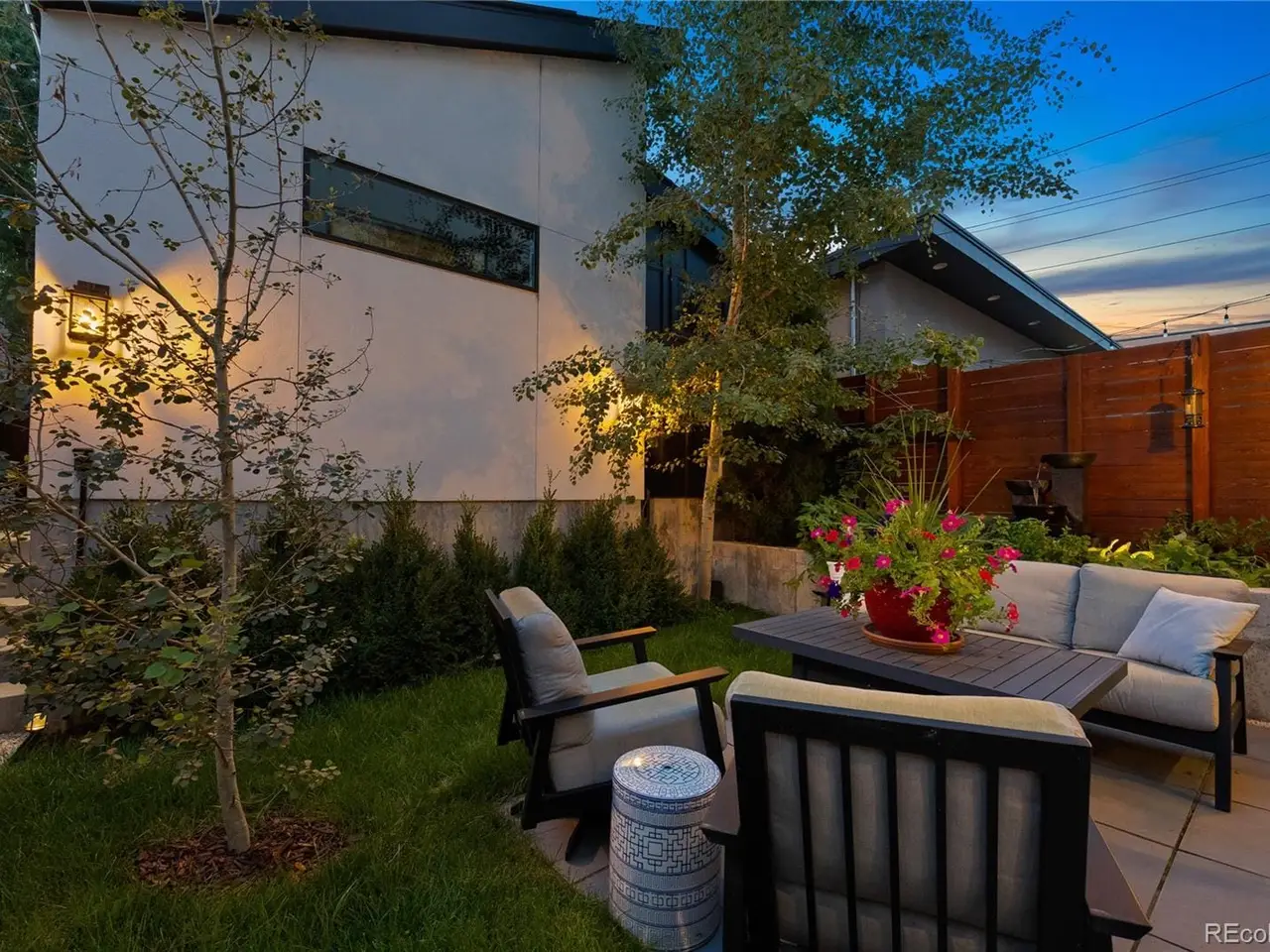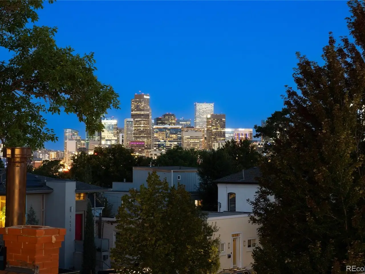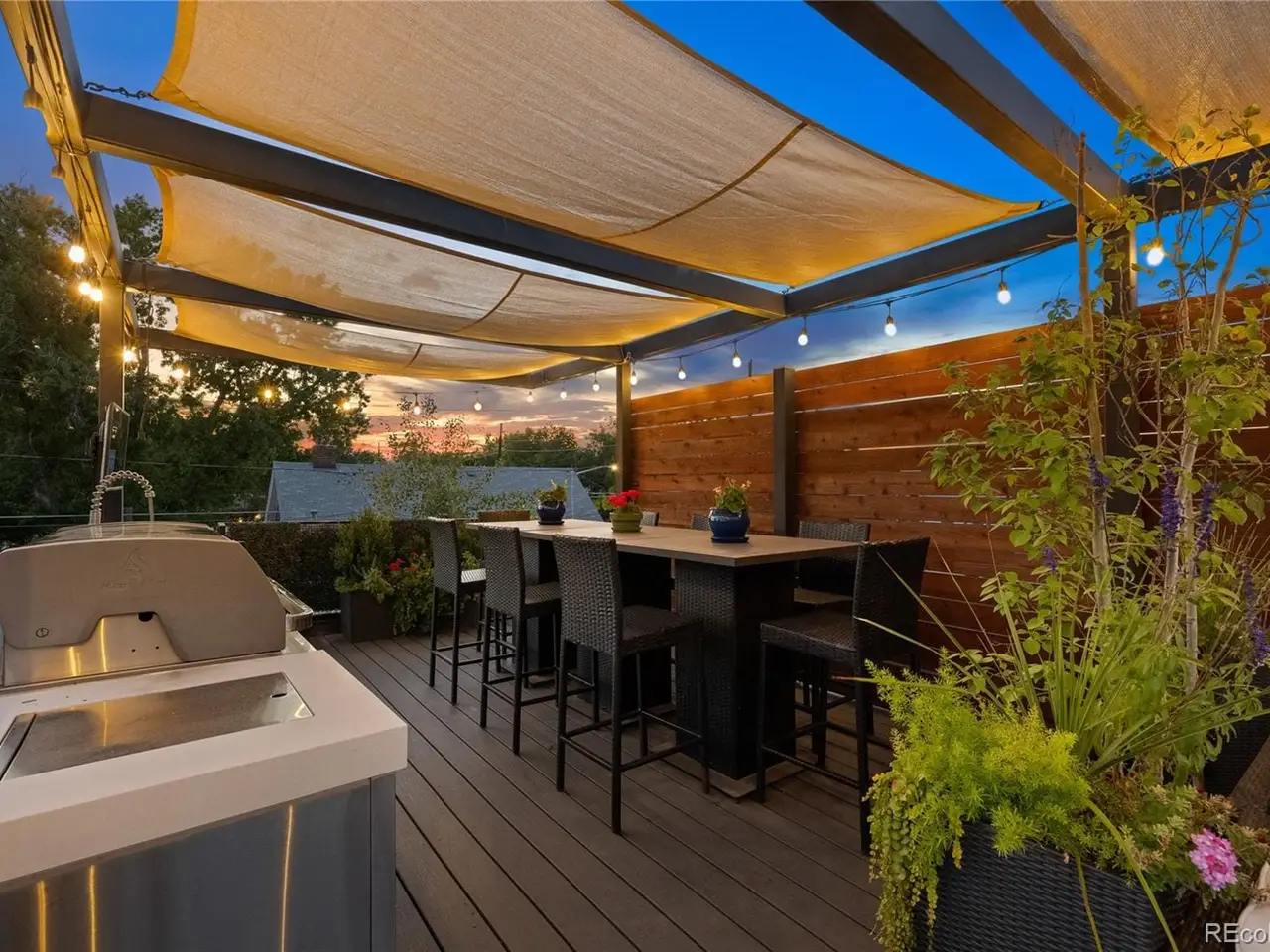 Tucked into one of Denvers most coveted neighborhoods, this home is a rare retreat that blends privacy, sophistication, and accessibility. Built in 2020, this five-bedroom, four-bathroom home spans more than 3,200 square feet of refined living space, offering both tranquility and the vibrancy of LoHi just beyond the front door. The main floor showcases an ideal layout with effortless flow between living, dining, and entertaining spaces. At its center, a chefs kitchen boasts an oversized quartz island, professional-grade appliances, and designer lighting. The living room, anchored by a sleek gas fireplace, opens through sliding glass doors to a lush backyard with mature trees, water feature, and stone patio perfect for quiet evenings or lively gatherings. A main-level bedroom or office with full bath provides flexibility. Upstairs, the primary suite is a private sanctuary, complete with vaulted ceilings, a sunlit terrace amongst the trees, and spa-inspired bath featuring dual vanities, soaking tub, and walk-in shower. A boutique-style custom closet elevates the retreat, while two additional bedrooms, a full bath, and laundry complete the upper level. The expansive rooftop deck redefines outdoor entertaining with a kitchenette, six-burner gas grill, hot tub, and over 800 sq ft of space. Dine under custom shade sails, watch the city lights from the lounge and fire pit, or unwind in the hot tub with sweeping Denver skyline views. The finished basement extends the lifestyle experience with a theater, rec room, full bathroom, and bedroom currently curated as a fitness space. A detached two-car garage provides storage and convenience. The roof of the garage also features a 6.2kW solar system that is fully owned and saves drastically on energy costs. Balancing serenity with city living, this Highlands residence is a lush, private oasis just minutes from Denver's acclaimed dining, shopping, and nightlife.