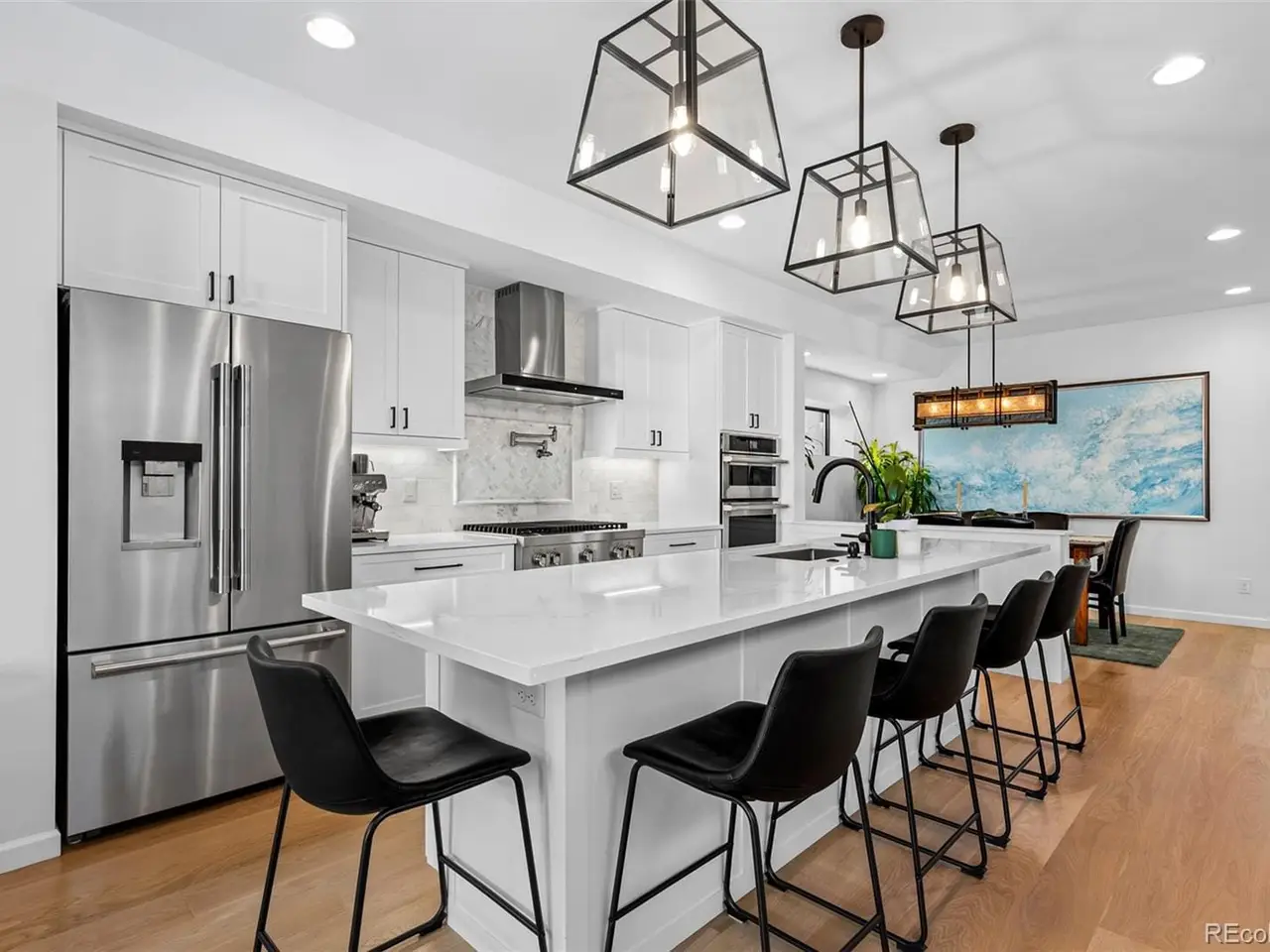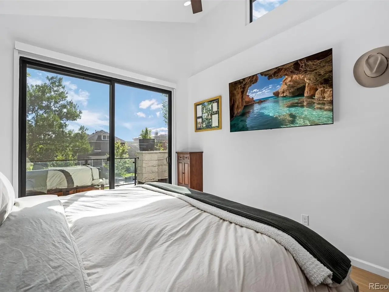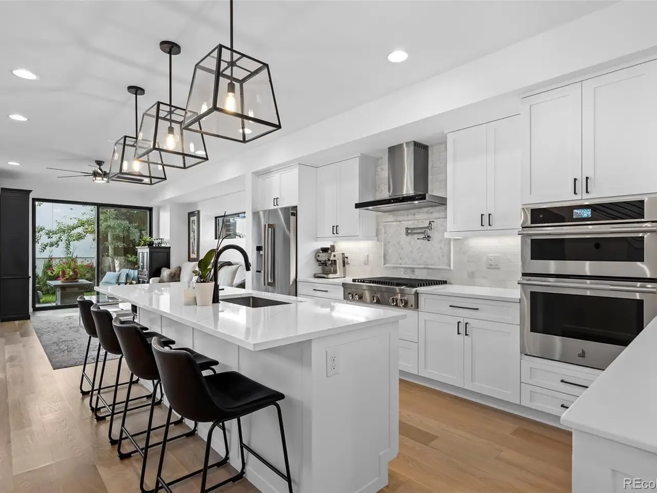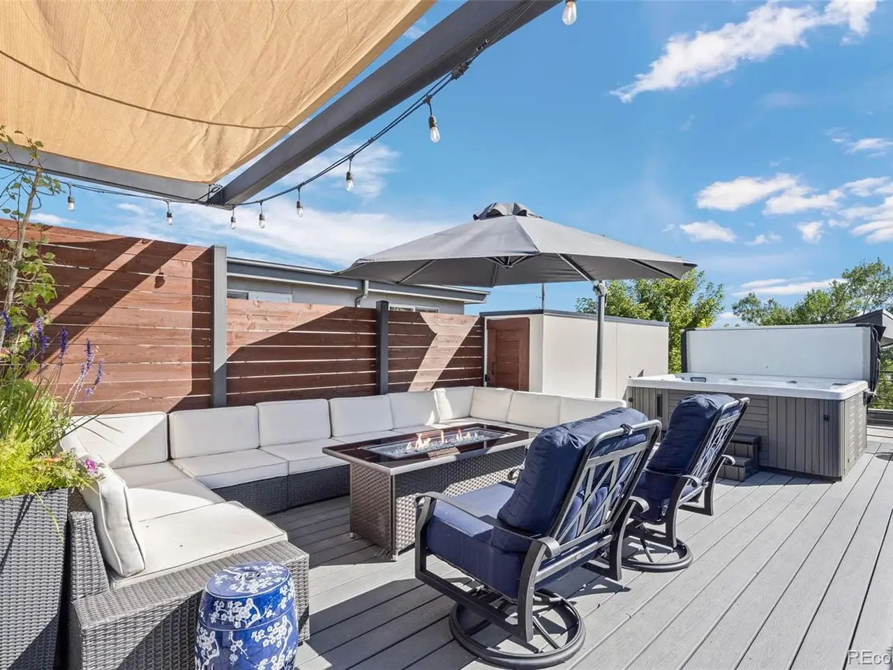 Tucked into one of Denvers most coveted neighborhoods, this home is a rare retreat that blends privacy, sophistication, and accessibility. Built in 2020, this five-bedroom, four-bathroom home spans more than 3,200 square feet of refined living space, offering both tranquility and the vibrancy of LoHi just beyond the front door. The main floor showcases an ideal layout with effortless flow between living, dining, and entertaining spaces. At its center, a chefs kitchen boasts an oversized quartz island, professional-grade appliances, and designer lighting. The living room, anchored by a sleek gas fireplace, opens through sliding glass doors to a lush backyard with mature trees, water feature, and stone patio perfect for quiet evenings or lively gatherings. A main-level bedroom or office with full bath provides flexibility. Upstairs, the primary suite is a private sanctuary, complete with vaulted ceilings, a sunlit terrace amongst the trees, and spa-inspired bath featuring dual vanities, soaking tub, and walk-in shower. A boutique-style custom closet elevates the retreat, while two additional bedrooms, a full bath, and laundry complete the upper level. The expansive rooftop deck redefines outdoor entertaining with a kitchenette, six-burner gas grill, hot tub, and over 800 sq ft of space. Dine under custom shade sails, watch the city lights from the lounge and fire pit, or unwind in the hot tub with sweeping Denver skyline views. The finished basement extends the lifestyle experience with a theater, rec room, full bathroom, and bedroom currently curated as a fitness space. A detached two-car garage provides storage and convenience. The roof of the garage also features a 6.2kW solar system that is fully owned and saves drastically on energy costs. Balancing serenity with city living, this Highlands residence is a lush, private oasis just minutes from Denver's acclaimed dining, shopping, and nightlife.