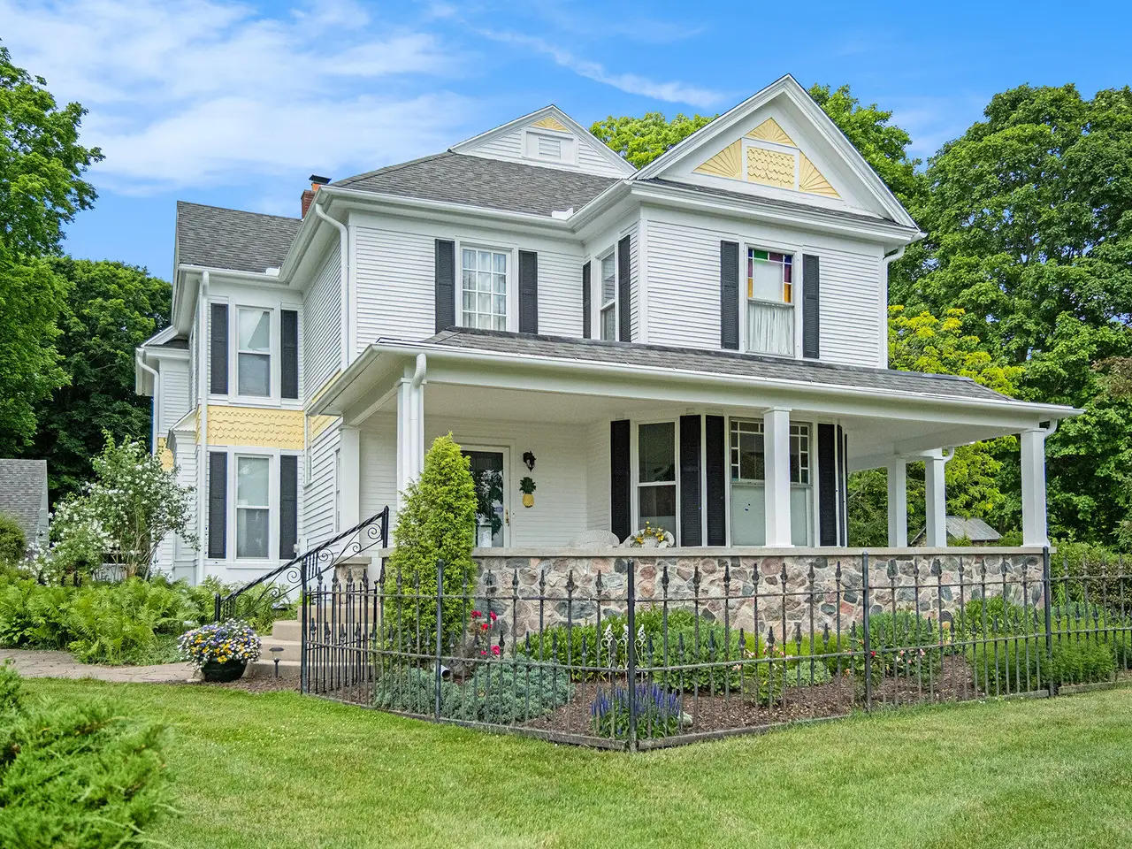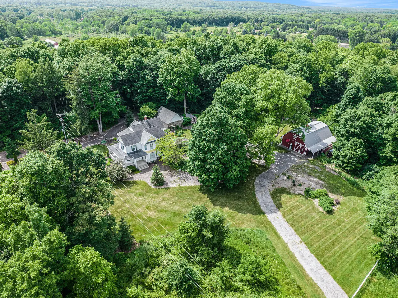 ''Sugar Maple Ridge'': Historical charm blends graciously with new-age comfort and quality in this classic Victorian home on gated 5 acres. *Minutes from Ann Arbor and Brighton and moments to Dexter. *Natural stone wraparound porch. *Spacious foyer with oversized case and base featuring elegant stairwell. *Light-filled living and dining rooms with coved detail. *Beautifully updated kitchen with copper sink, stainless appliances, and custom walnut counters opening onto family room/office with cozy gas fireplace. *Upstairs featuring 4 spacious bedrooms, 2 of which with original pine plank floors revealed, and 2 updated full baths with laundry. *Screen porch opening onto brick patio in secluded fenced back yard with garden house.*Stone 3 car garage. *2800 sq. ft. heated 5 car garage/workshop barn with studio apartment. *Fully restored stone outbuilding with half bath. Exterior completely repainted spring 2025.