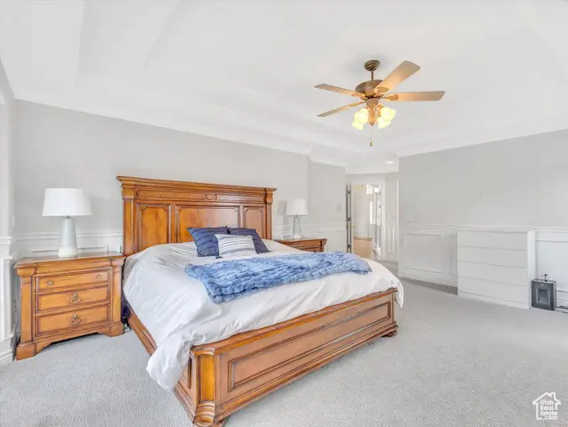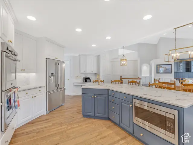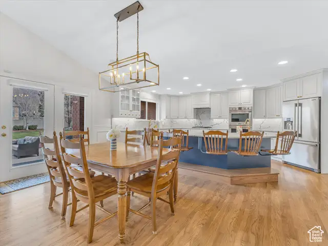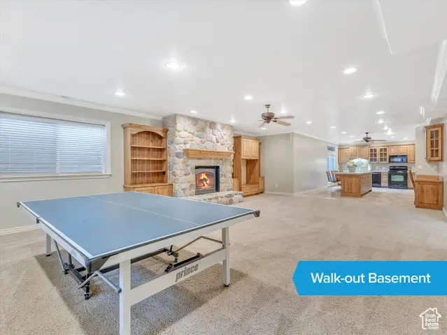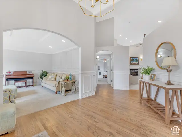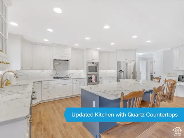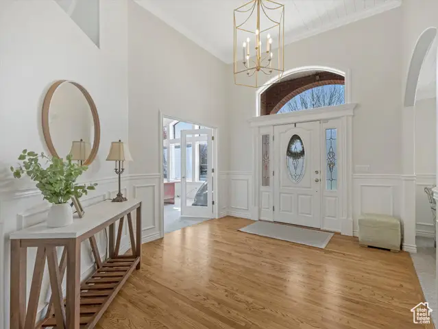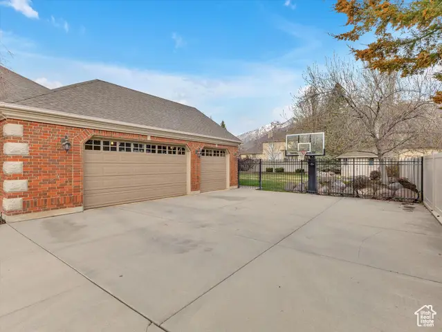 Don't miss this spectacular luxury residence! Situated on a stunning .46-acre estate in one of Draper's most sought-after neighborhoods, this exceptional property offers sweeping mountain views and a central location that strikes the perfect balance between Salt Lake City and Utah Valley. With easy access to top-rated schools, including Corner Canyon High School, as well as premier shopping, dining, and world-class ski resorts, this estate is ideally positioned to enjoy the best of both worlds. Residents will appreciate the proximity to Draper's renowned parks and trail system, with Willow Creek Trail access from the neighborhood leading to Draper City Park. Upon entering, you are greeted by an inviting foyer featuring a striking brushed gold chandelier and a shiplap-lined ceiling, which sets the tone for the home's sophisticated design. Adjacent to the foyer, the elegant living room offers a serene space to unwind, highlighted by a beautifully coved shiplap-lined ceiling. The main floor is enhanced with quality upgrades, including rich hardwood floors, vaulted ceilings, picture frame wainscoting accents, crown molding, new designer light fixtures, and a convenient central vacuum system. The well-appointed gourmet kitchen is a true centerpiece, with custom white cabinetry, quartz countertops, and a matching quartz backsplash. Equipped with a gas range, stainless steel appliances, a double oven, and a spacious center island with counter seating and a prep sink, it's both functional and stylish. The adjoining dining area offers a charming space for meals, with a walk-out door leading to the covered deck and professionally landscaped yard. The great room is designed for relaxation, featuring a cozy gas fireplace with a custom mantel and a striking shiplap hearth. On the main floor, you'll also find three thoughtfully designed bedrooms, two full bathrooms, a large laundry room with a sink, and a mudroom area. The grand primary suite is a true retreat, boasting a tray ceiling, a bay window, intricate molding, and an expansive walk-in closet. The spa-like primary bathroom offers a jetted tub, a separate shower, a double vanity with sleek quartz countertops, and a private commode room. The finished daylight basement, with 9-foot ceilings, is a versatile space that could easily function as an accessory dwelling unit (ADU). It includes a fully equipped kitchen, two bedrooms, a large recreation room, a full bathroom, and an additional three-quarter bathroom. The basement also features a second fireplace with a stone hearth, as well as a walk-out door to the yard and a private basement entrance connecting to the garage. An added bonus is the charming play nook for children. The property's outdoor spaces are equally impressive, with lush landscaping, raised stone flower beds, mature trees, and landscape lighting that create a serene and picturesque environment. Enjoy mountain views from the beautifully landscaped yard, which also includes a gazebo with lights, a large patio area, and a storage shed. The fully fenced yard has ample space for outdoor activities, with potential room for a pool and a pickleball court. The oversized three-car garage is thoughtfully designed with extra depth, providing plenty of storage space while still offering room for vehicles. This residence provides a truly exceptional living experience in one of Draper's premier neighborhoods.