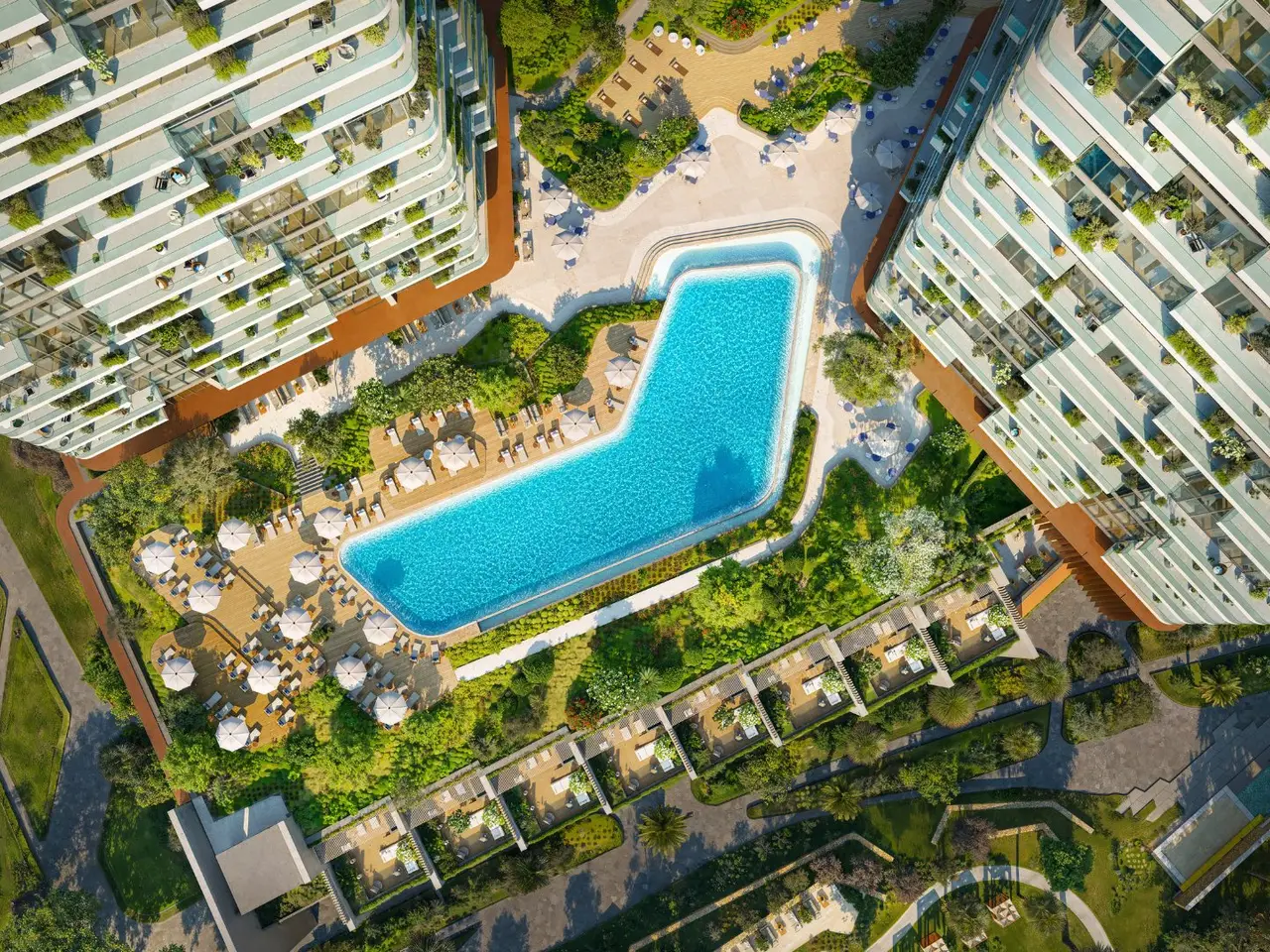 - Landscaped podium gardens, sky lounges, and private cabanas